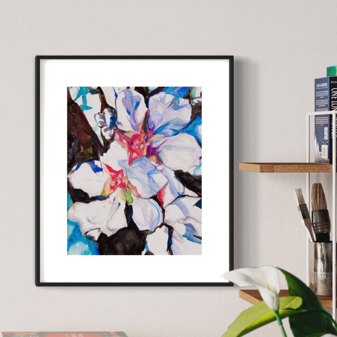Introducing "Abstracted Almond Blossom" - A watercolor and color pencil mixed media print by Leah Luria that captures the essence of fresh white almond blossoms.