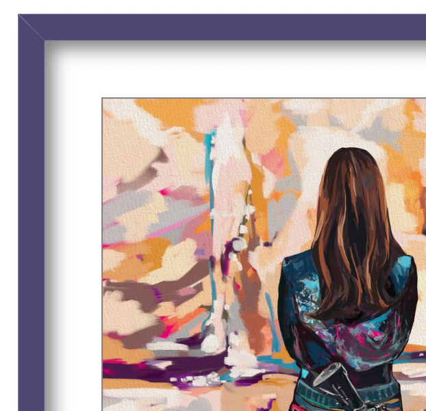 The artwork is printed directly onto the center of acrylic glass and inserted into a contemporary-style frame. To add to the effect of the print floating within the frame, two inches of extra margin are added around the image. The artwork is then printed on the reverse side of the acrylic. This makes it look like the image is suspended in the center behind the glass. Discreet handing hardware is also placed on the back of the frame molding and the final product is ready to hang.