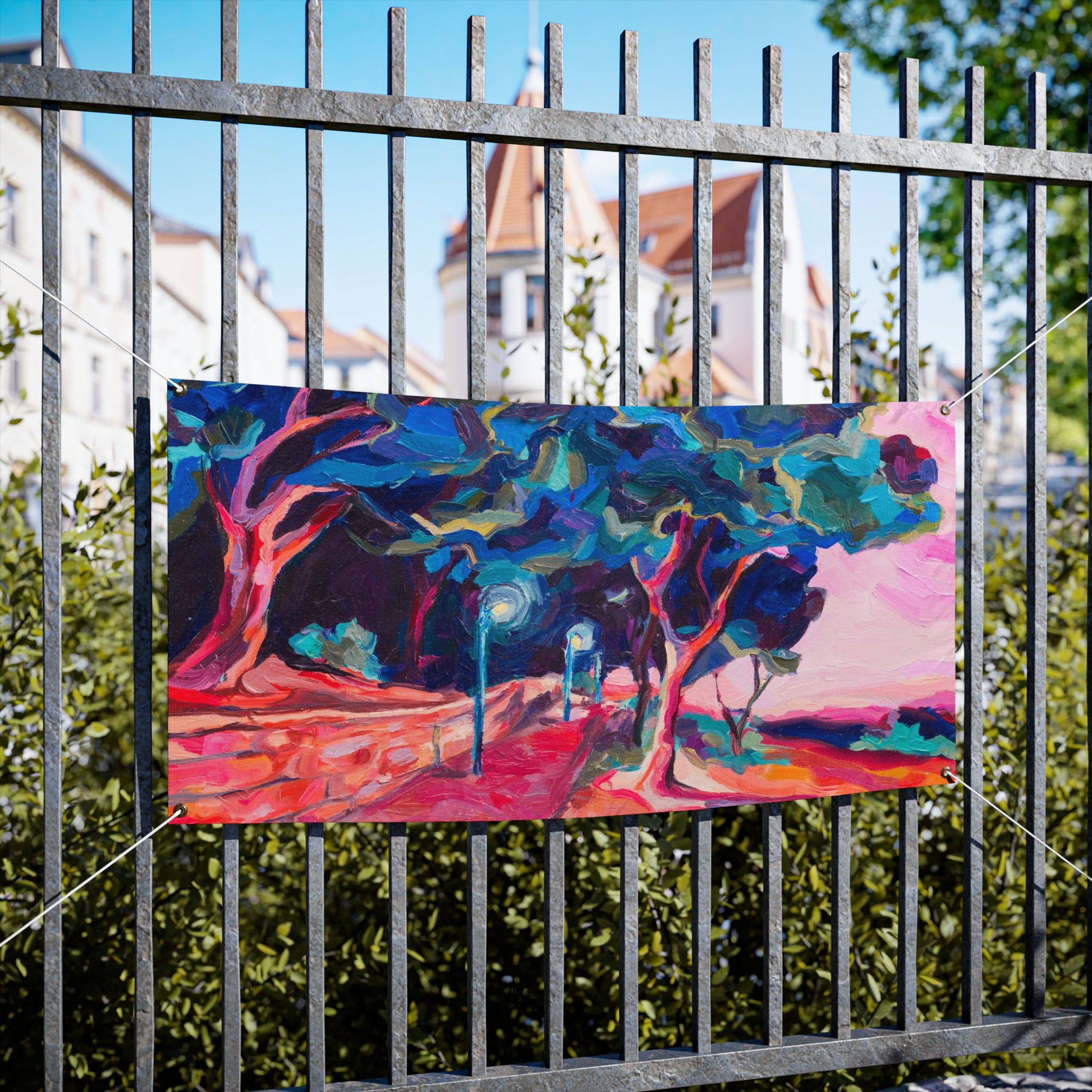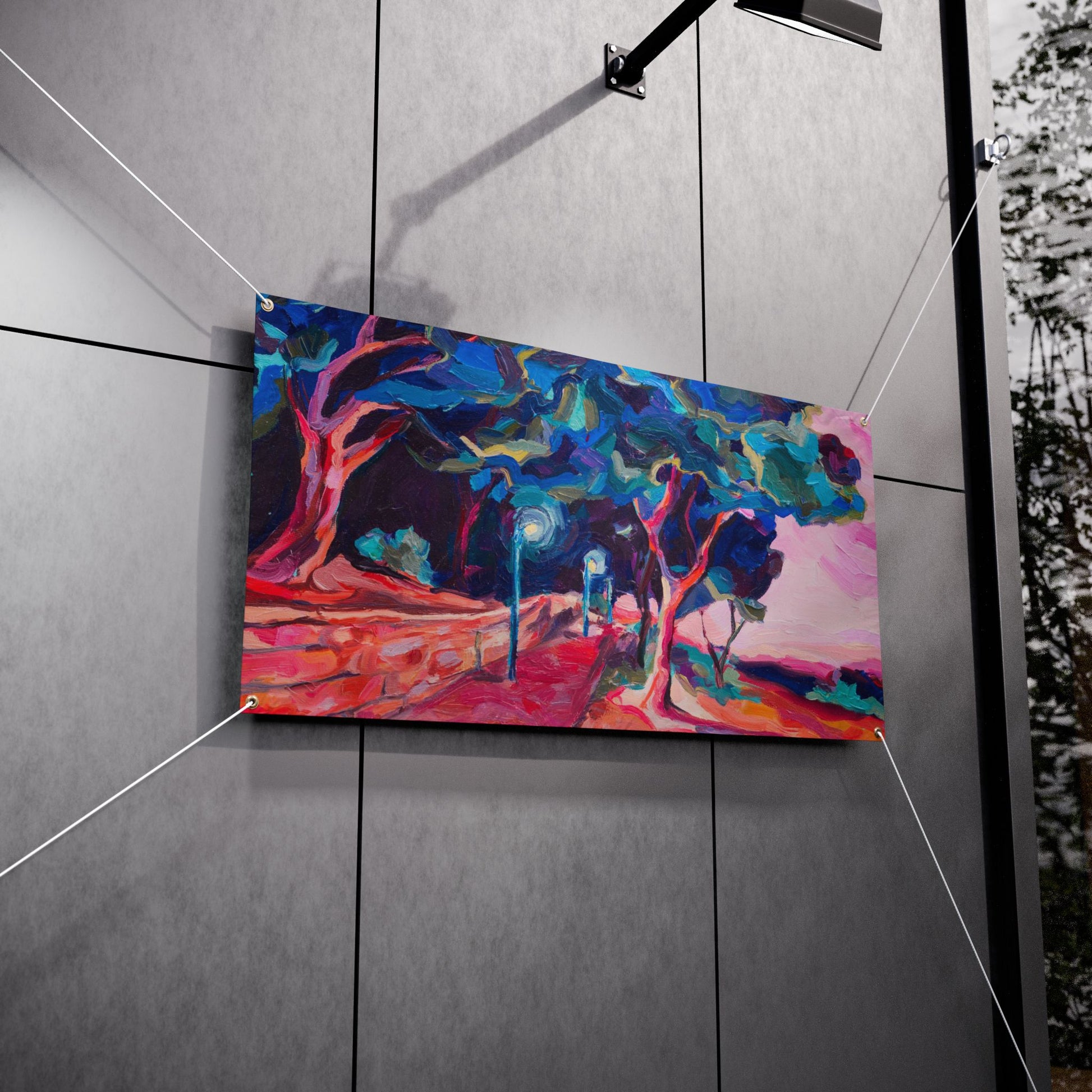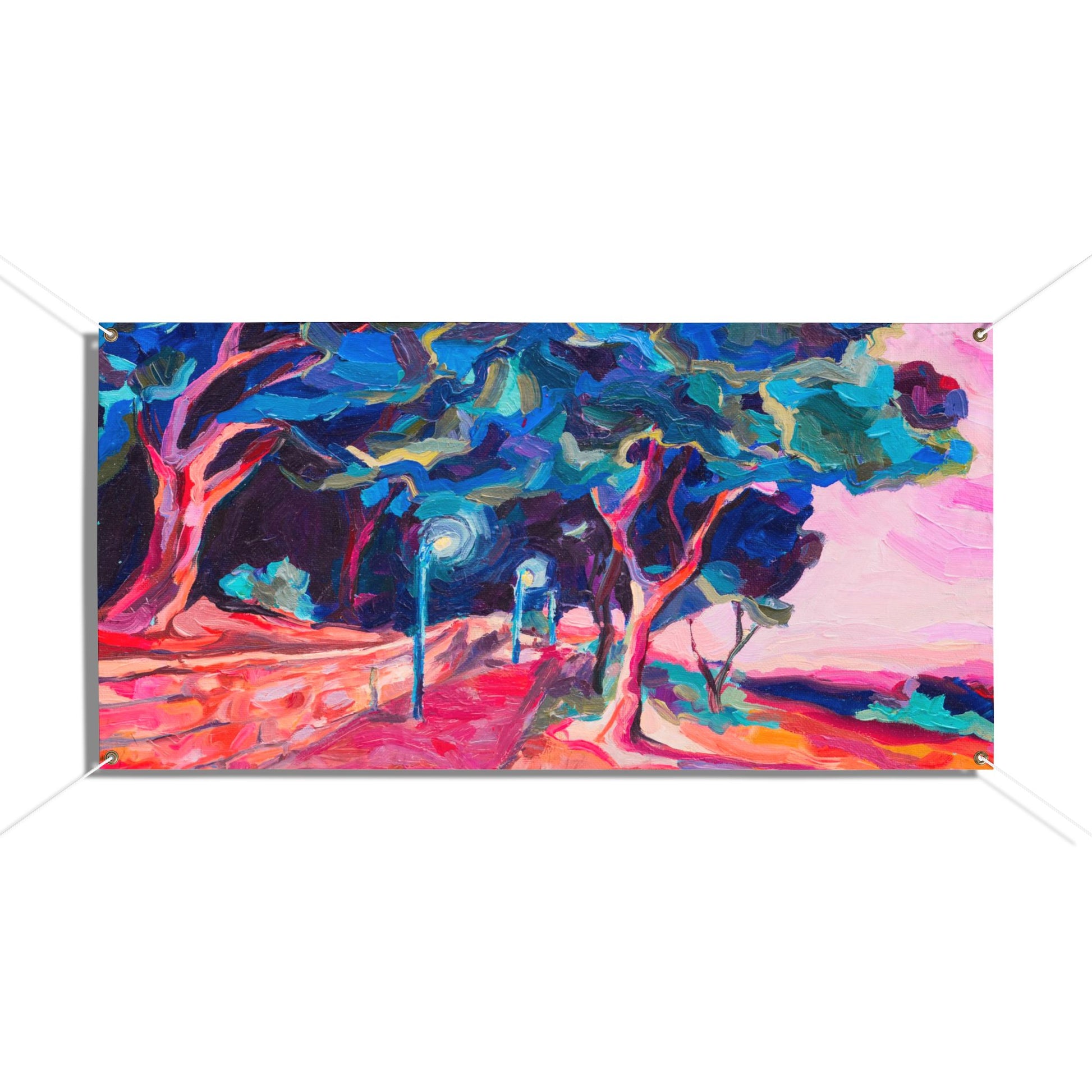 Elevate your sukkah this year with a vibrant waterproof tapestry of Leah Luria's "At Dusk" painting, a stunning landscape that brings the beauty of her favorite walking path, the "Katlav Tayelet" to life. This painting captures the enchanting moment when the colors of dusk begin to cool, casting a moody, blue tint over the landscape. The rich blues are accentuated by the bold addition of reds to the trees, creating a dynamic interplay of complementary colors that seem to pulse with energy.