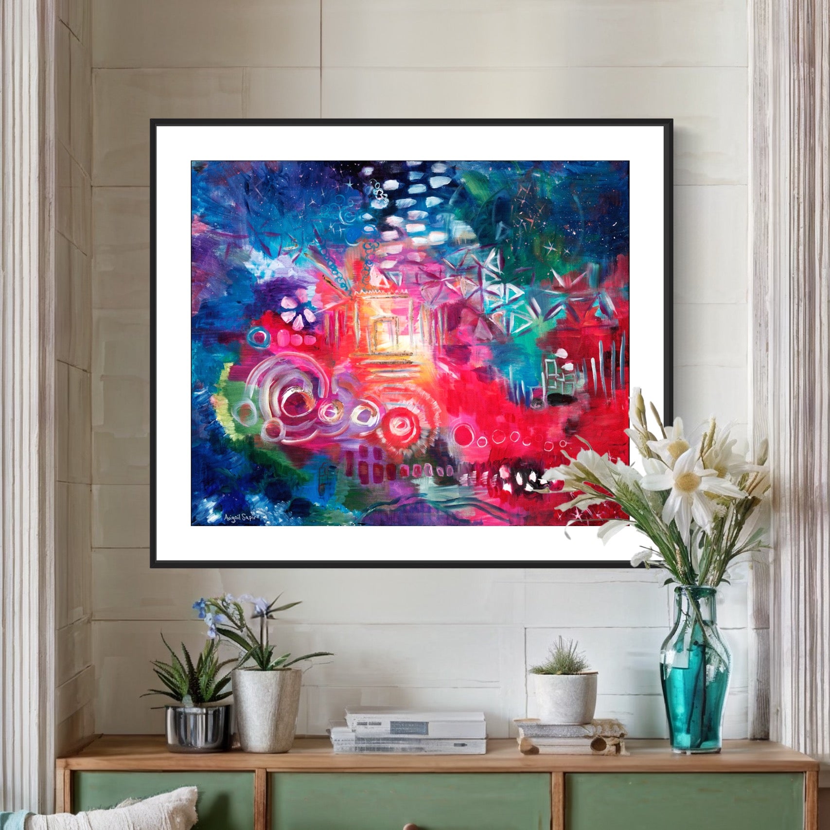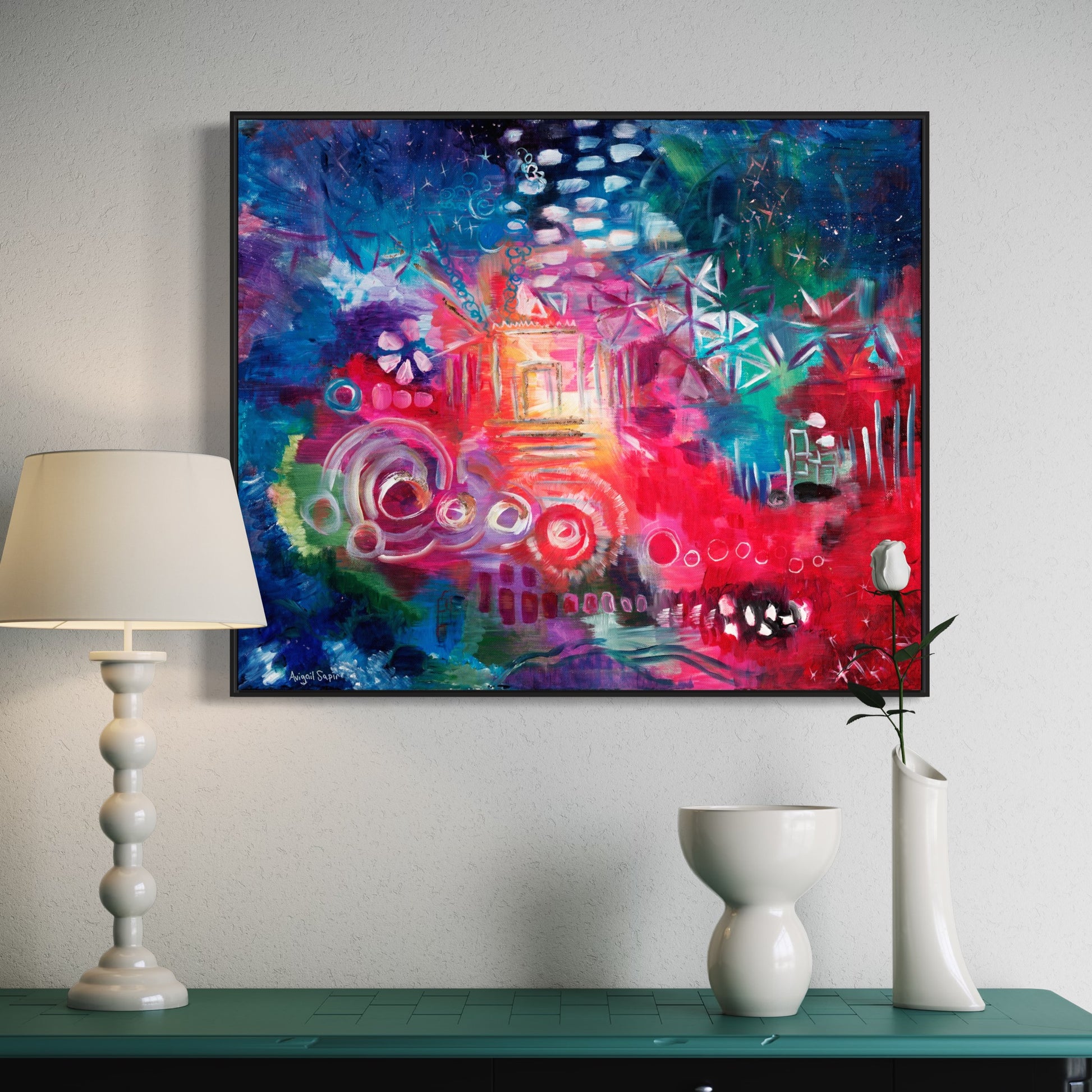 "Awaken the Inner Light" by Avigail Sapir draws you in with vibrant colors and swirling energy. Each brushstroke tells a story of courage, self-discovery, and the power within to face our fears. The piece invites you to dream and visualize the rebuilding of the Third Temple, connecting personal growth with a vision of redemption. It’s a reminder that even a single step can awaken the light inside and guide us toward purpose and hope.