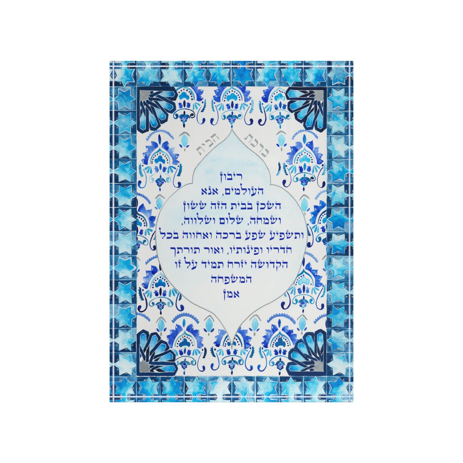 Bring beauty, faith, and serenity into your home with this elegant Birkat Habayit (Home Blessing) art print. Designed in soothing shades of blue and turquoise, this piece is inspired by hand-painted Mediterranean tiles and traditional Middle Eastern patterns. The Hebrew blessing in the center asks for peace, joy, and divine light to fill the home and family.