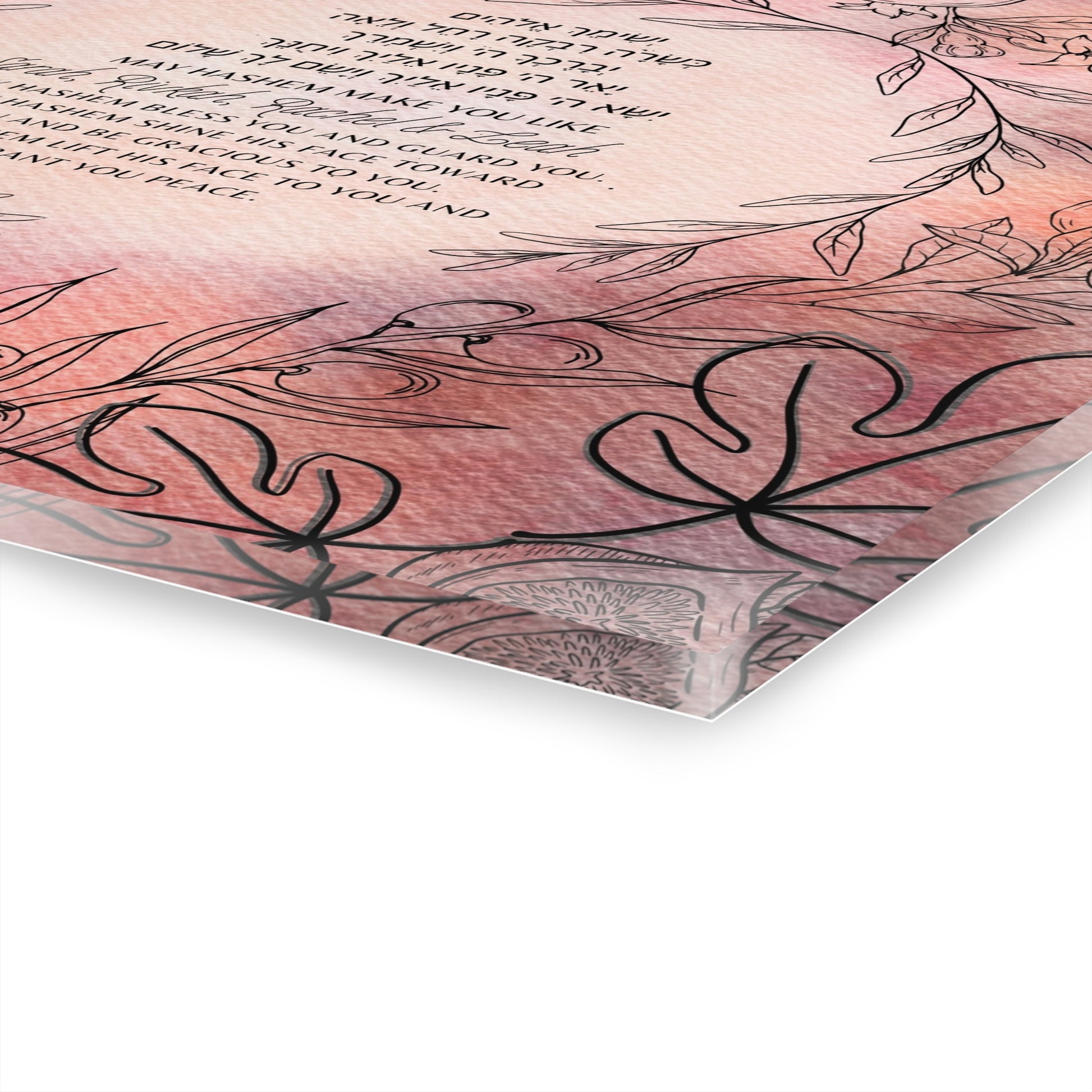 This piece transforms the beautiful Jewish blessing for daughters into a work of art that feels alive with subtle line and color. The background is a lush, rose-toned watercolor design with delicate pomegranates, figs, dates, olives, wheat, grapes and barley.