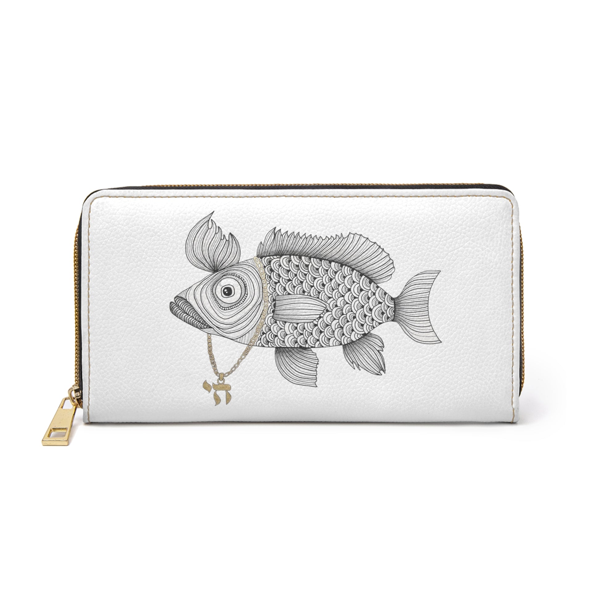 For carrying around all your credit cards, cash, and driver's licenses look no further than this funky Chai Fish zipper wallet. Made with cruelty-free faux leather, this wallet comes packed with utility and style. Add your designs and create a daily staple that is unique and full of character.