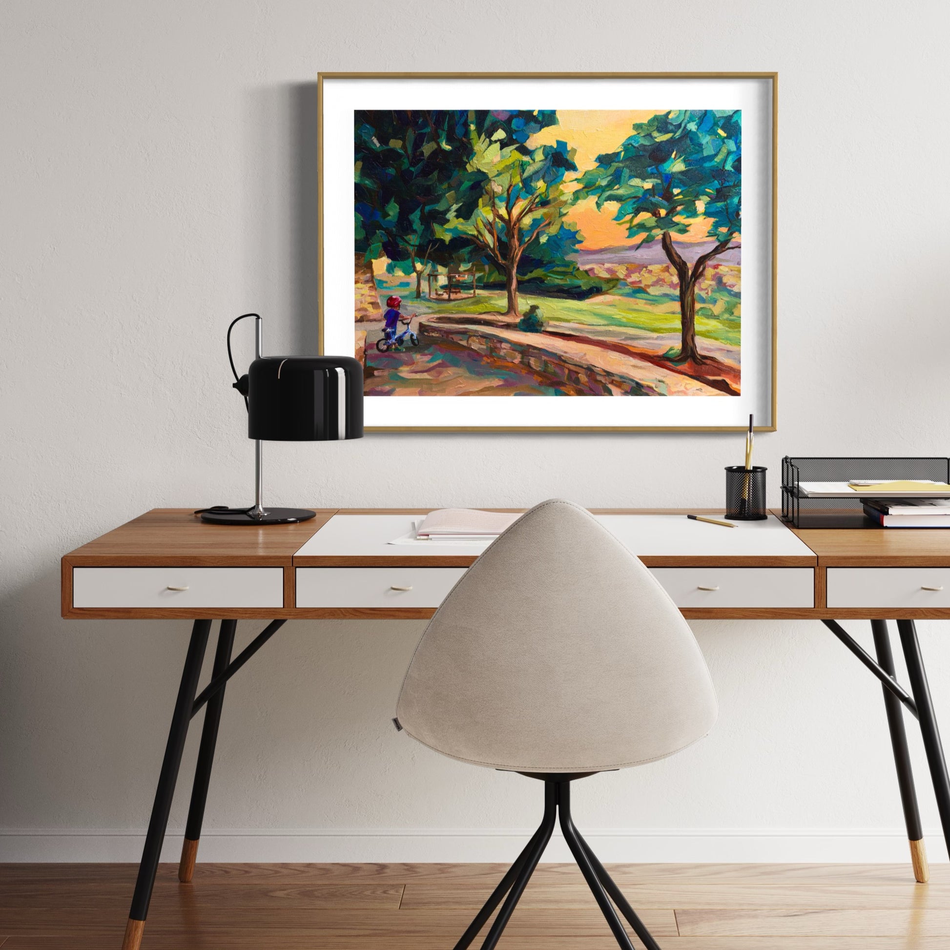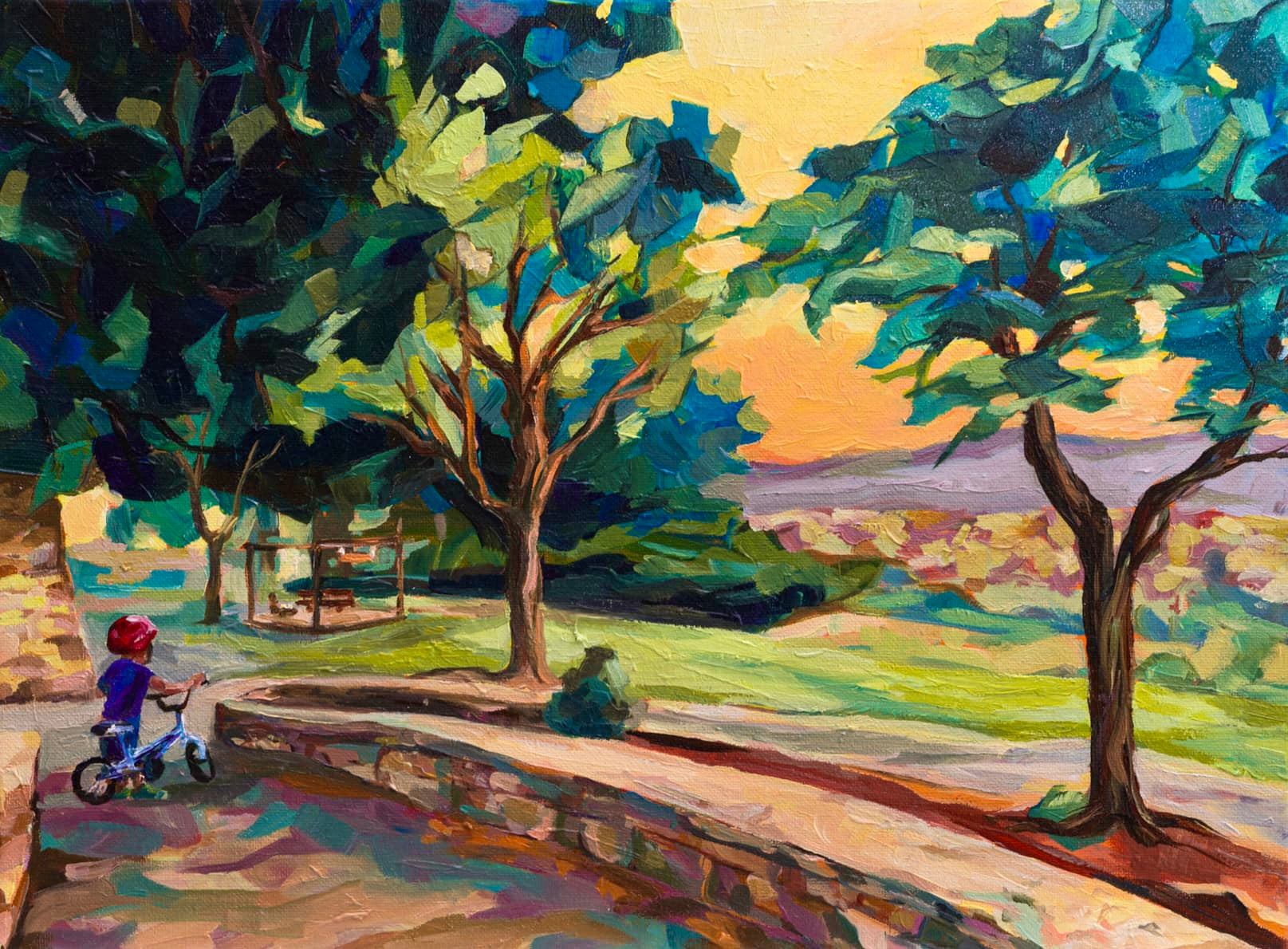 This painting is of my son Akiva when he was 5 years old. He felt ready to ride a two-wheeler, and so, in true Israeli kid style, he removed his own training wheels from his bike and started pedaling with the help neighborhood friends. After that, he was off without a hitch! Children here are so independent - I hope their sweet and innocent self-determination comes across in this piece.