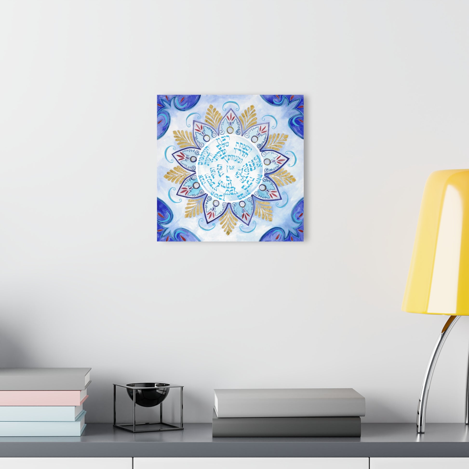Bring harmony and light into your home with Spiral of Serenity, a 12×12" glossy acrylic home blessing by Avigail Tondowski. This piece features a mesmerizing circular mandala rendered in deep cobalt, sky blue, and subtle maroon accents, combining the richness of traditional Middle Eastern motifs with a modern, contemporary twist. The Hebrew blessing spirals gracefully from the center, hand-painted to create a sense of movement and flow, drawing the eye inward while filling your space with peace and intention. Perfect for any room, this artwork transforms a wall into a statement of beauty, spirituality, and joyful energy.