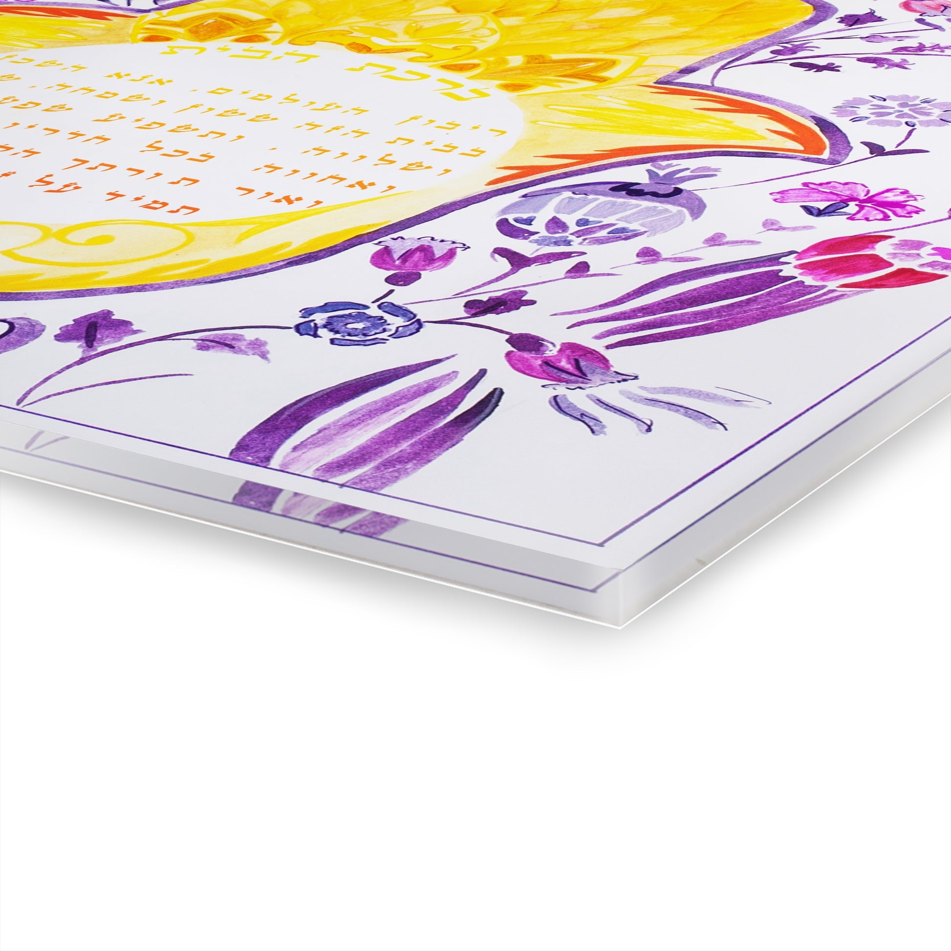 Bring warmth, color, and spiritual protection into your home with this stunning “Blessing for the Home” artwork by Avigael Tondowski. Hand-painted in vibrant shades of yellow, gold, and lilac, this design features a radiant Hamsa motif—a timeless Jewish symbol of blessing and protection—surrounded by delicate floral patterns in soft purples and pinks.