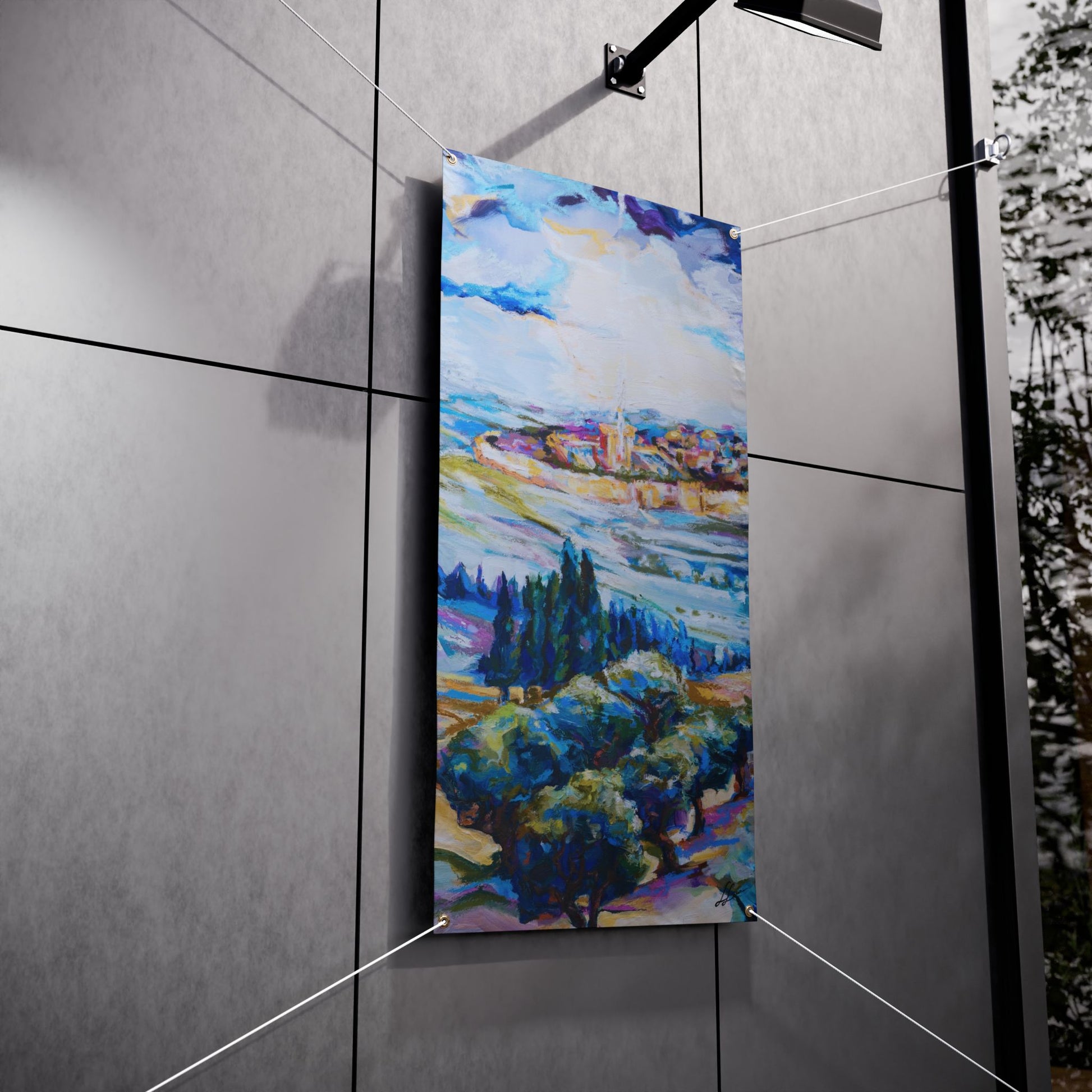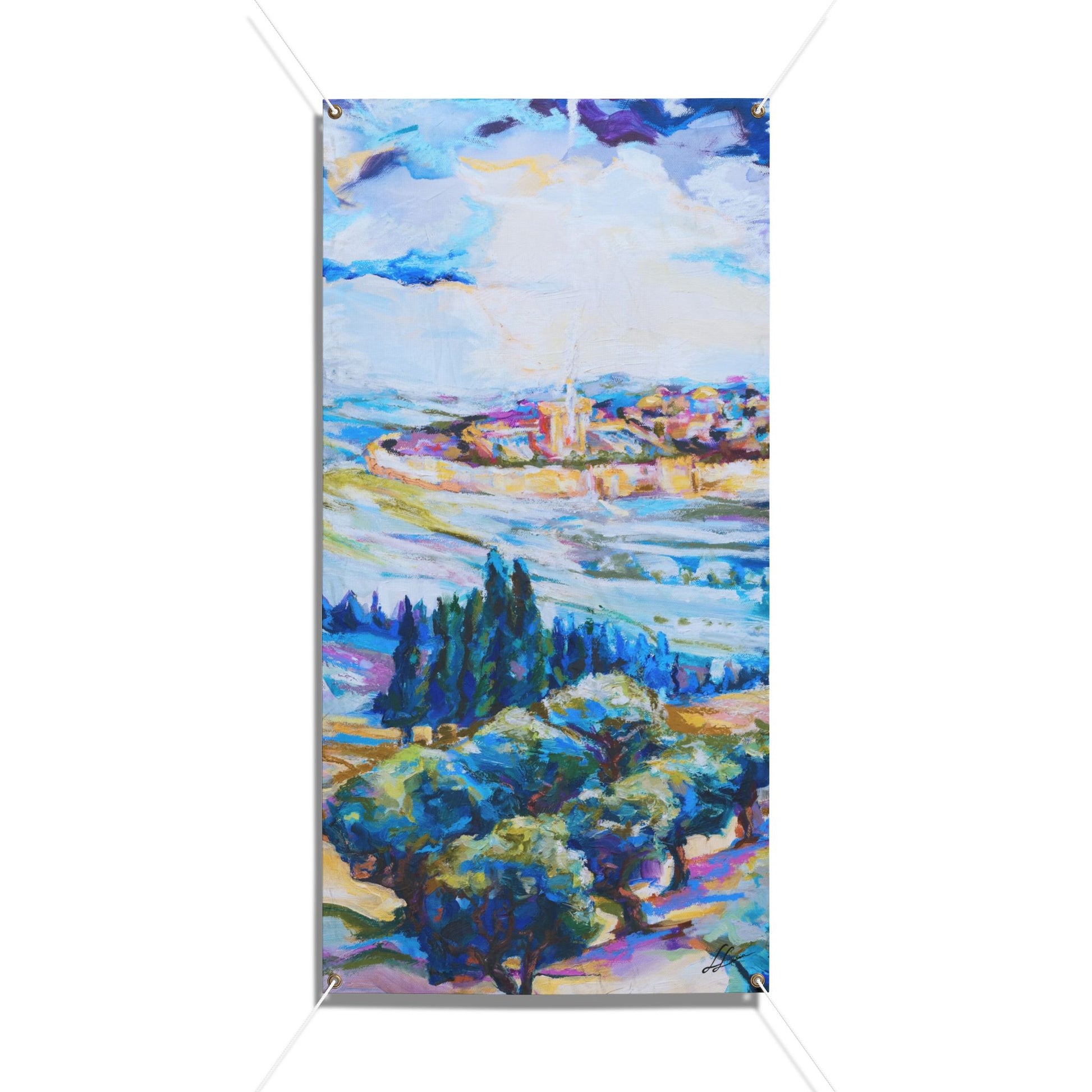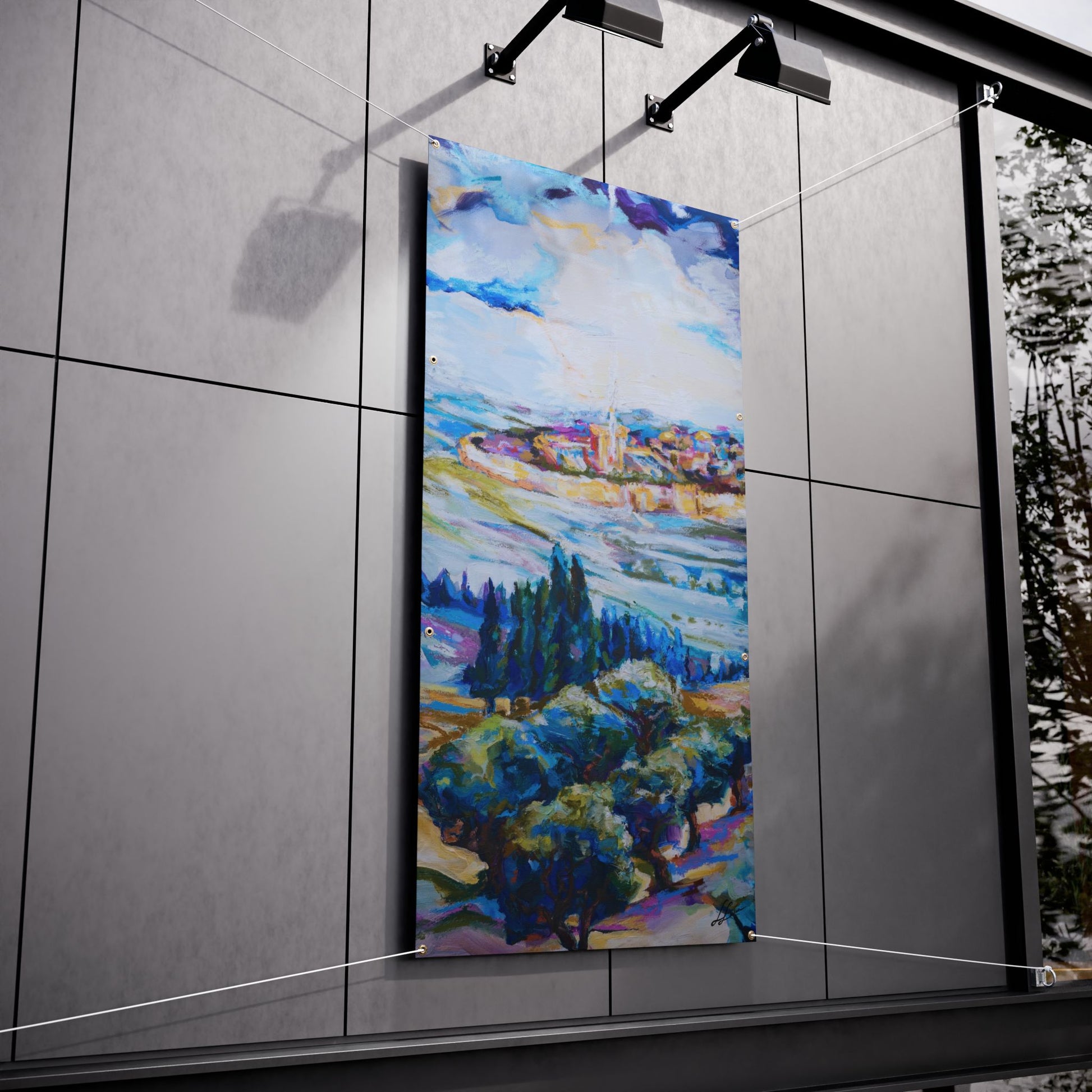 The Temple is portrayed with a sense of longing for a geula that's so close to our reach, helping us visualize and maintain the enduring hope and faith in its reconstruction in our days. The painting exudes a mystical aura, inviting viewers to meditate on the idea of visualization as a powerful tool to manifest the long-awaited Redemption. It speaks to the collective longing and spiritual yearning of the Jewish people for the rebuilding of the temple. Material: Titan™ 10 oz. scrim vinyl
