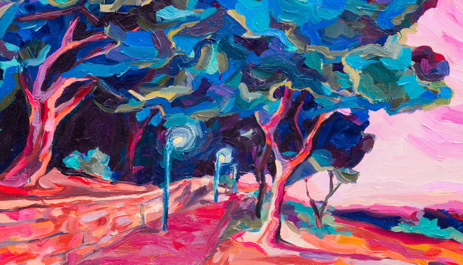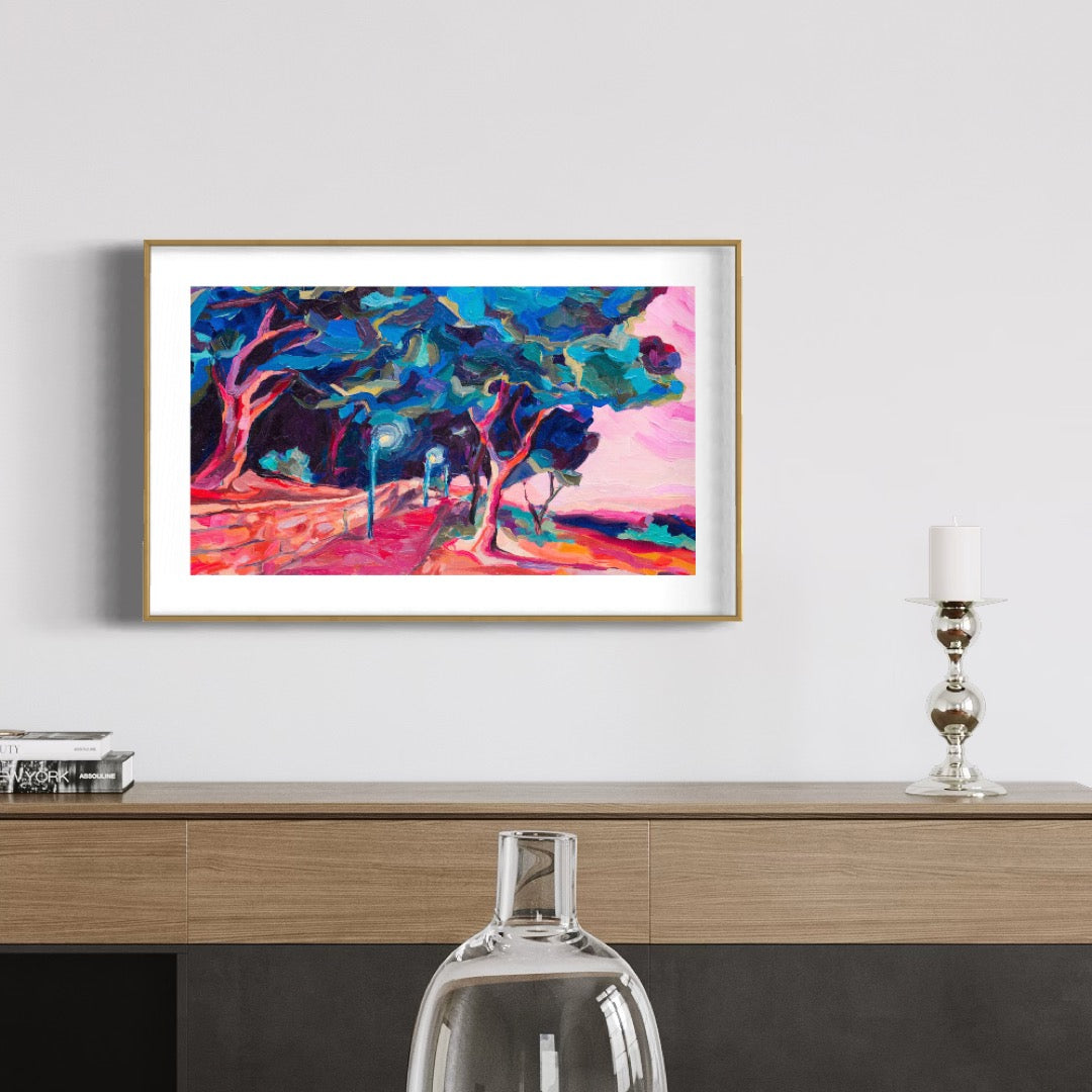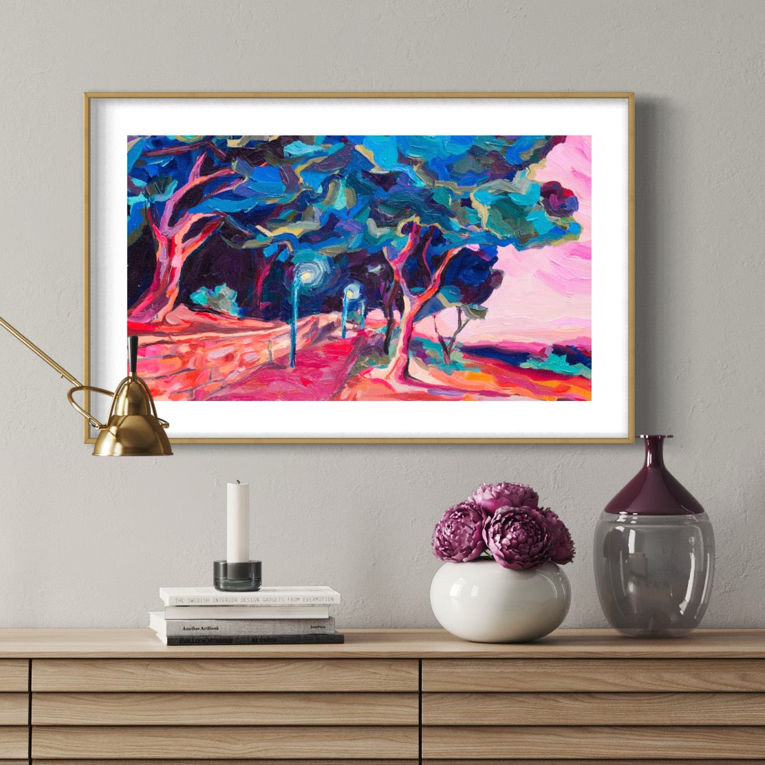 Summer evenings in Israel are a vibe! Painted in oils with bold cobalt blues and maroons using broad impressionistic brushstrokes, this piece will bring the vibrant energy of Israel's summertime at dusk into your home.