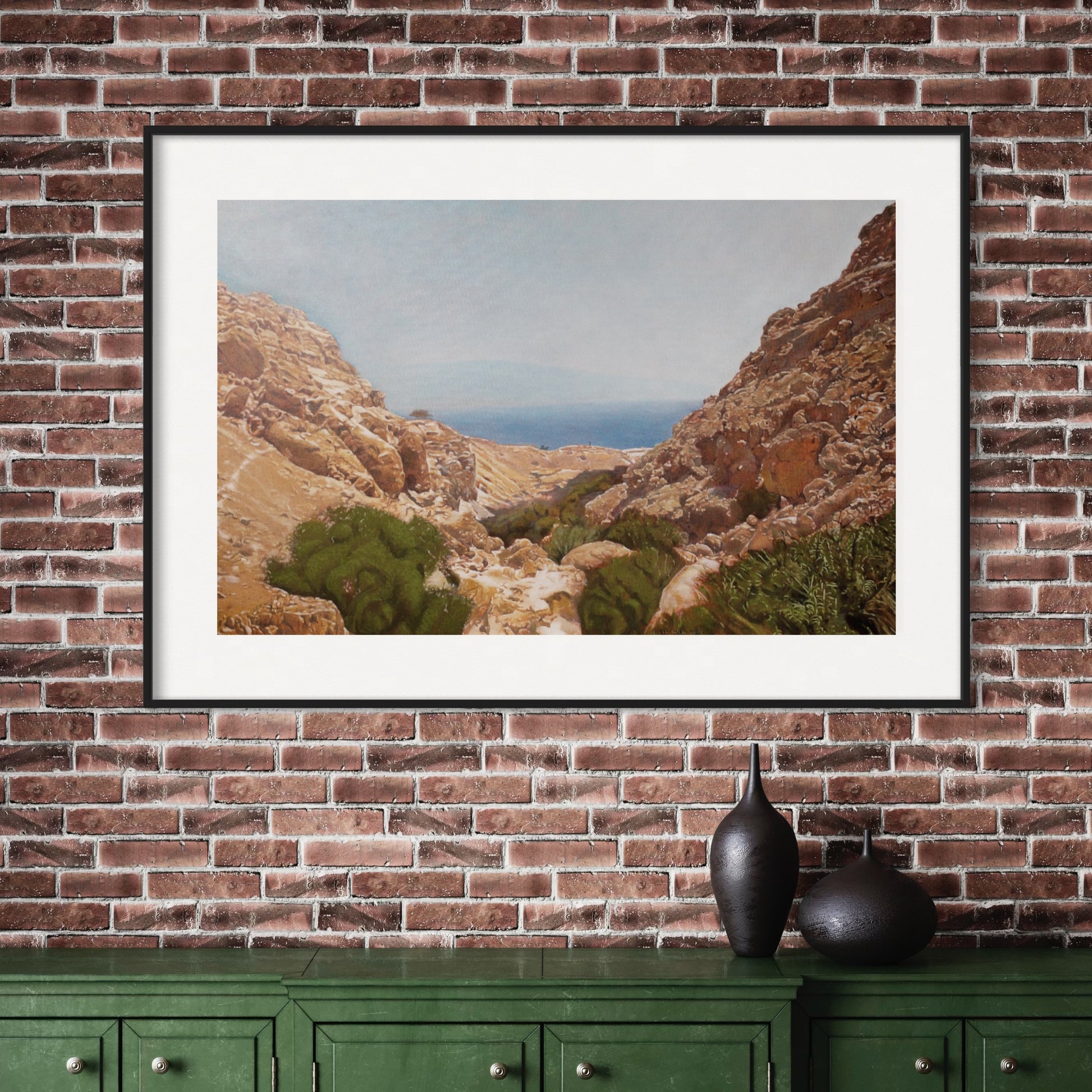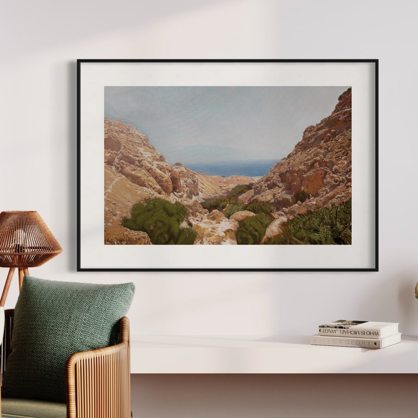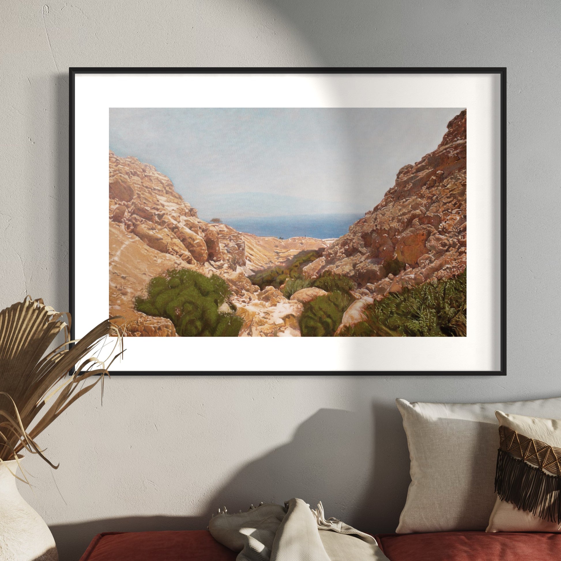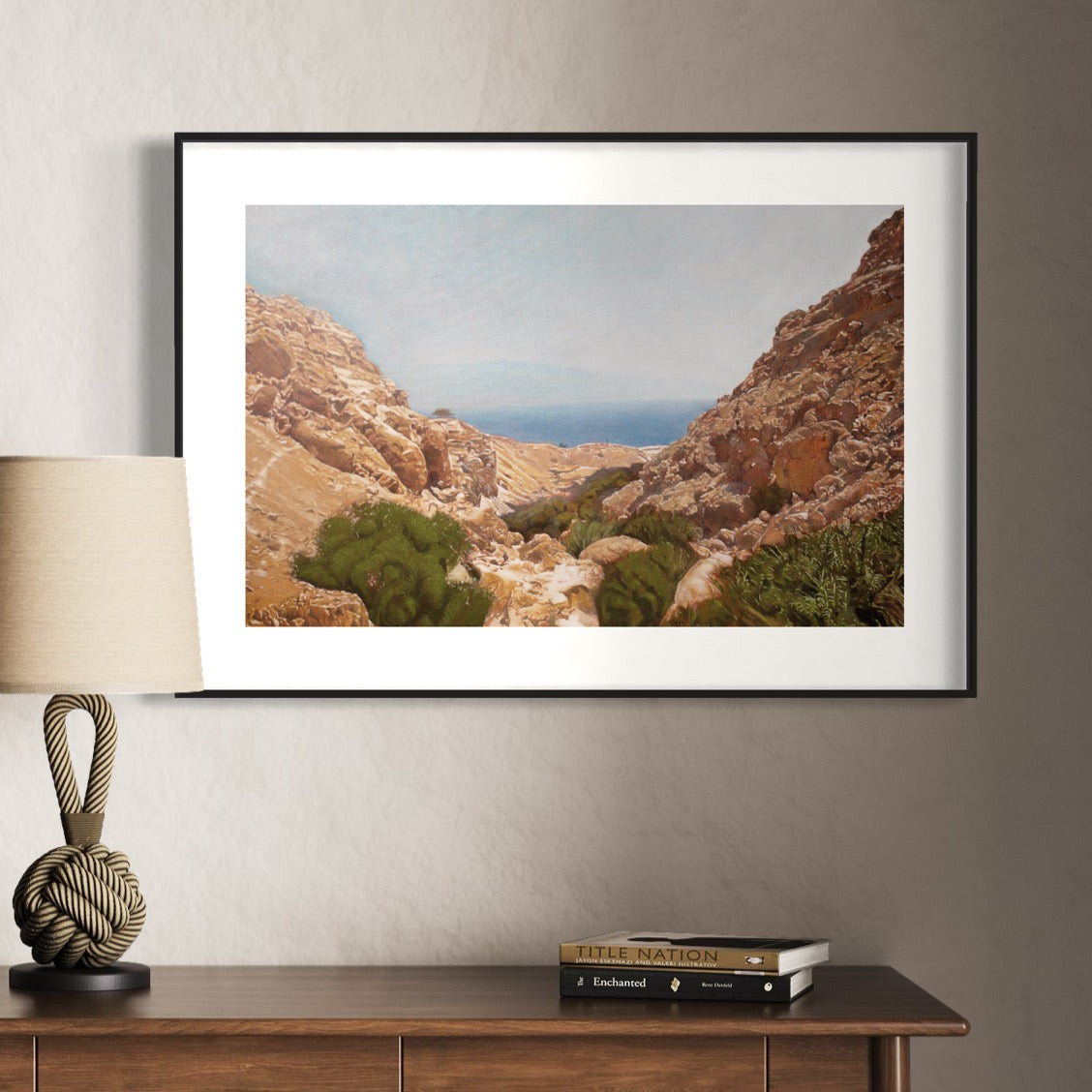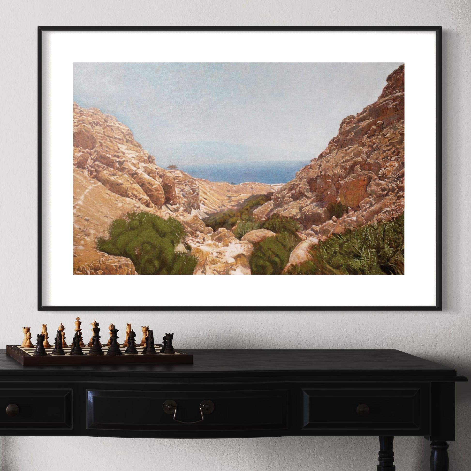 Eyn Gedi by Pinchas Bensusan captures the striking beauty of the desert, where sunlight dances across rugged terrain and echoes of history seem to linger in every rock. Inspired by the biblical story of David seeking refuge, the painting reflects both the grandeur of the landscape and the timeless spirit of courage and perseverance.