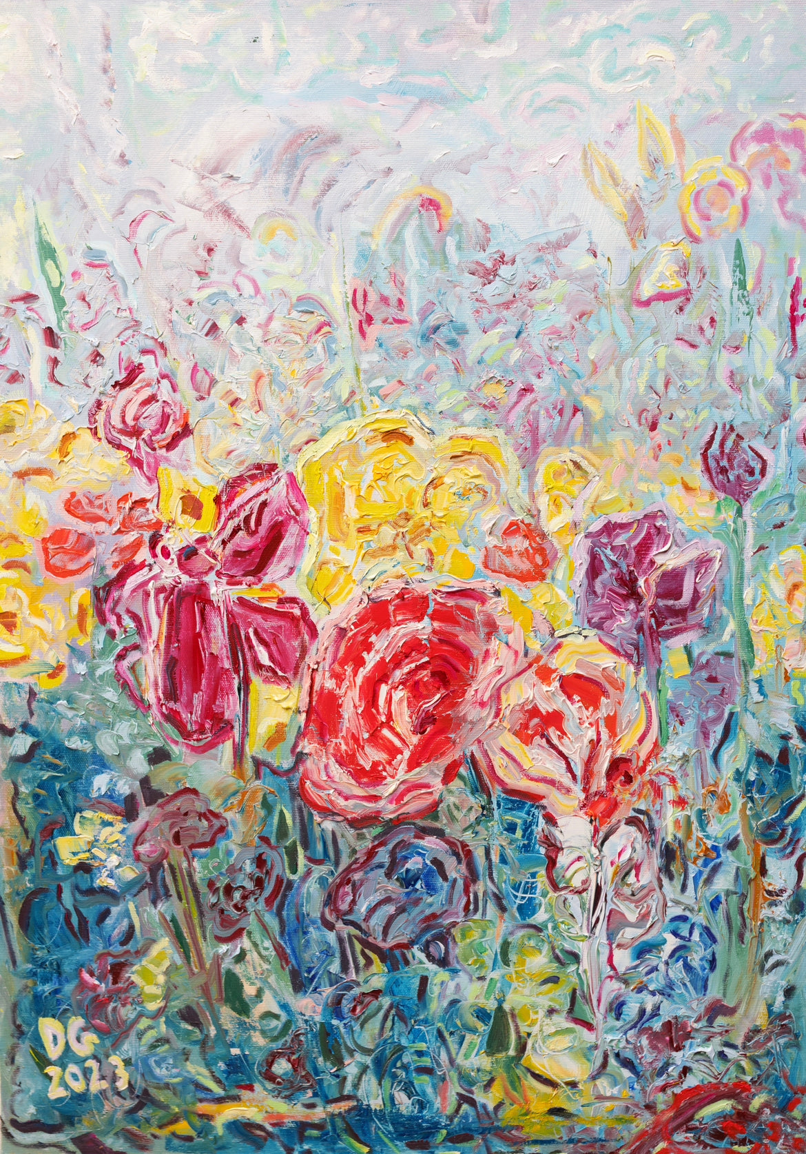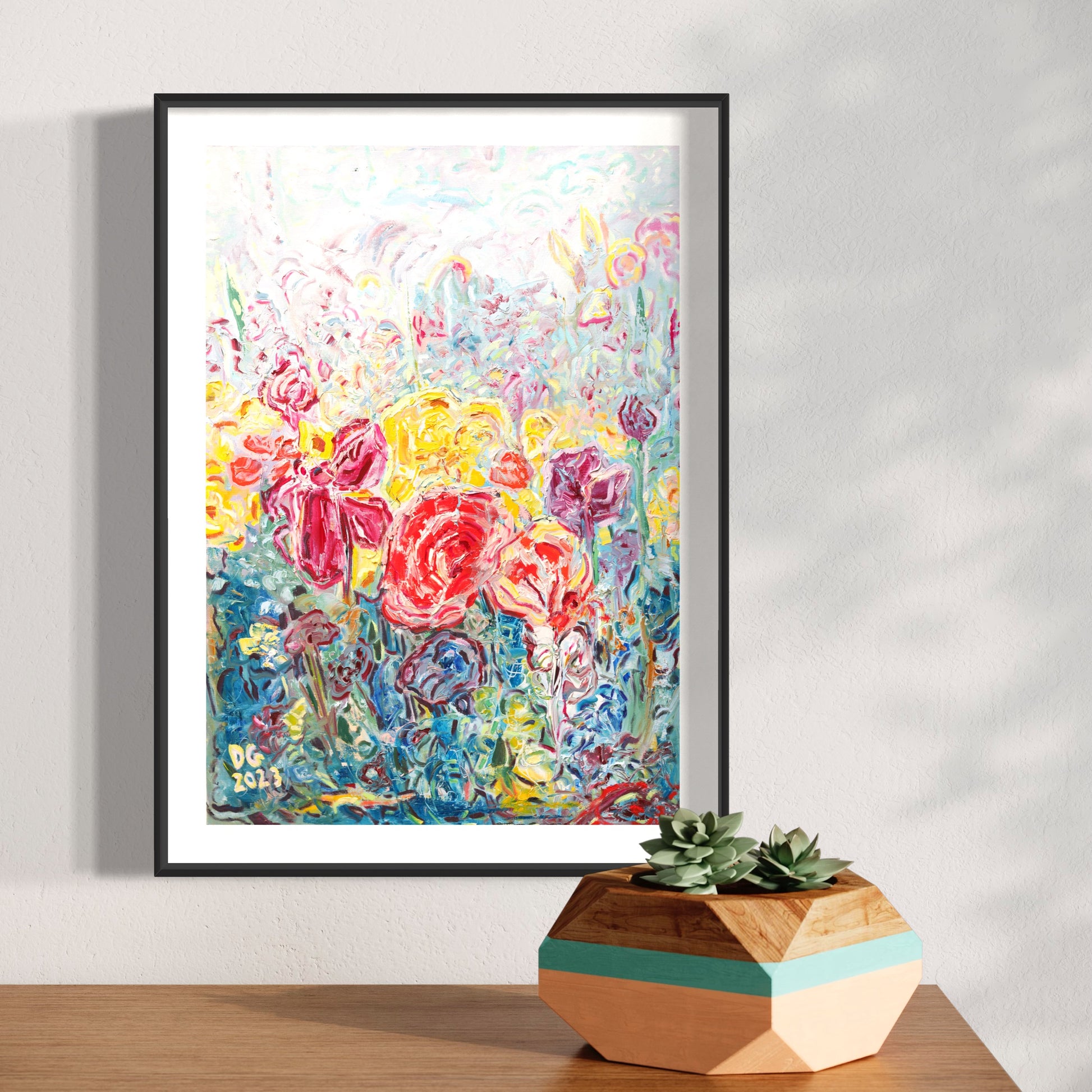 Dara Goldschmidt's enchanting painting, invites viewers into an impressionistic garden of vibrant blooms, where hues of yellows, reds, and maroons converge in joyful harmony. The expressive and painterly brushwork adds a dynamic texture, capturing the essence of a leisurely stroll through nature, as the blossoms seem to come alive on the canvas so much so that you can almost smell them through the canvas. Dara's skill in infusing the tangible sensations of the natural world into her art.
