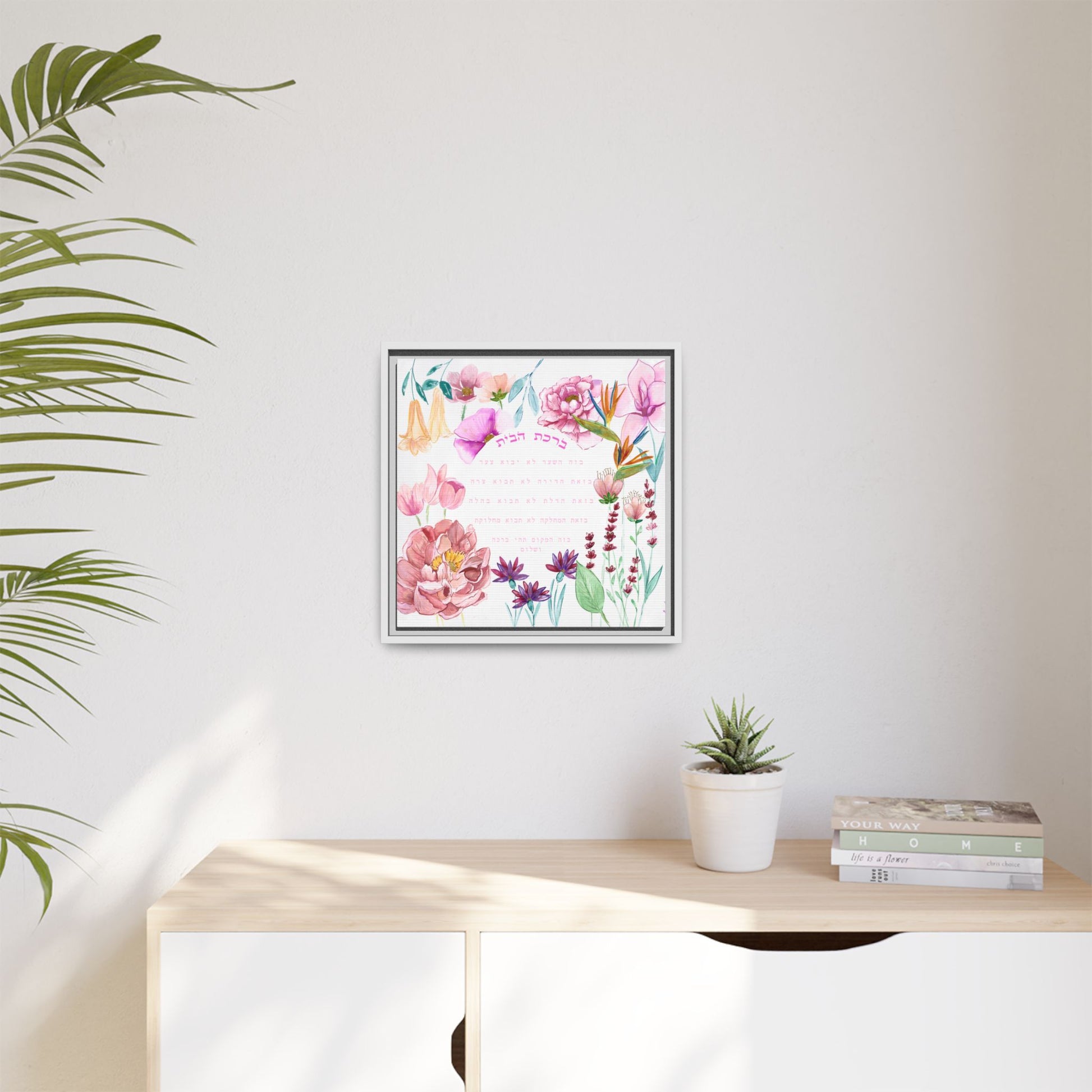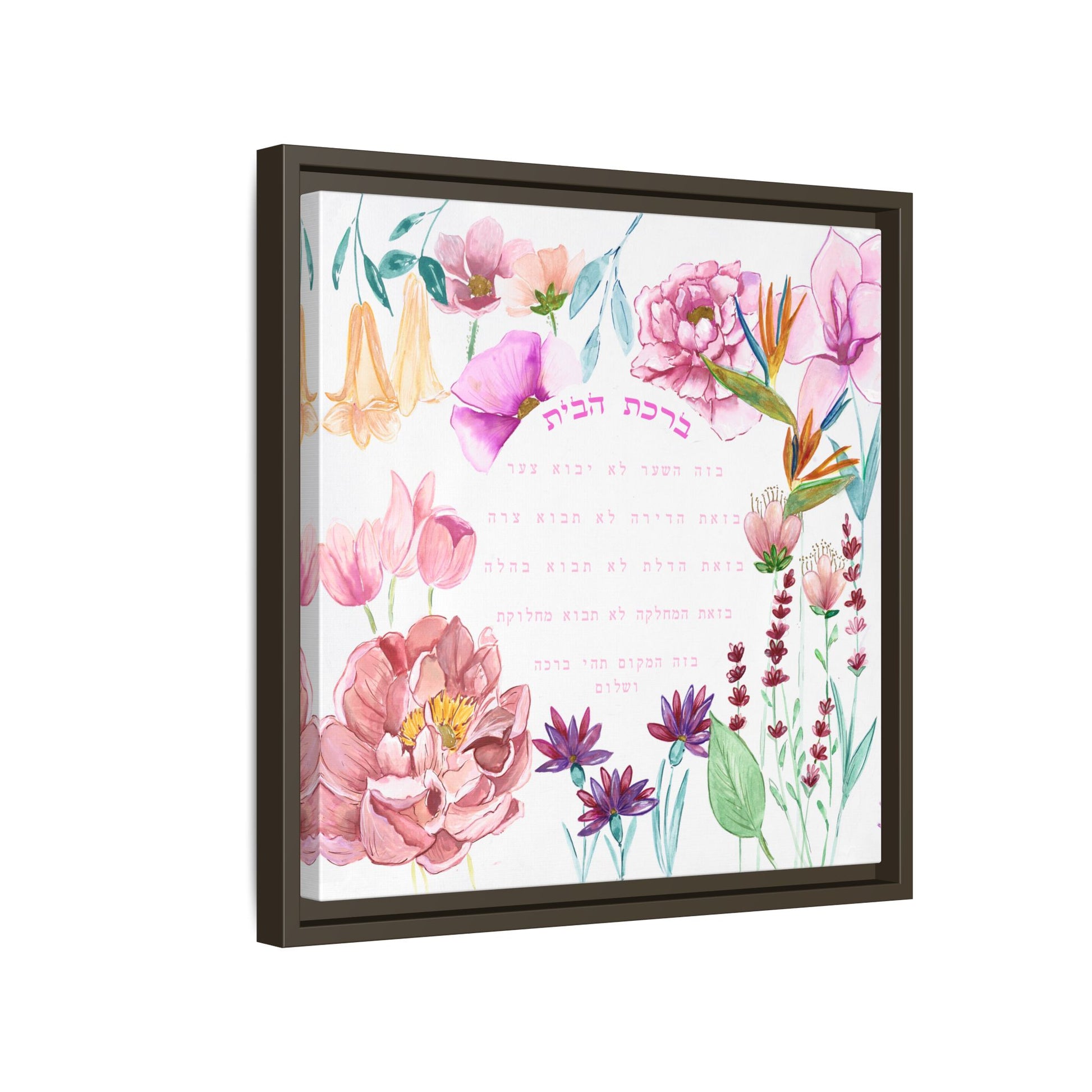 Keywords: Floral home blessing, Birkat HaBayit, framed Judaica wall art, Hebrew home blessing, Avigael Tondowski, watercolor flowers, Jewish home decor, modern Judaica canvas print, Israel art, Jewish wedding gift, Hebrew blessing art, eco-friendly framed art.