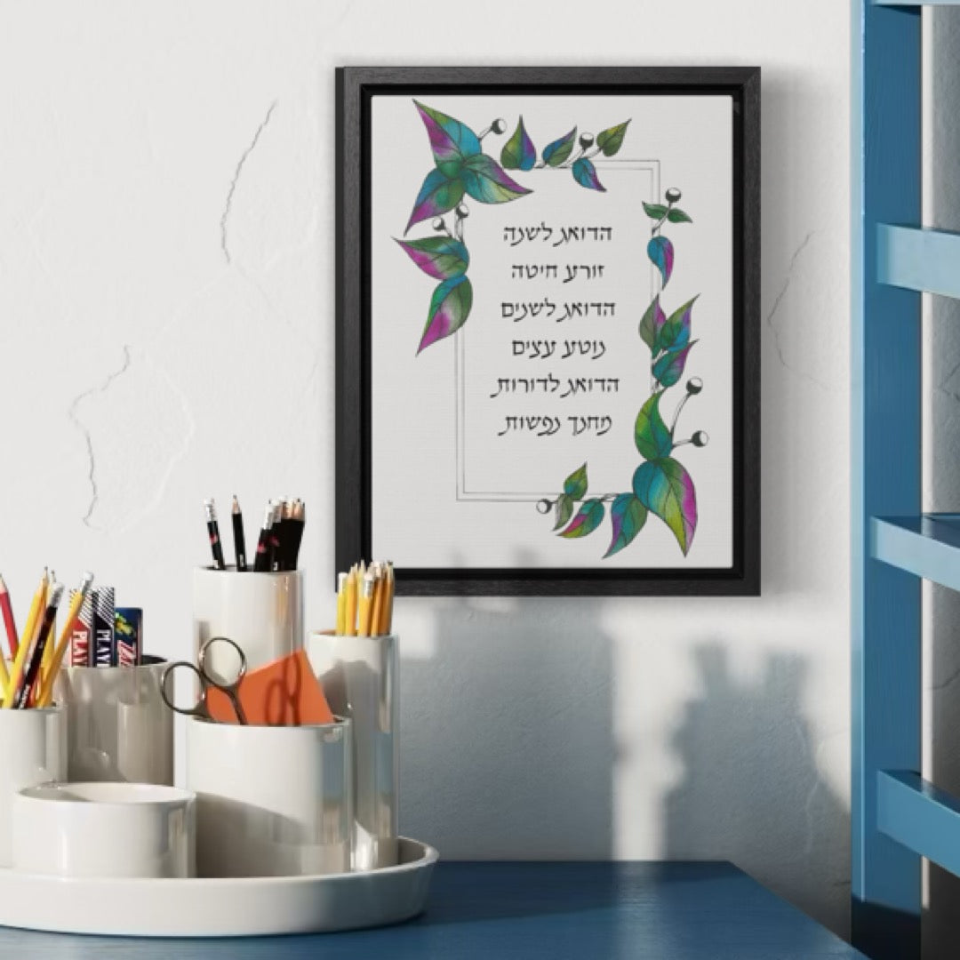 "Gratitude for Life's Teachers" by Shira Gabriela is a heartwarming tribute to teachers, printed on canvas and presented already framed and ready to gift! This piece serves as an exceptional gift for teachers, celebrating the profound impact they have on shaping lives. The canvas features an artful blend of delicate leaves and vines, with a carefully crafted Hebrew verse about teachers in the center of the artwork.