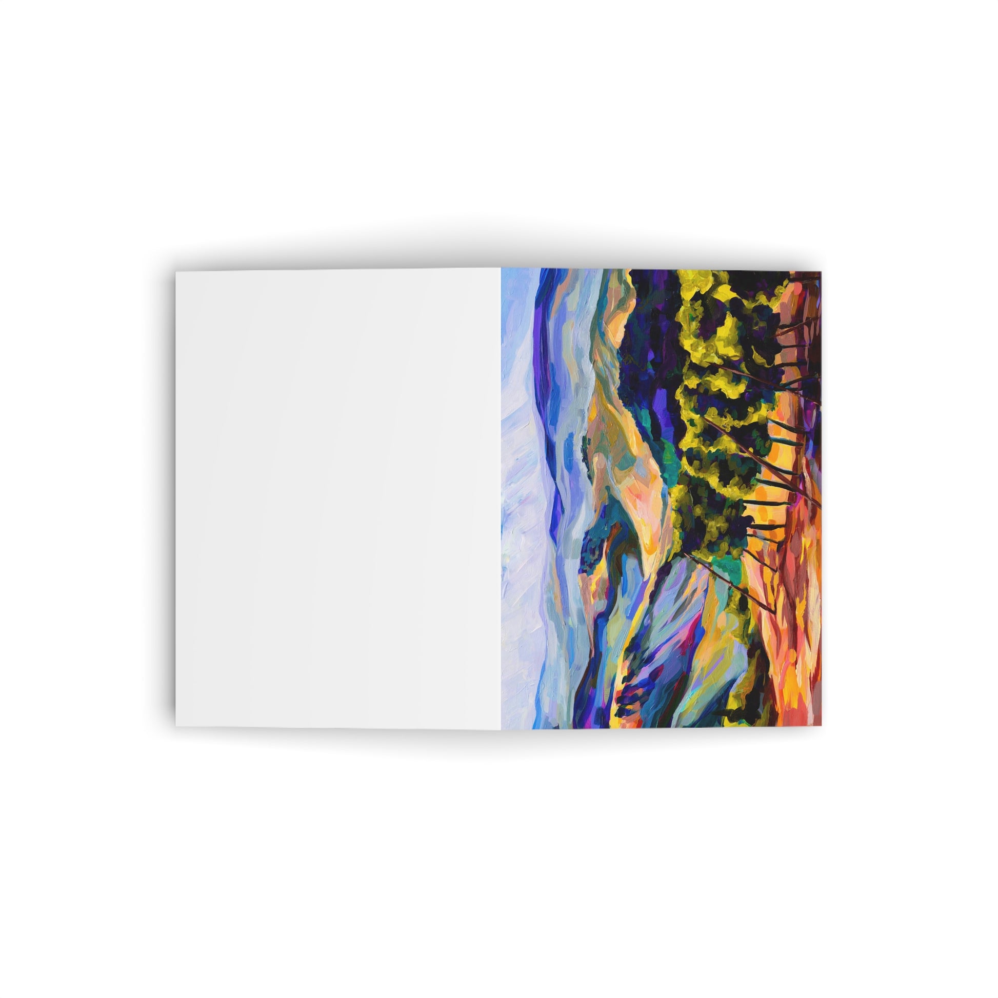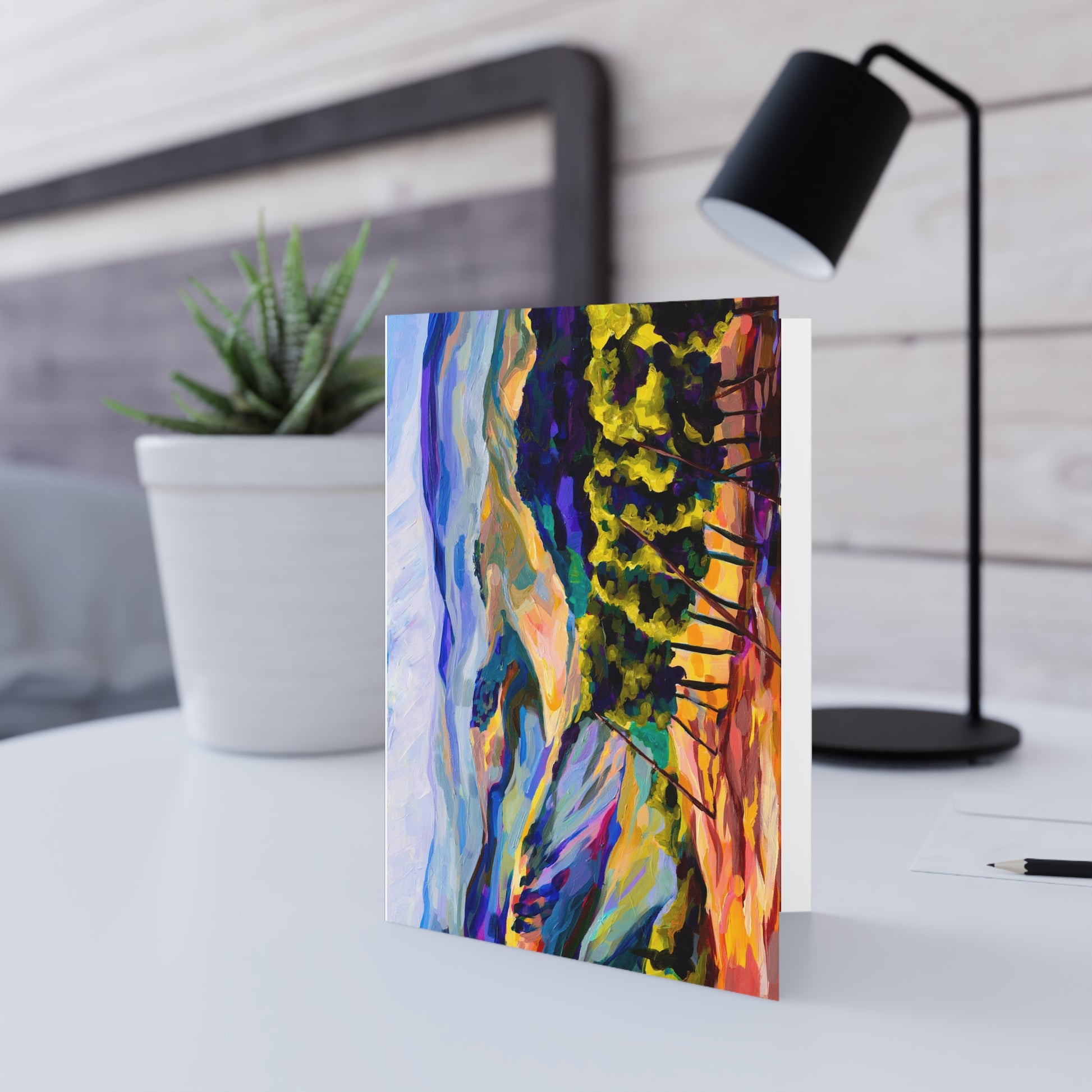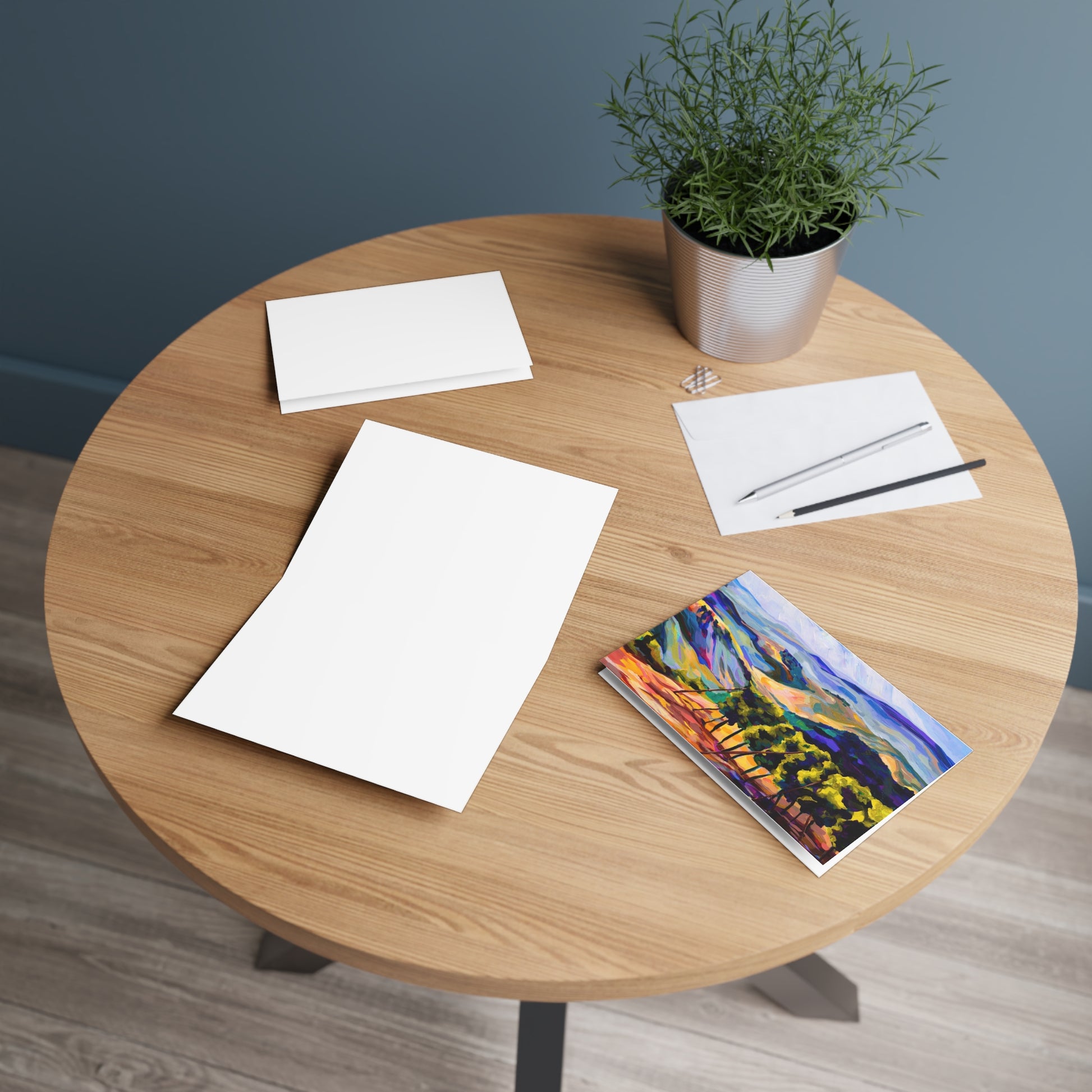 Unique greeting cards of a vineyard and lush rolling hills of Gush Etzion painting by Leah Luria. Made from premium-quality paper and printed in picture-perfect resolution, these folded cards are the perfect complimentary gift for any occasion