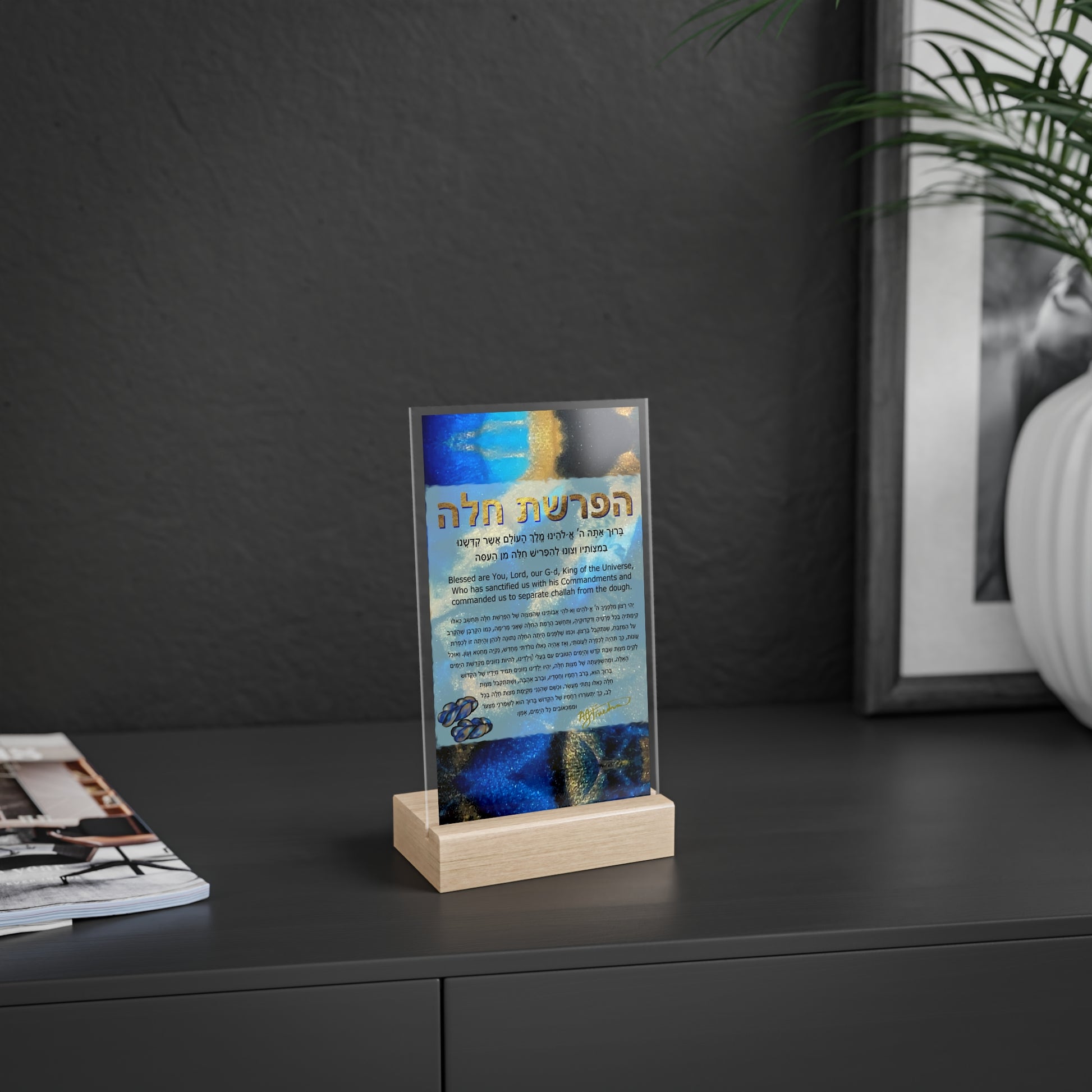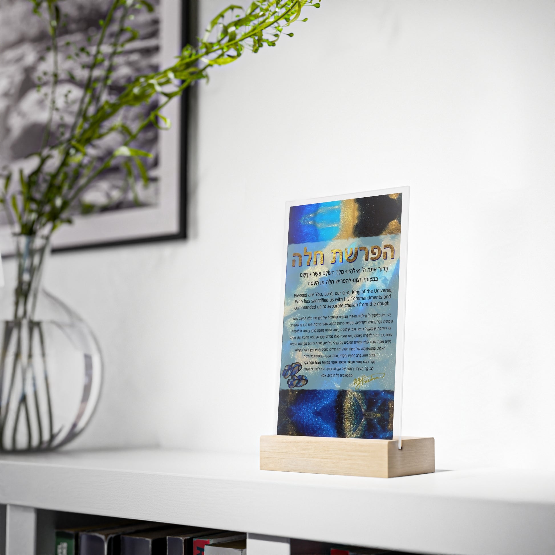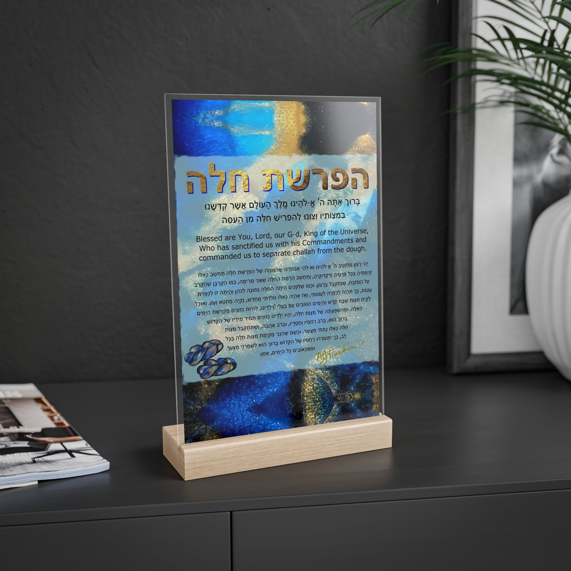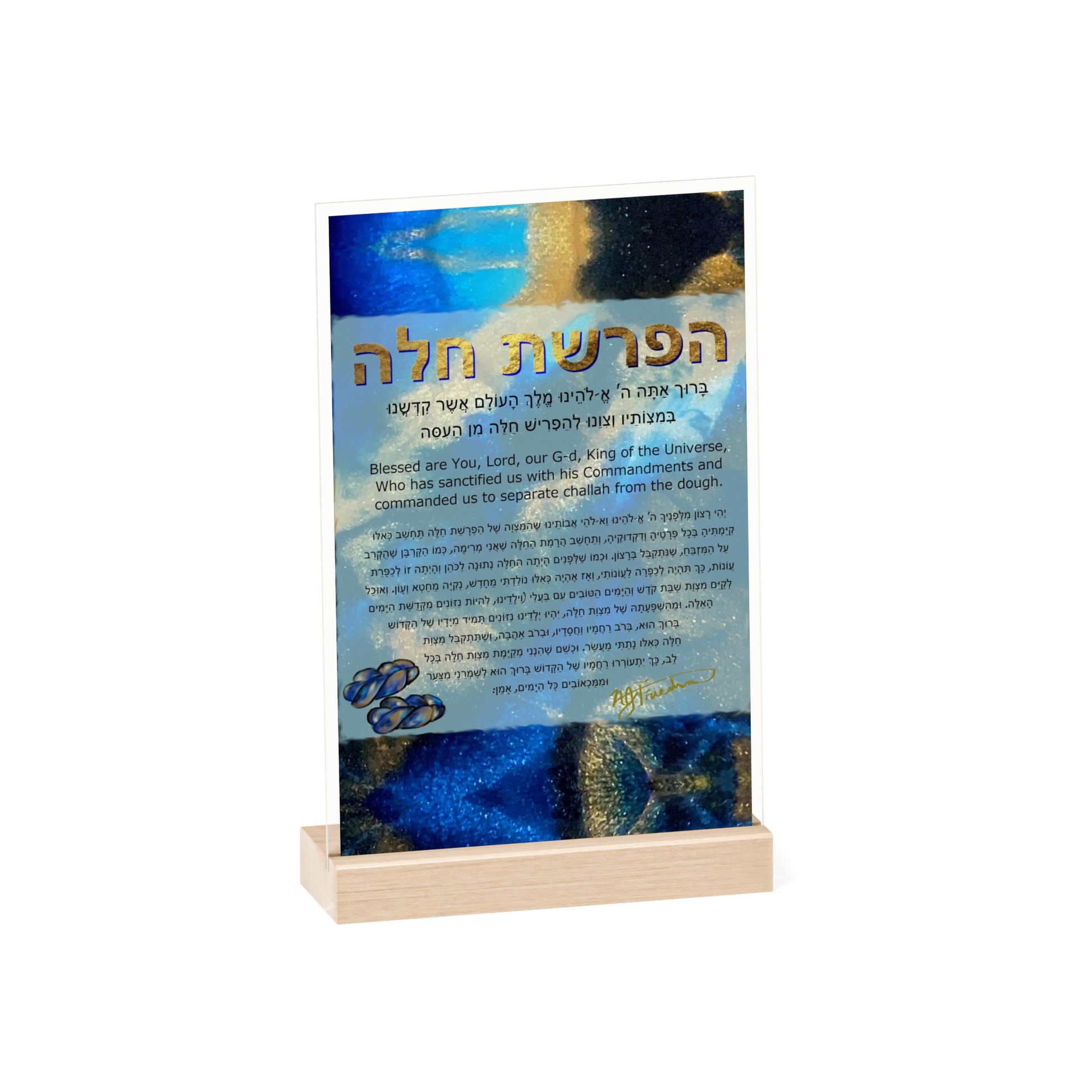 "Hafrasha Challah in Fluid Gold & Blues" by Nicole Friedman Acrylic Sign with Wooden Stand