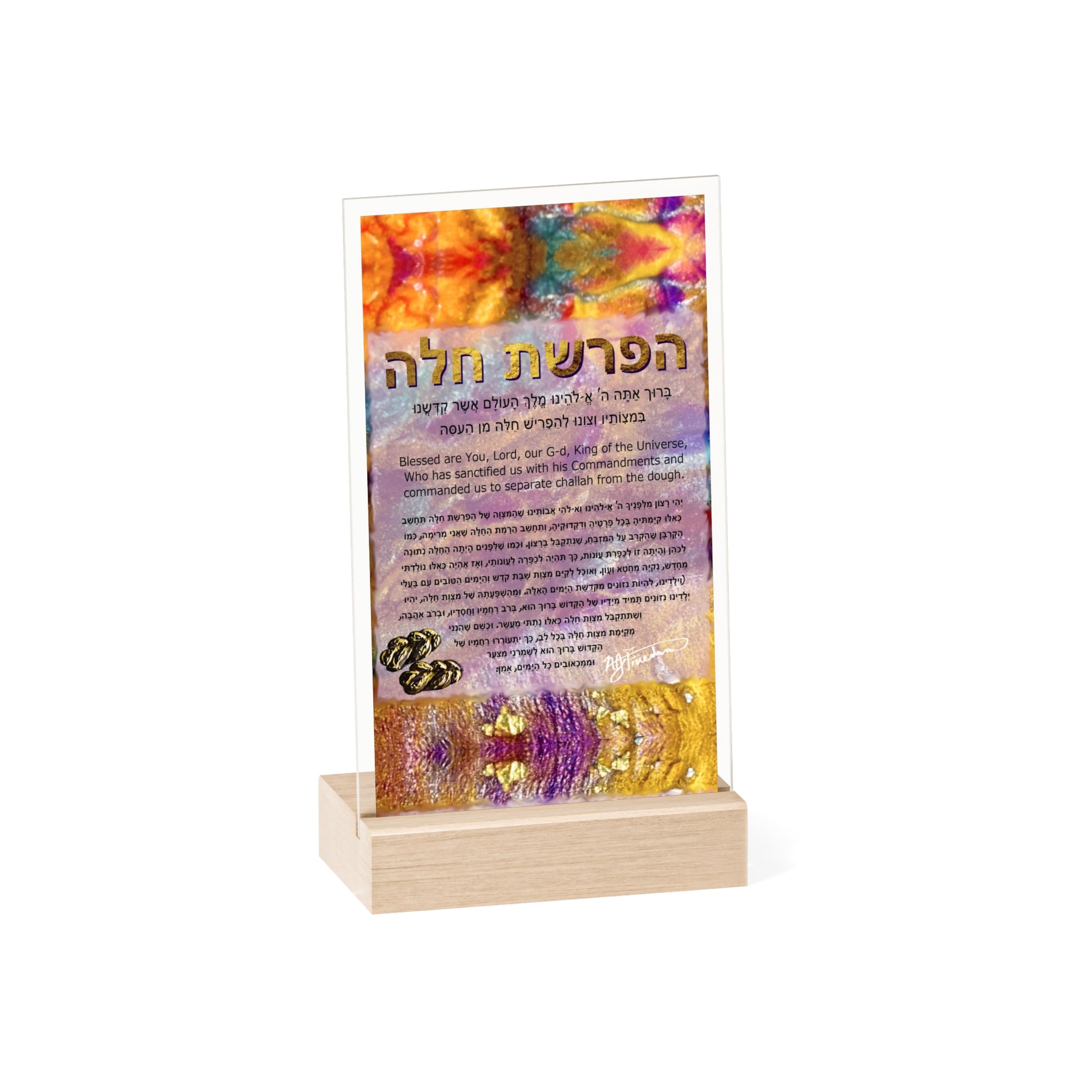 "Hafrasha Challah in Fluid in Warm Hues" by Nicole Friedman Acrylic Sign with Wooden Stand