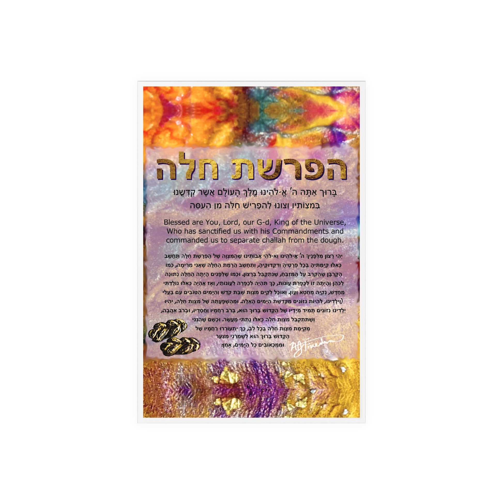 Elevate your baking corner with Nicole Friedman's "Hafrasha Challah" Blessing in a stunning glossy acrylic print on a stand. This exquisite piece not only captures the essence of a cherished Jewish tradition—the blessing recited during the mitzvah of taking challah for Shabbat—but also brings a touch of artistry to your sacred baking space.