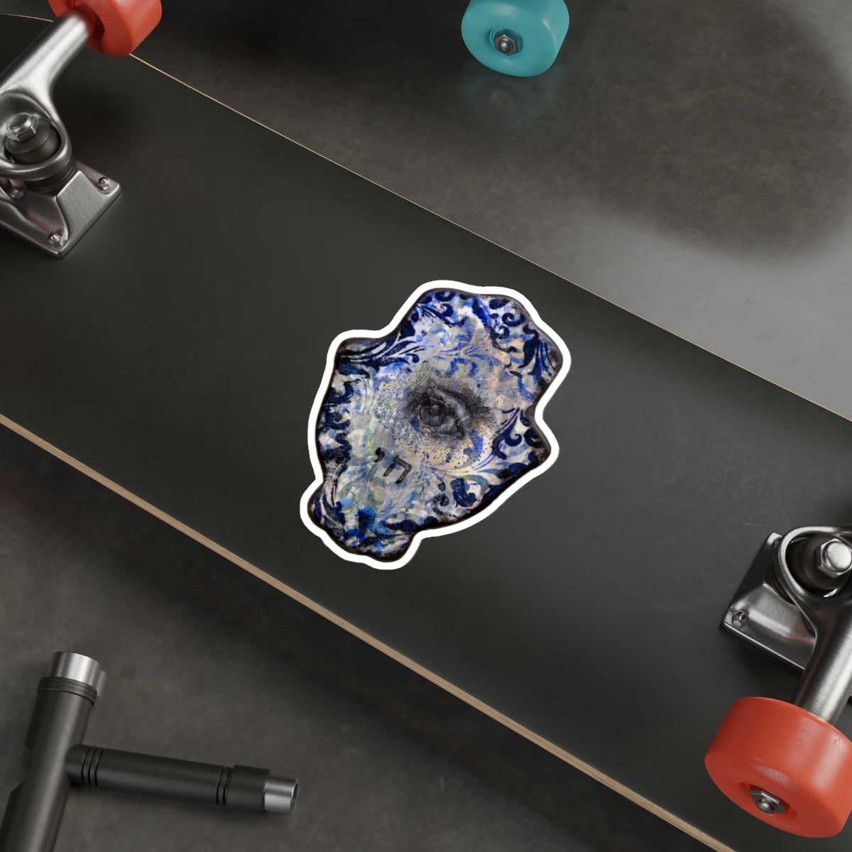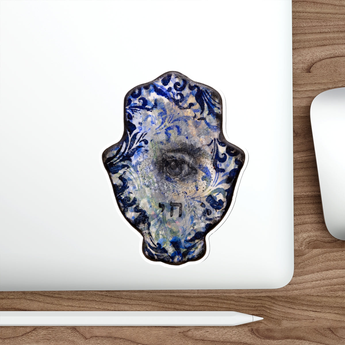 Transform your surroundings with "Hamsa in Blues II" Die-Cut Sticker by Esther Cohen. This sticker, expertly crafted in the iconic Hamsa shape, offers the perfect blend of artistic Judaic pride mixed with beauty and personalization. Created with thick, resistant laminate vinyl, these stickers are not only durable but also versatile for both indoor and outdoor use. The easy-peel backing ensures a hassle-free application, while the matte finish adds a sleek touch to your designs on any surface. Whether adorning your laptop, notebooks, or even as a unique bumper sticker, these stickers are a chic statement piece. Collecting them becomes a personalized journey of curating your own gallery on the go, each sticker adding a touch of artistry to your daily life. This sticker serves to embellish your belongings while championing art and artists in Israel. Make a bold statement, stand out, and celebrate creativity with the "Hamsa in Blues II" Die-Cut Sticker—a perfect gift and a stylish addition to any personal space.