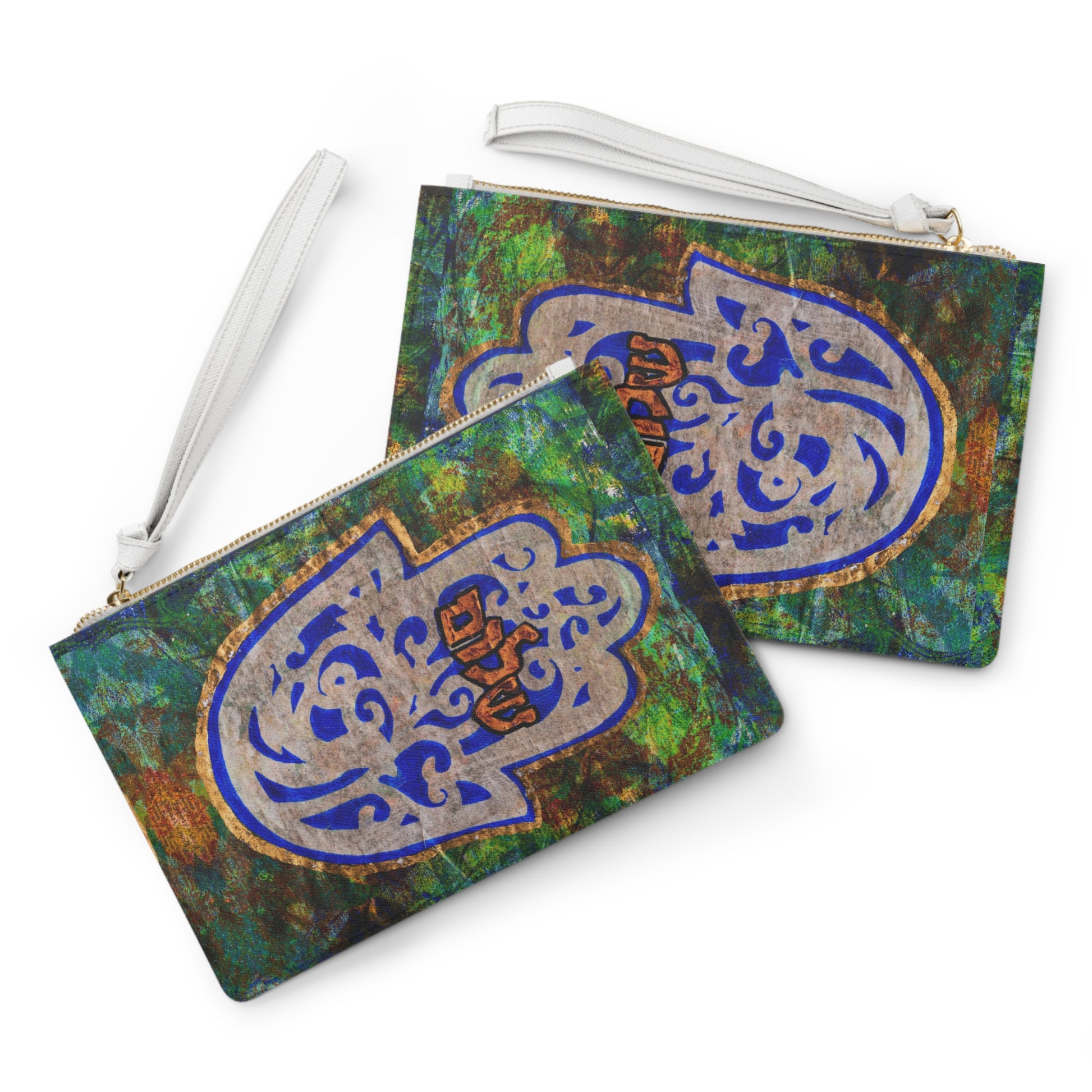 Step into a world of style and symbolism with the "Hamsa of Peace" by Esther Cohen Clutch Bag, a fusion of innovative printmaking techniques and fashion-forward design. The captivating greens and blues, coupled with the beautiful and edgy texture, make this clutch a wearable masterpiece infused with both artistry and meaning.