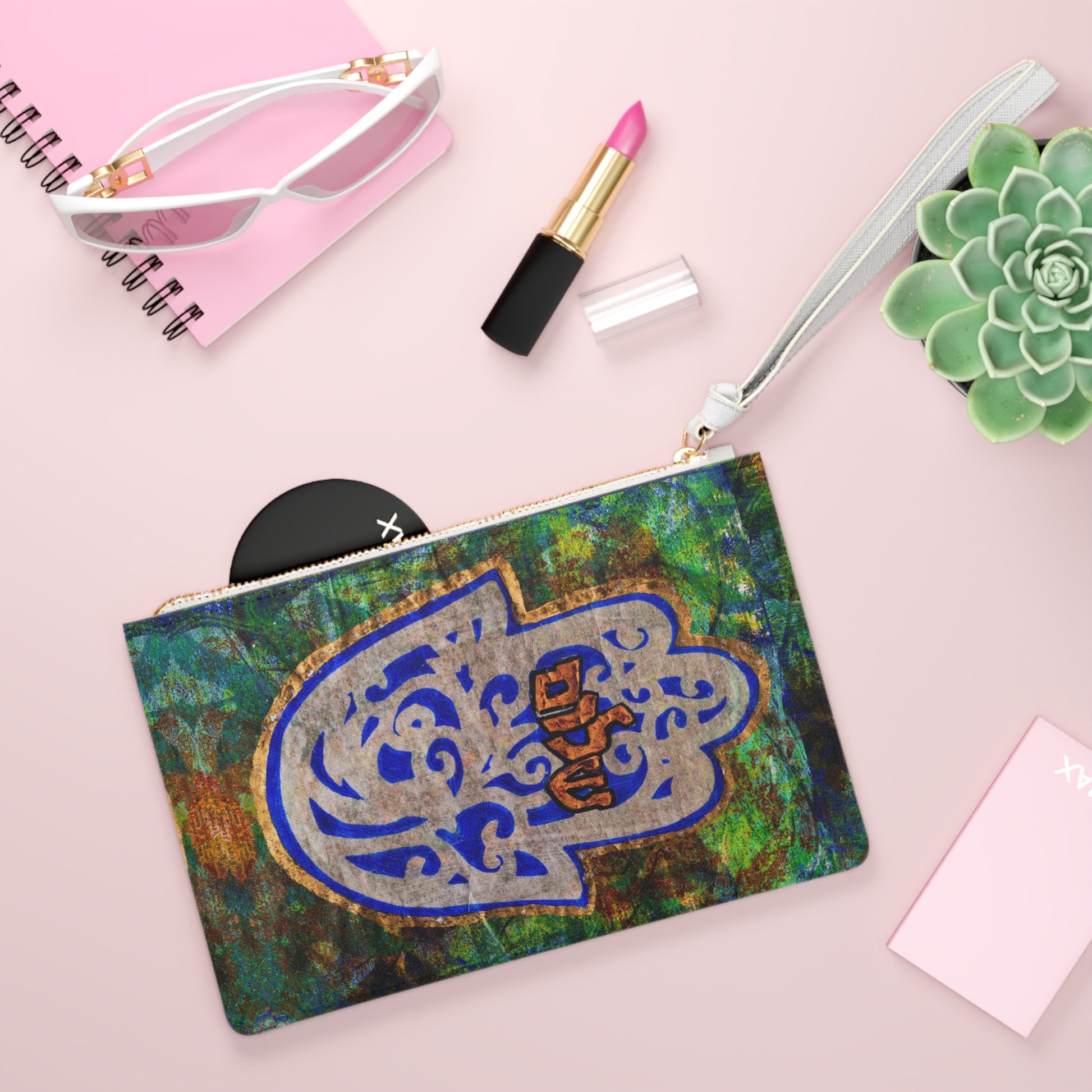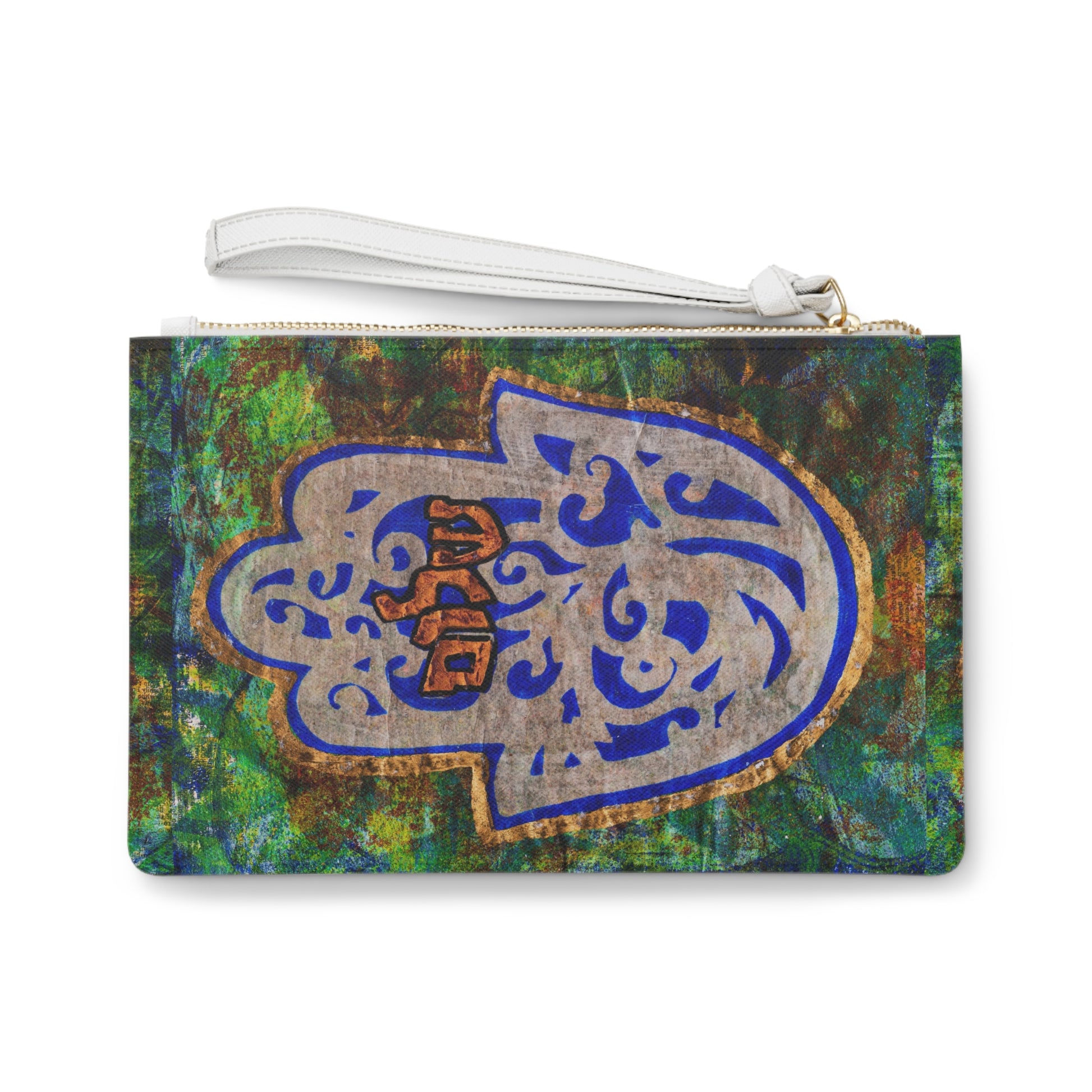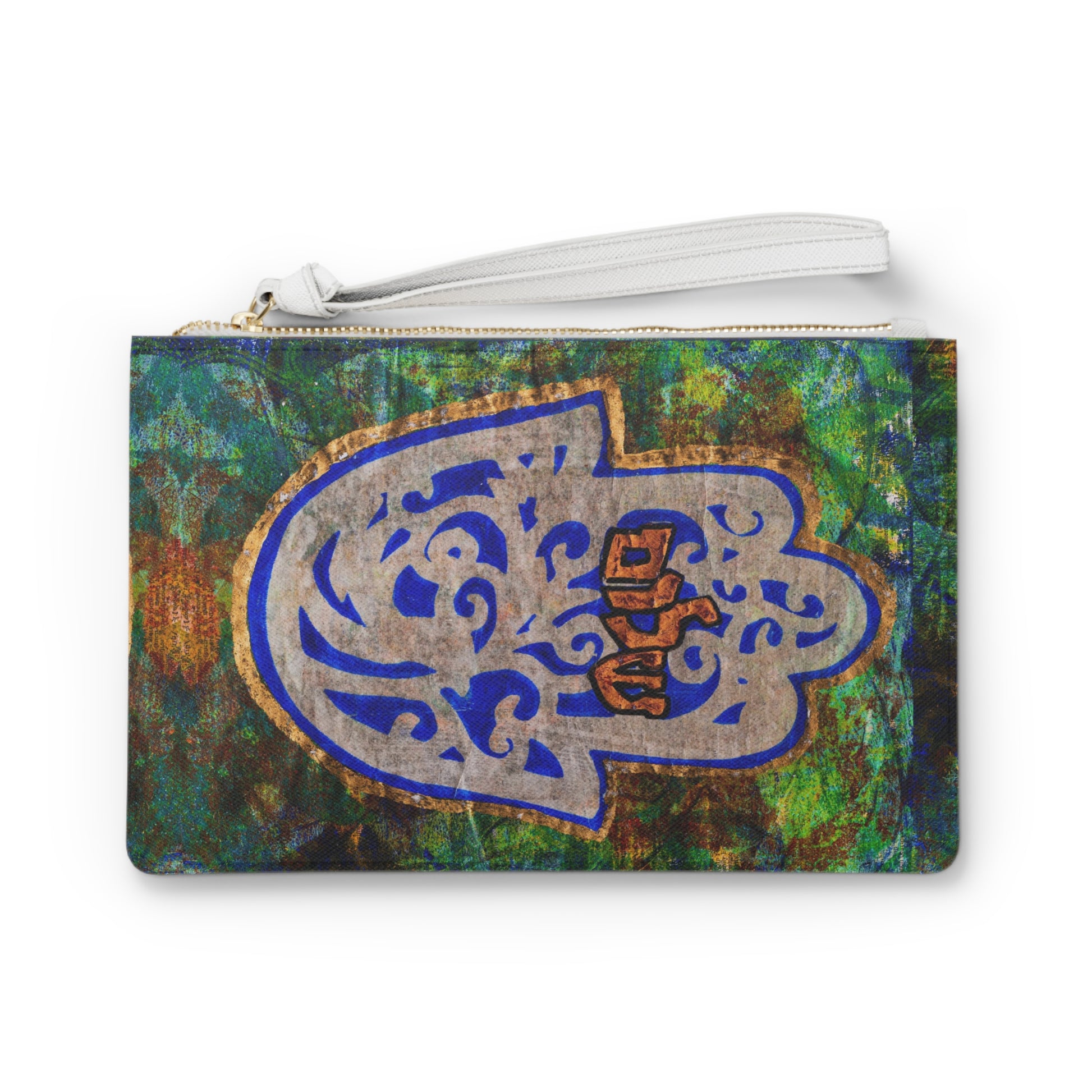 The Hamsa, symbolizing protection in Judaism, adds a touch of spirituality to your ensemble. Designed for the fashionista on the go, this custom clutch features a convenient loop handle for hands-free ease and is spacious enough to hold your everyday essentials. With a zip fastening and a fully lined internal pocket, practicality meets art seamlessly.