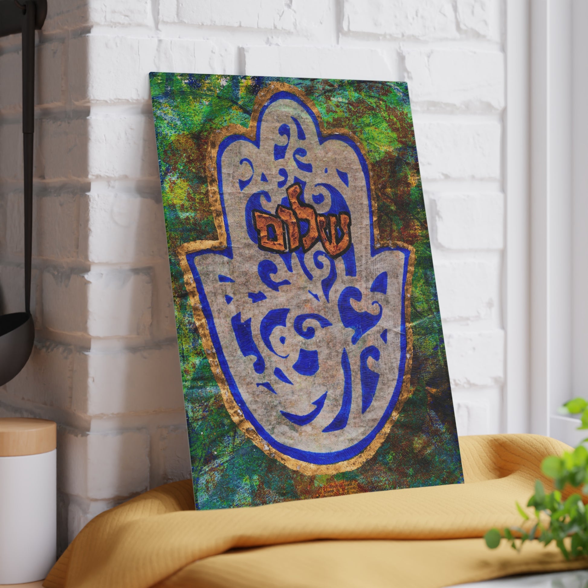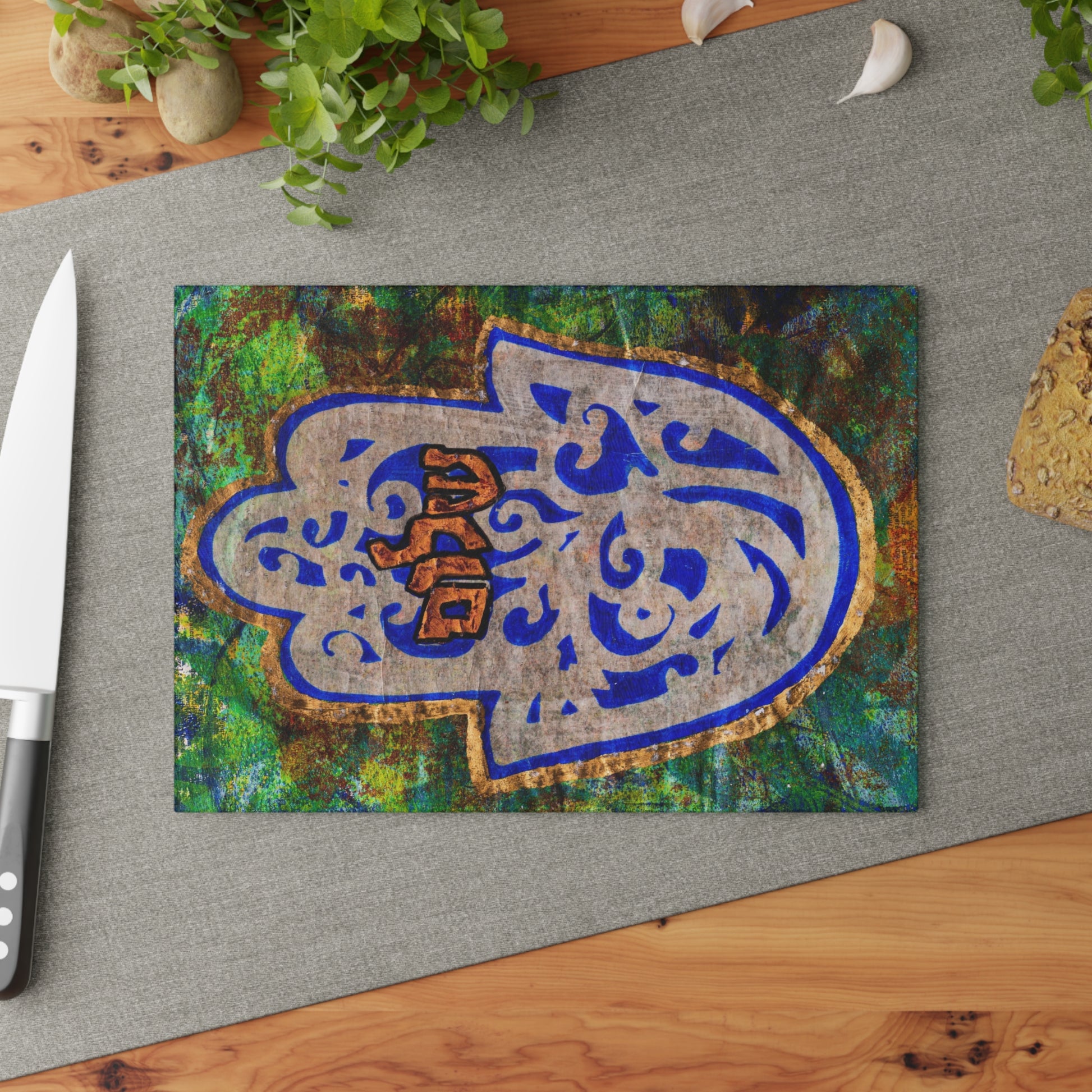 Elevate your Shabbat rituals with the "Hamsa of Peace" Glass Challah Board by Esther Cohen, a fusion of artistic brilliance and functional elegance. Crafted from durable tempered glass, this unique challah board not only showcases Cohen's mesmerizing greens and blues but also offers a robust surface for preparing and presenting your cherished challot. The textured surface makes it an ideal choice for slicing all types of challah bread, whether it's homemade, sourdough, or store-bought.