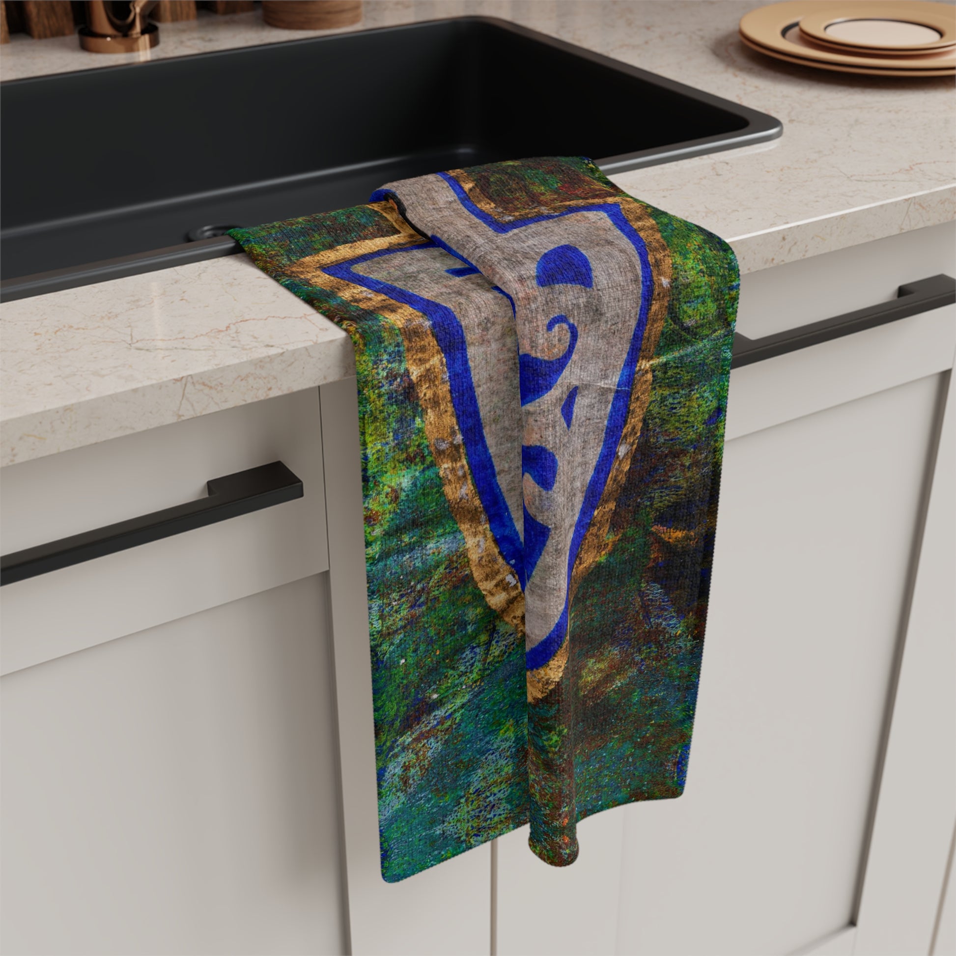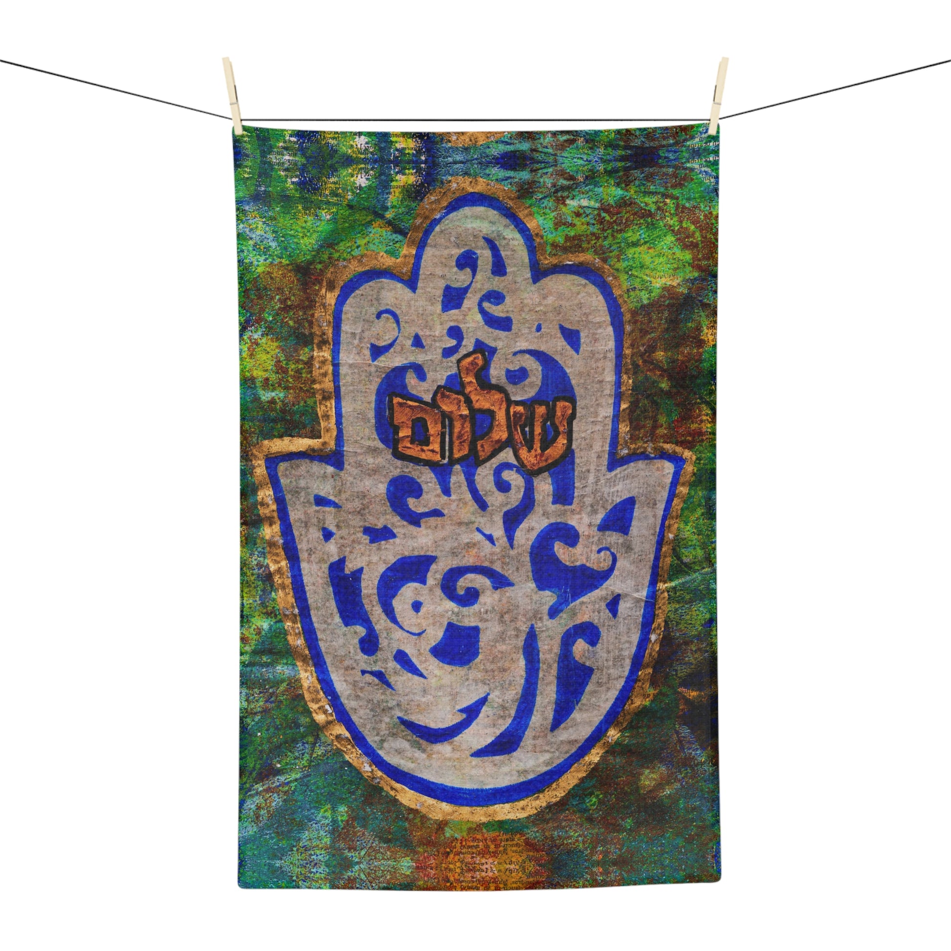Elevate your Shabbat rituals with the "Hamsa of Peace" Shabbat Netilat Yadayim Soft Hand Towel by Esther Cohen, a masterpiece that seamlessly blends modern aesthetics with Judaica elegance. Esther's innovative printmaking techniques bring to life her Hamsa artwork - adorned in captivating hues of greens and blues, transforming a simple hand towel into a work of art. Made from a blend of 85% micro-polyester and 15% polyamide, these towels are not only durable but also irresistibly soft to the touch. Perfectly sized for your kitchen sink or hand washing station of any scale, they add a touch of sophistication to your Shabbat hand washing experience.