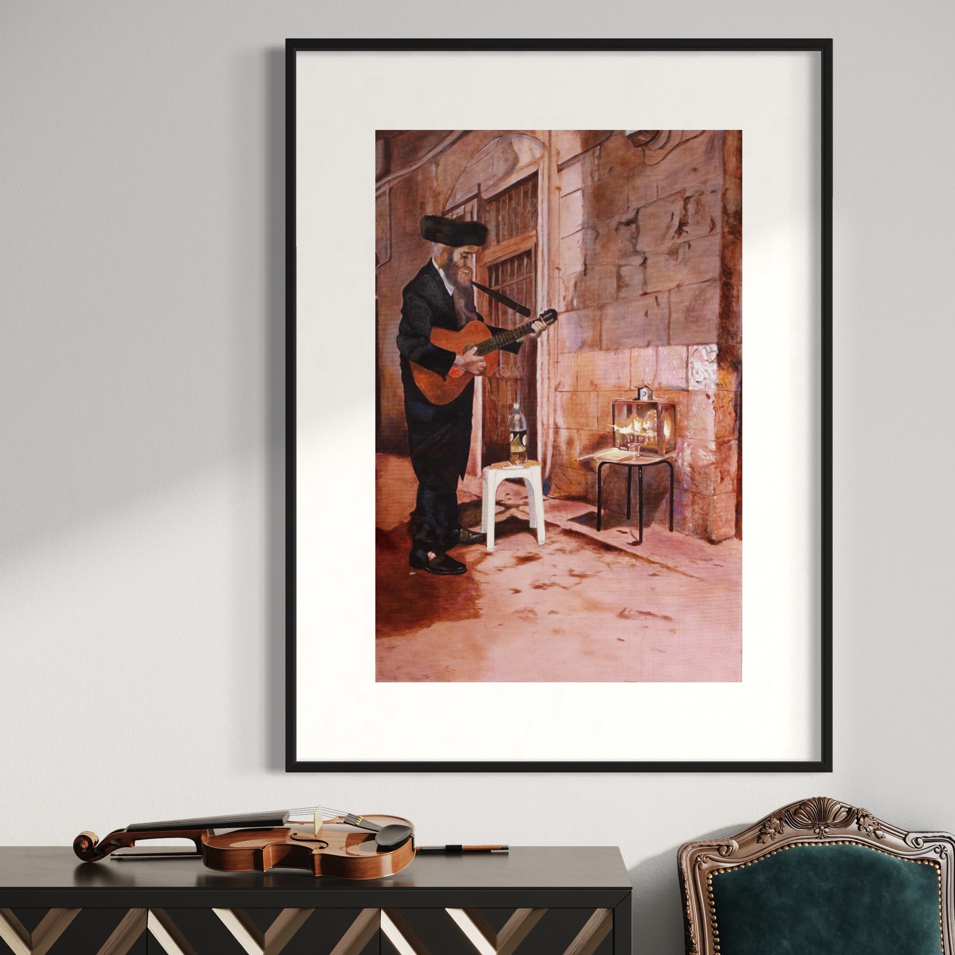 In the evocative painting "Hanukah" by Pinchas Bensusan, the warmth and radiance of the Festival of Lights illuminate the ancient streets of Jerusalem's Old City with an ethereal glow. Inspired by a chance encounter in his youth, where Pinchas captured a mesmerizing moment of a chossid playing his guitar with joy, before a menorah on Agrippas Street. This artwork seamlessly blurs the lines between reality and artistry. Recreated from a photograph that struck a chord with the artist's father, "Hanukah" captures not just the physical scene, but the intangible ambiance of joy and spirituality that permeates the air during this sacred holiday in Jerusalem. Through skillful brushwork, Bensusan transports viewers into the heart of the Old City, where the flickering flames of the menorah intertwine with the timeless traditions and ancient echoes of Hanukah celebrations past and present.