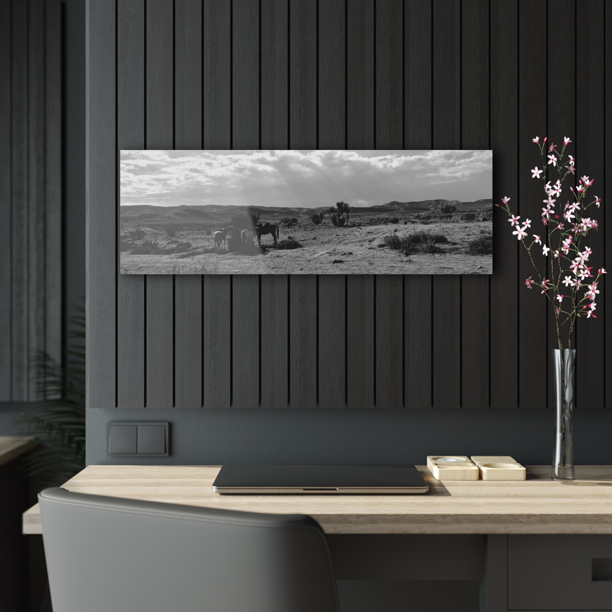 A breathtaking black-and-white panoramic view that reveals the serene stillness of the remote Judean Desert, "Hidden Oasis" captures a rare moment of tranquility. In the midst of the arid landscape, a group of horses rest from their travels.