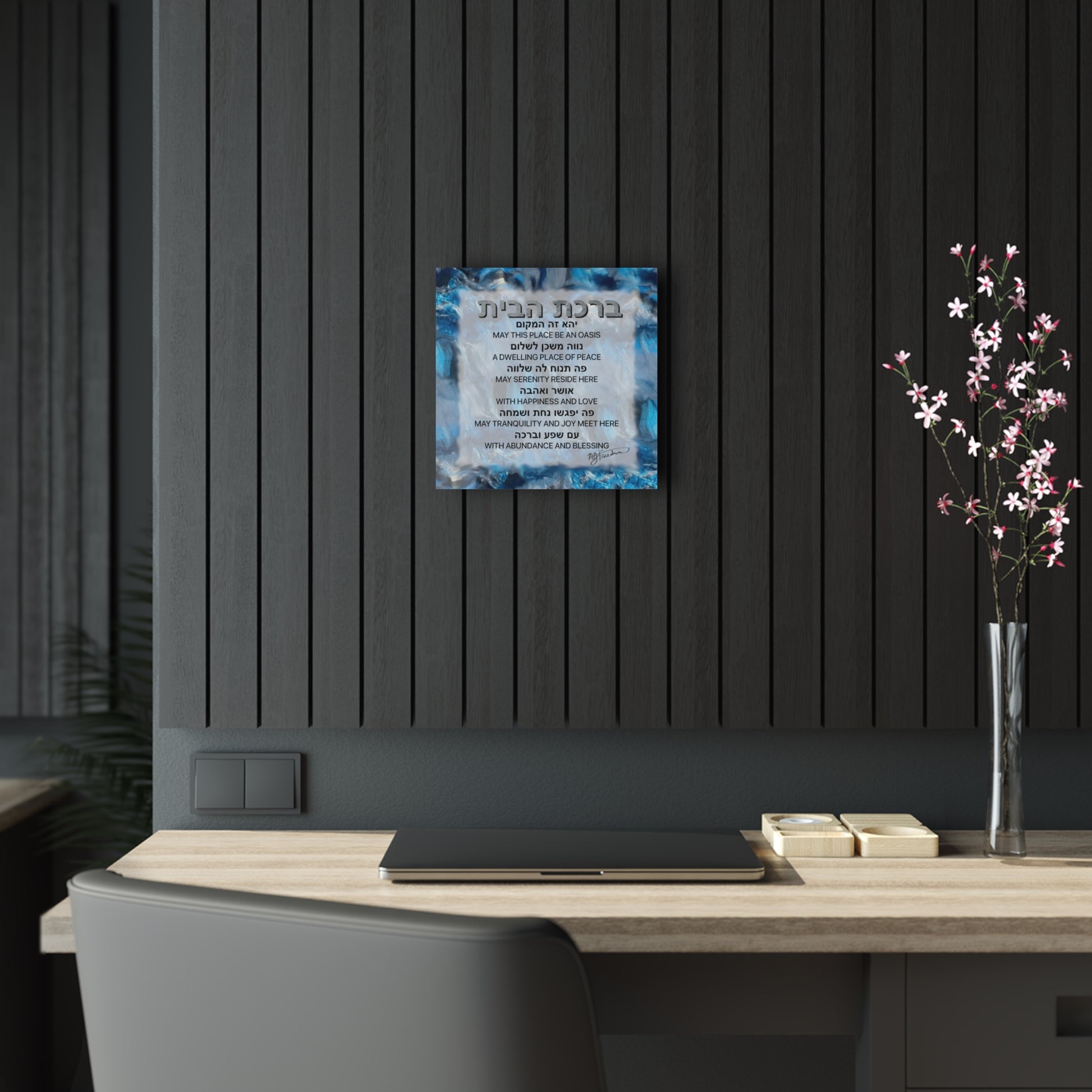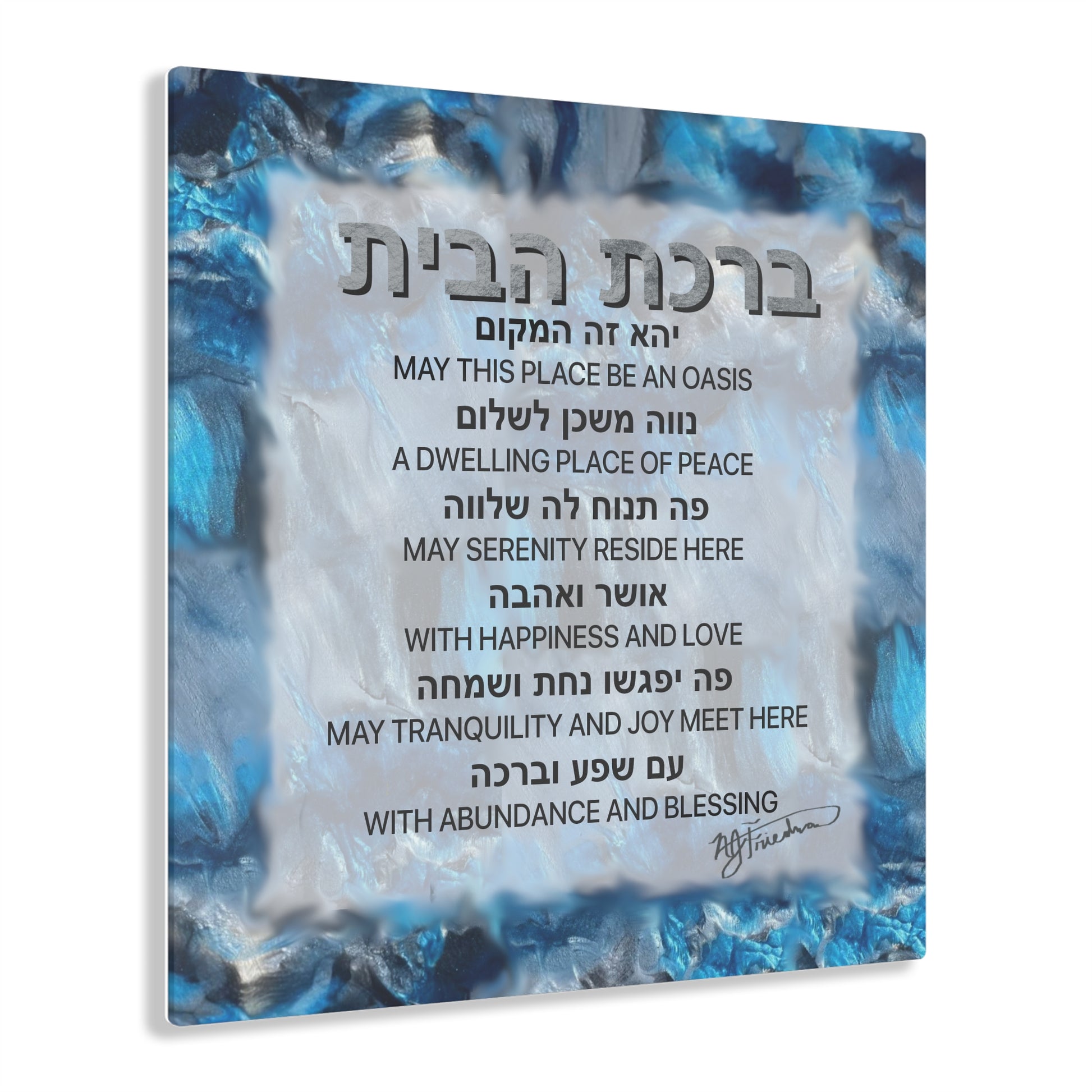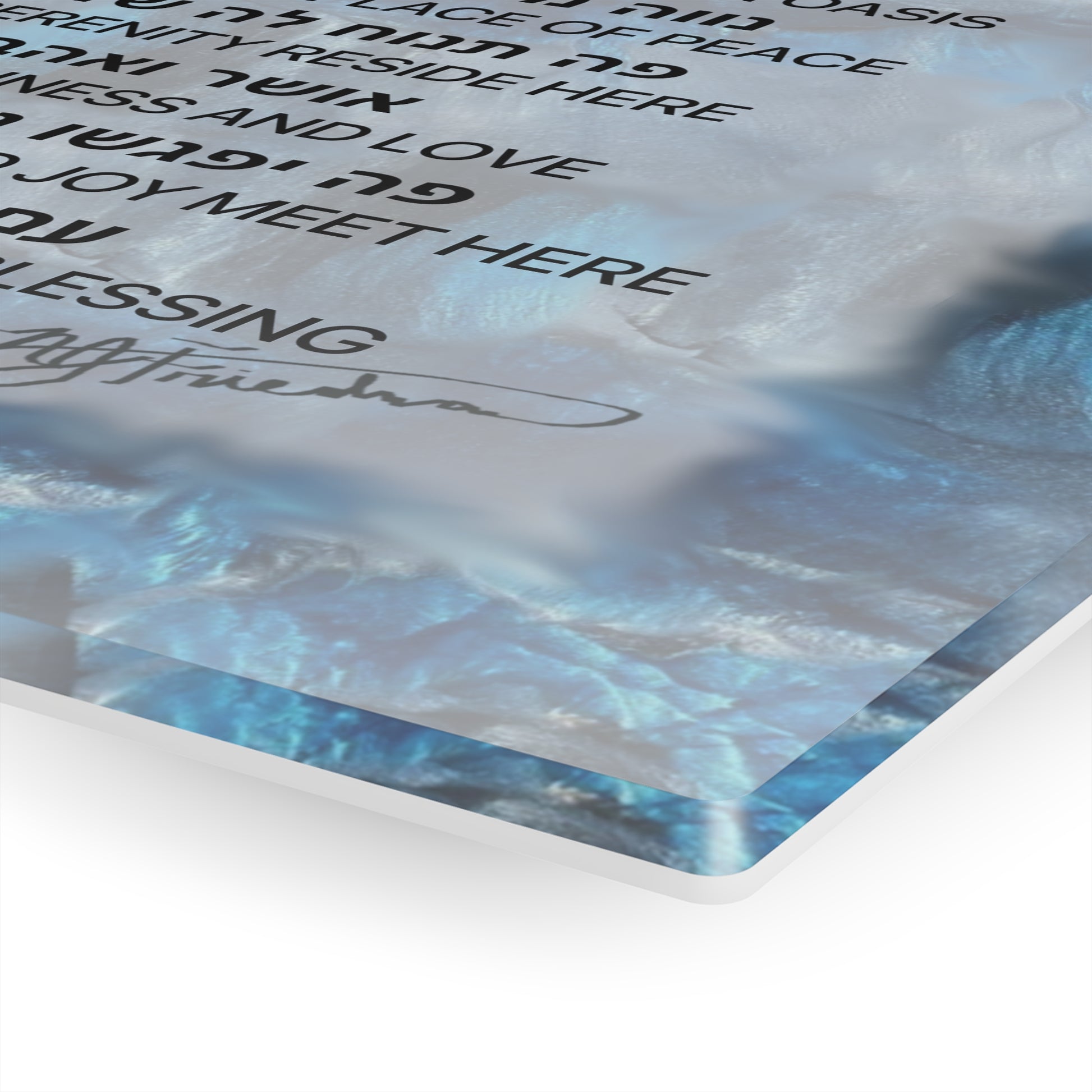 The heartfelt blessing, written in Hebrew and English amidst the fluid resin, evokes a sense of peace and love, making this glossy acrylic print a unique and meaningful addition to your home.