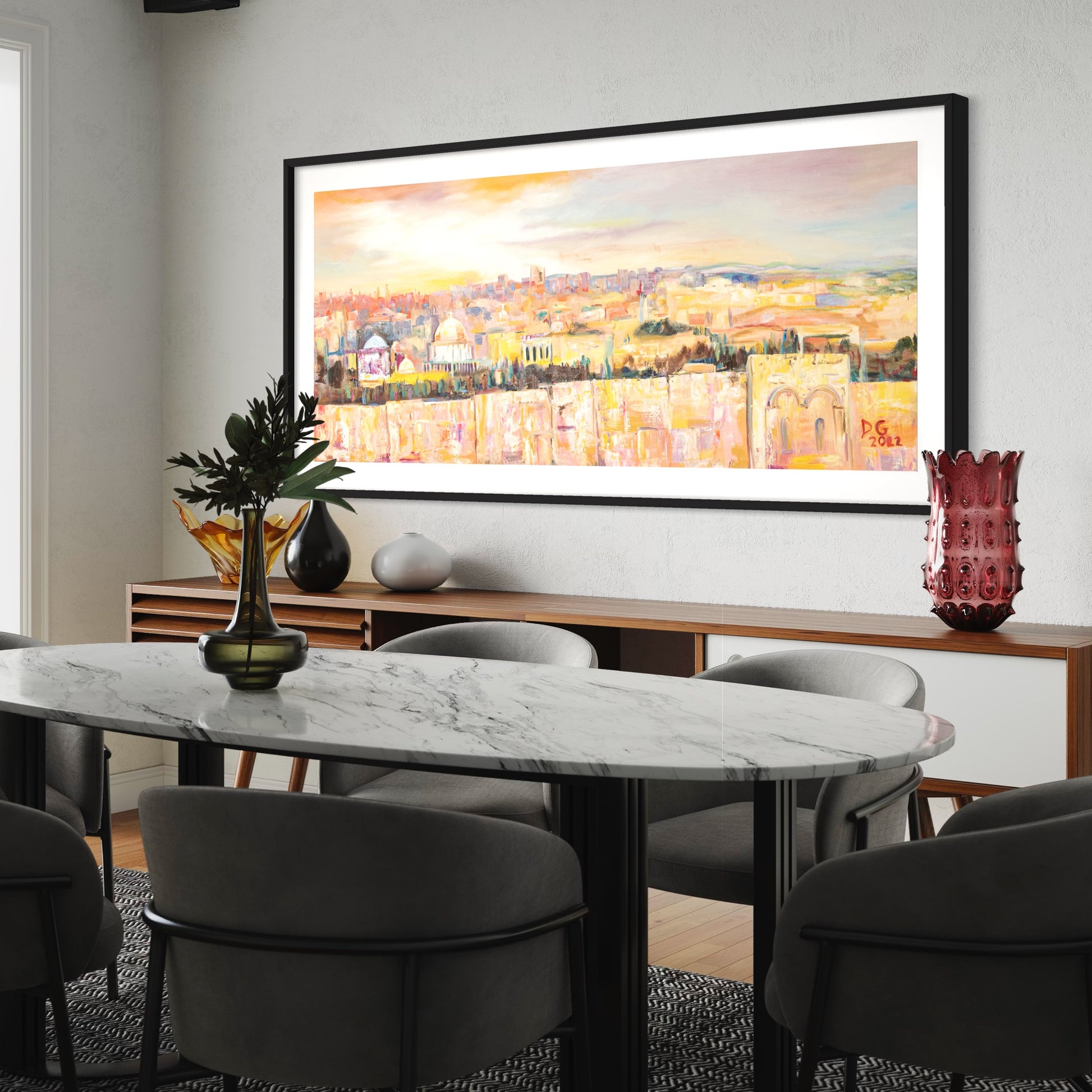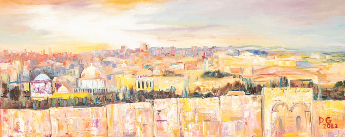 “Morning Light Over Jerusalem" by Dara Goldschmidt captures the serene beauty of Jerusalem bathed in the gentle glow of dawn. The soft pinks, yellows, and blues blend harmoniously, evoking a sense of peace and timelessness. This piece invites viewers to experience the city's tranquil mornings, offering a moment of reflection and connection to the heart of Jerusalem.