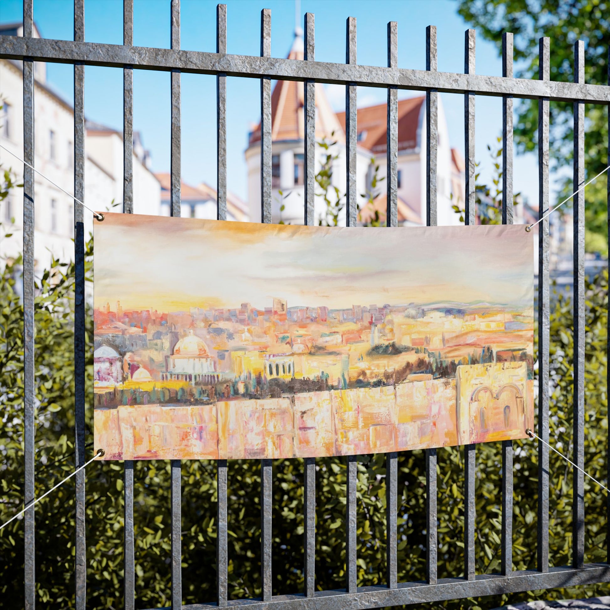 Transform your sukkah with the waterproof tapestry of Jerusalem Cityscape in Pastel Hues by Dara Goldschmidt. This captivating artwork beautifully captures the light of a serene sunrise glow on the Old City of Jerusalem. The sky is painted in soft shades of pinks and yellows, blending seamlessly to evoke the peaceful ambiance of sunrise. The entire city is aglow with a sacred, golden light, symbolizing the spiritual significance of this holy space. The interplay between the glowing stones and the tranquil sky creates a scene that inspires both contemplation and awe, making it the perfect addition to elevate your sukkah experience.