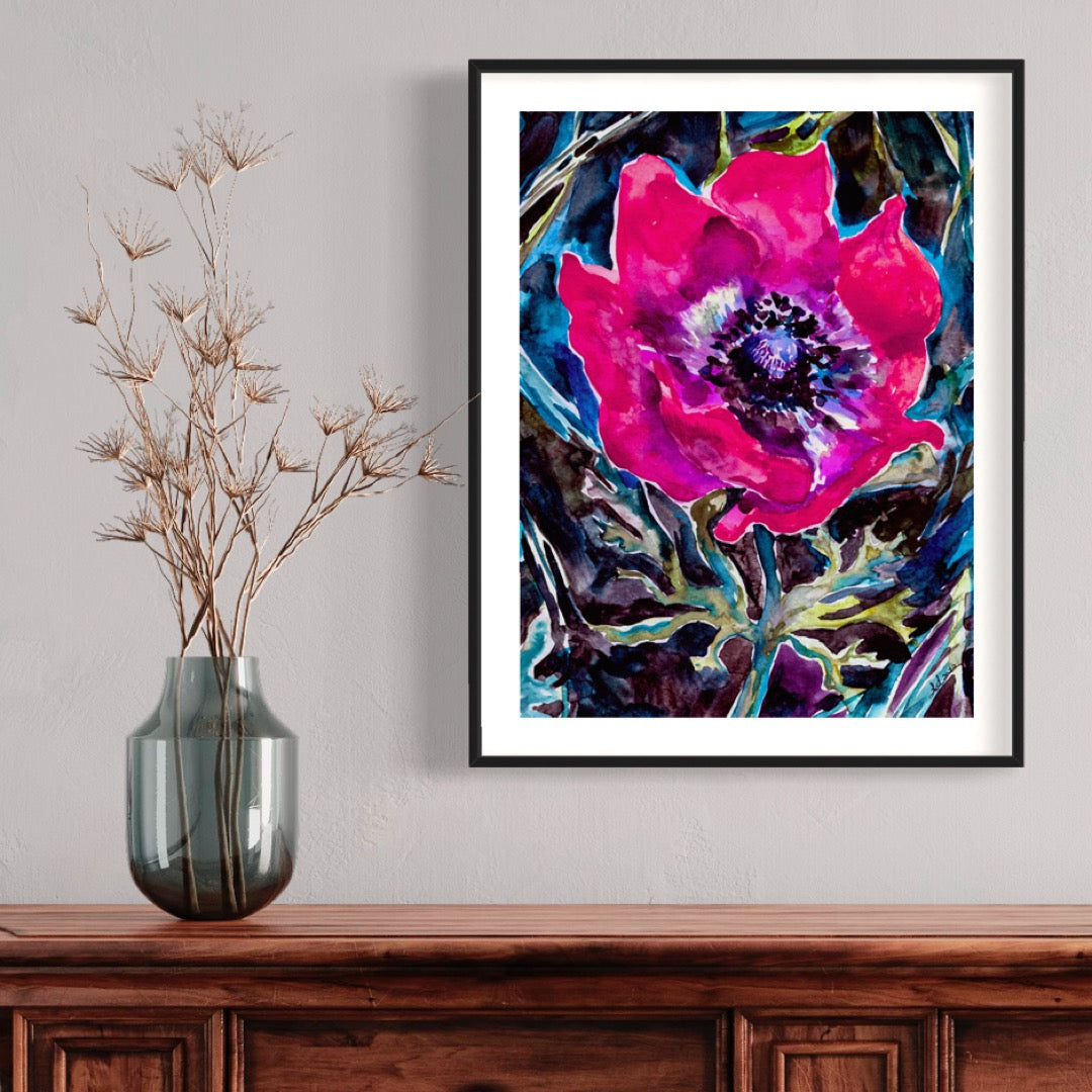 Paper: Giclée print of painting "Kalaniot Flower" on archival paper (Moab's Somerset Enhanced Velvet - with a slightly textured matte surface) with a 1/2" border.