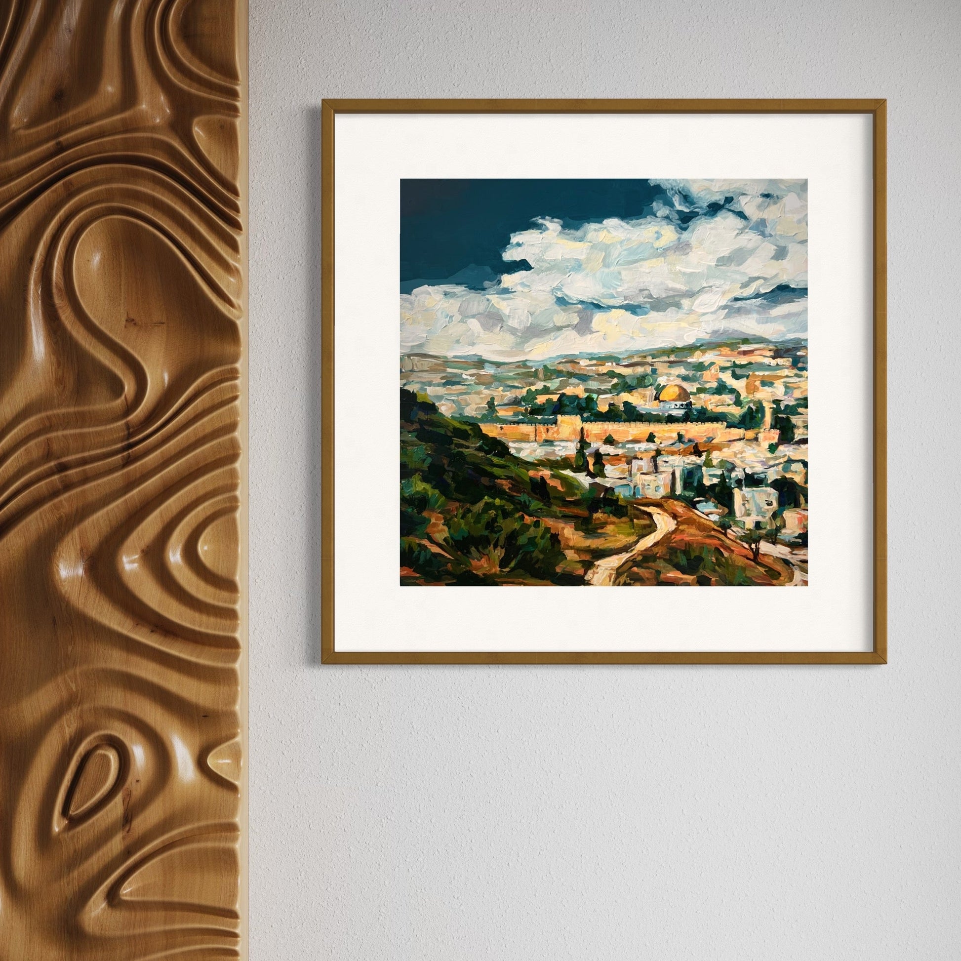 "Modern Pilgrimage," an acrylic painting on birch board by Leah Luria in 2023, is a visual ode to the timeless journey toward Jerusalem. The artwork depicts a winding road that has borne witness to the footsteps of countless pilgrims over millennia. Through Leah's brushwork, the scene comes alive, inviting viewers to contemplate the spiritual significance of this ancient city. The composition captures the enduring allure of Jerusalem, as if the very essence of the city calls out to the soul of each traveler. With each stroke, Leah eloquently conveys the profound connection between the modern pilgrim and the sacred path that leads to this holy destination.