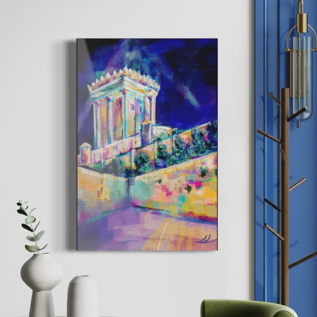 Night Vision: Beit Hamikdash III” by Leah Luria is a painting that explores themes of spiritual longing, hope, and redemption. It portrays the Third Temple glowing with ethereal light against a tranquil night sky, symbolizing our enduring emuna in its future reconstruction. The contrast between the radiant Temple and the dark sky reflects the idea of enlightenment emerging from darkness, evoking prophetic insight and the promise of a Messianic era. With its mystical atmosphere, the artwork invites viewers to engage in visualization as a tool for manifesting the dream of redemption, expressing a powerful message of emuna, hope, and spiritual renewal.