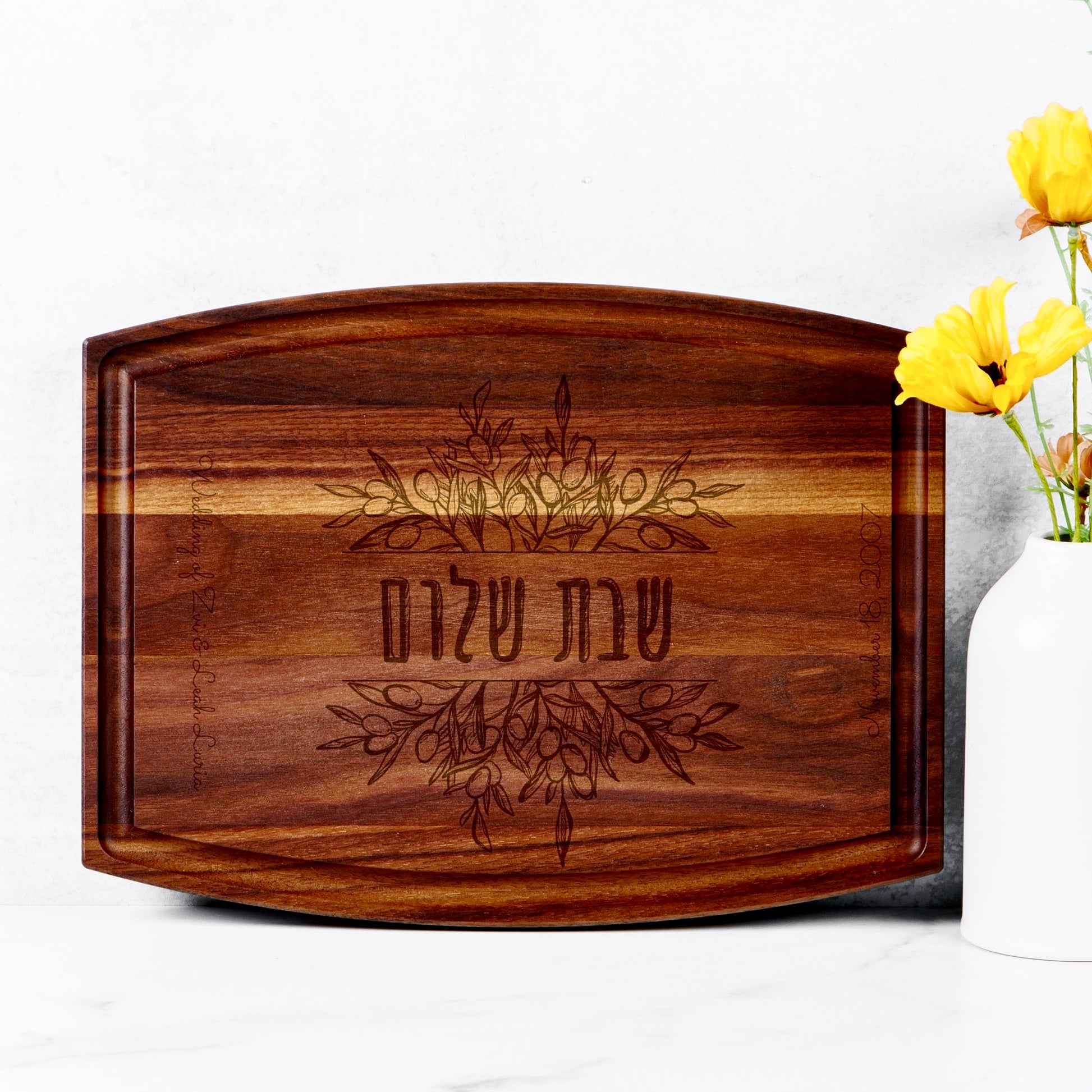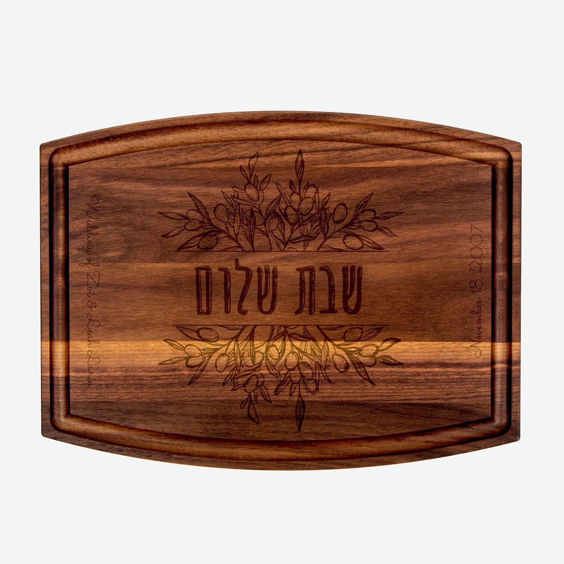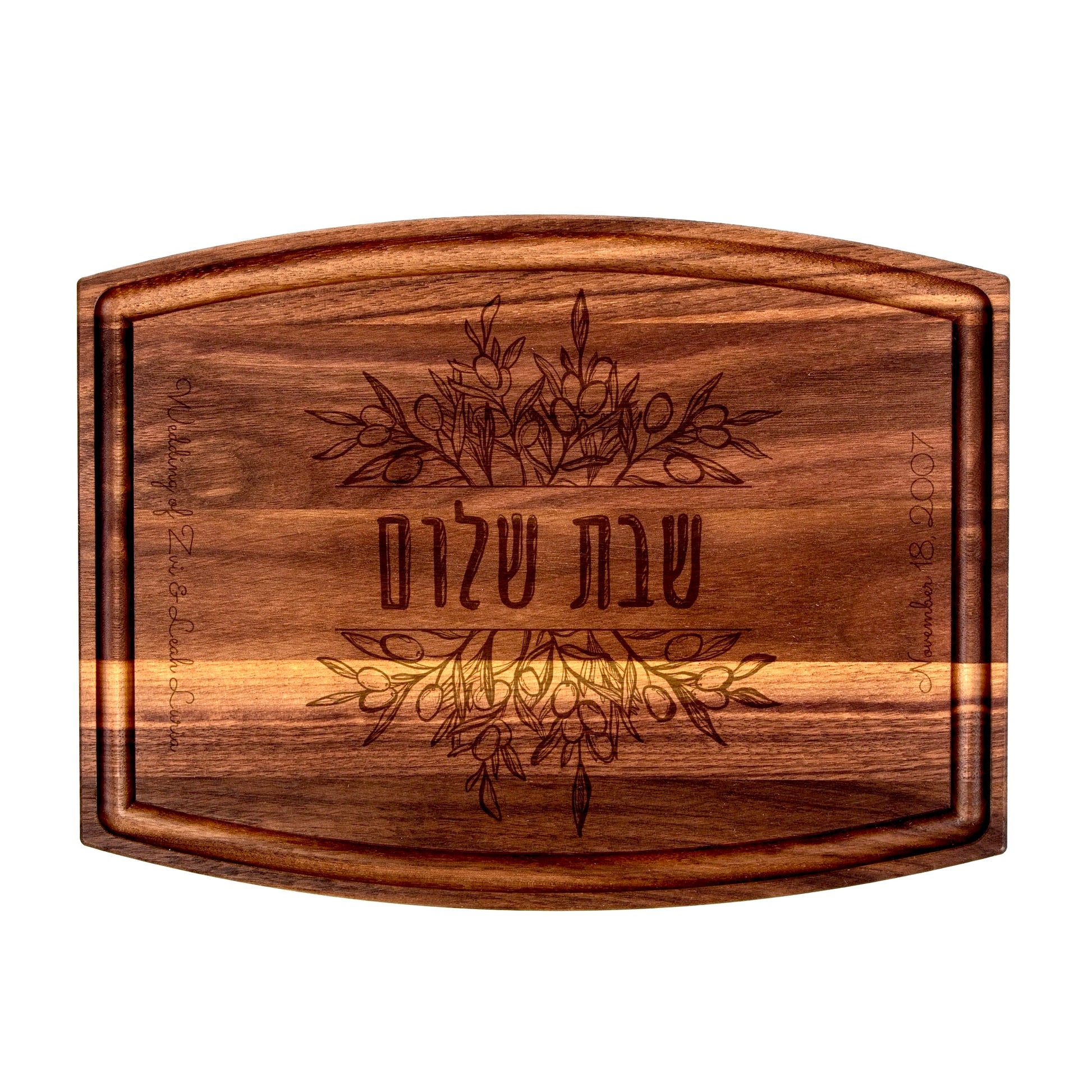 Olive Branches Personalized Challah Board Gift Arched Wooden Engraved Challah Board with Groove - 12" x 9"