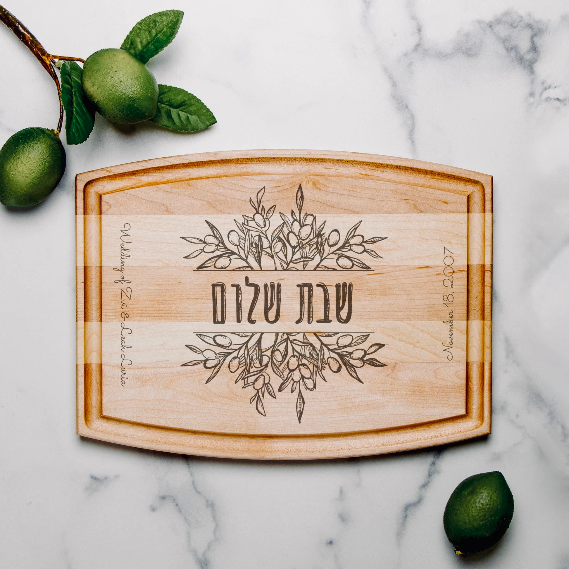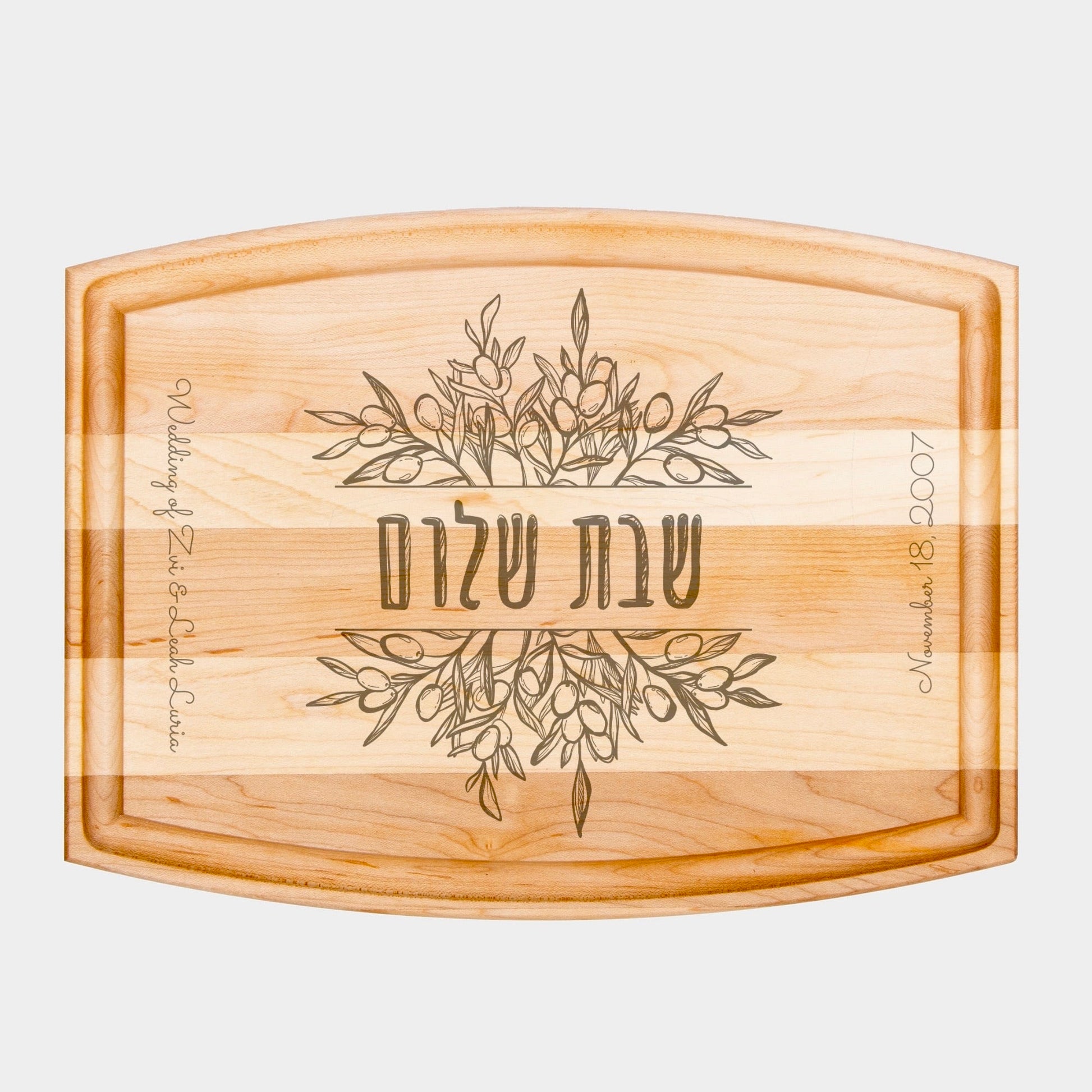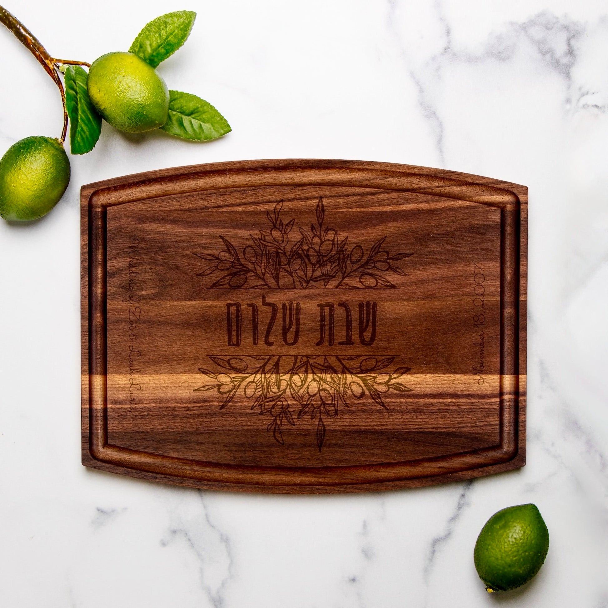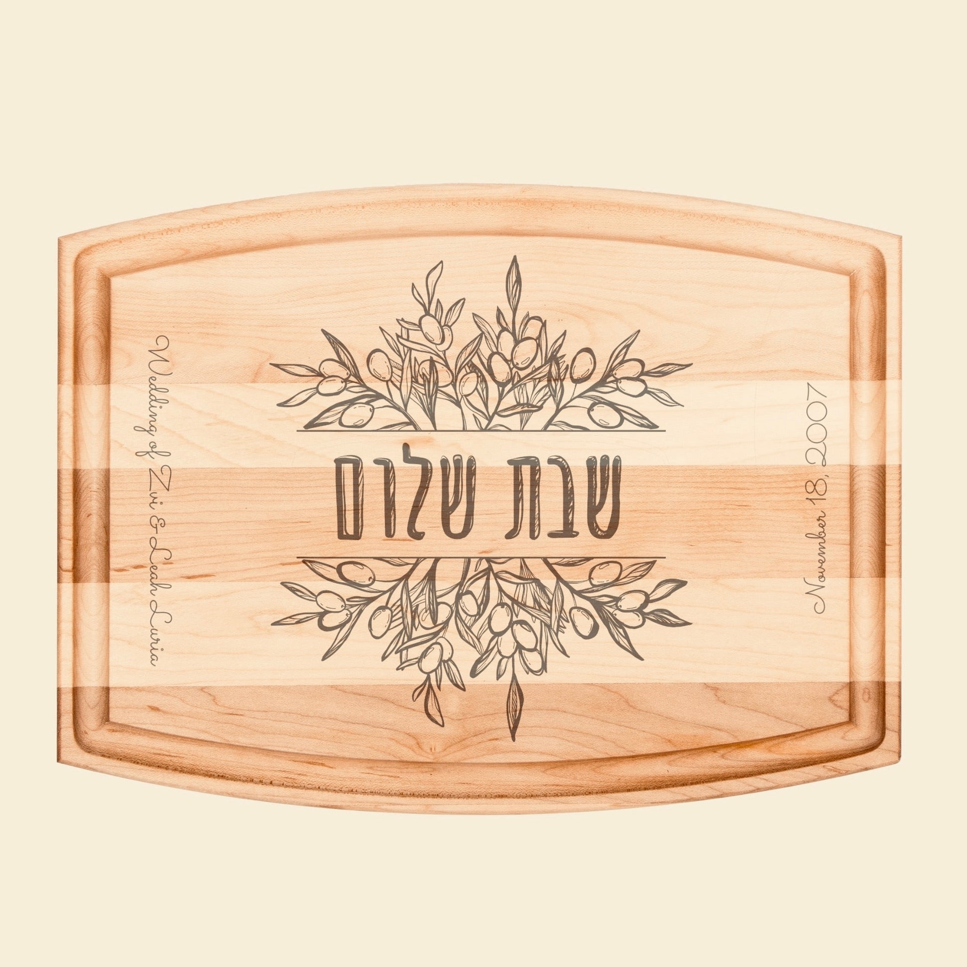 Olive Branches Personalized Challah Board Gift Arched Wooden Engraved Challah Board with Groove - 12" x 9"
