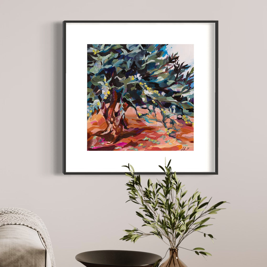 Immerse yourself in the lush colors, vibrant greens, and earthy tones that breathe life into this sacred Olive tree, one of the seven species that grow wild in Israel since Biblical times.