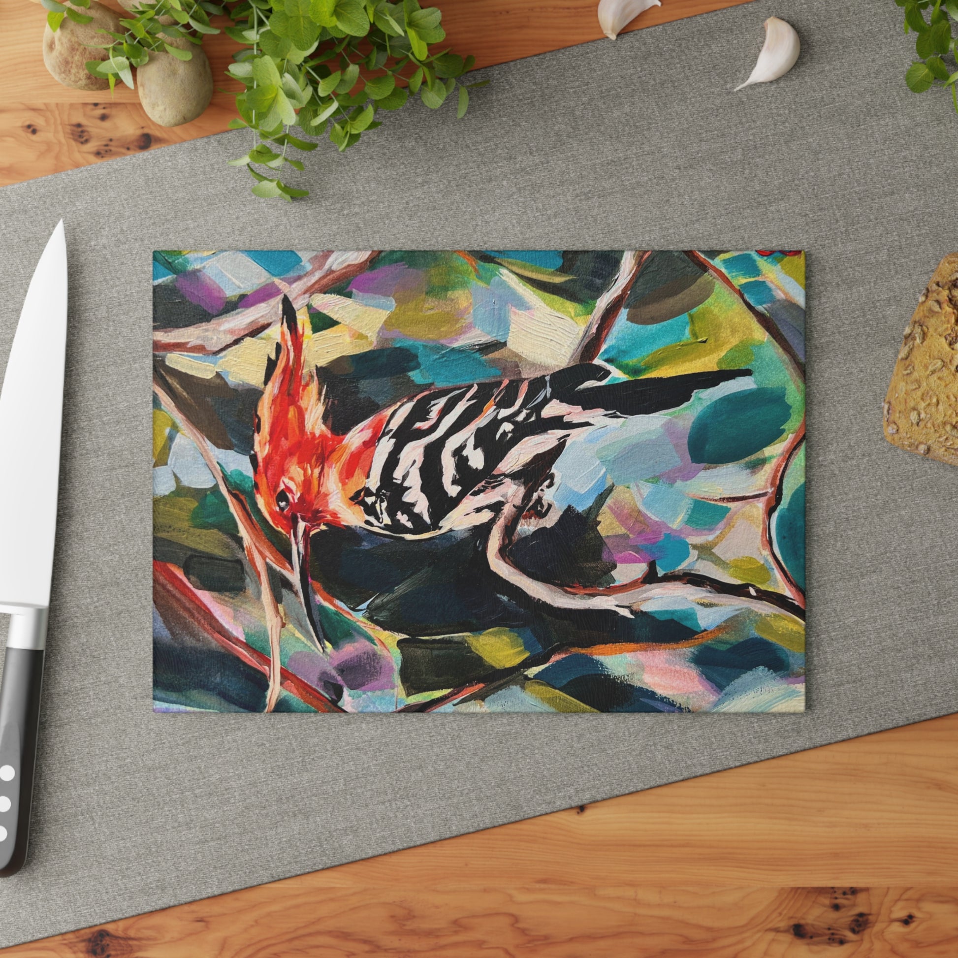 Introducing the captivating Glass Cutting Board adorned with the majestic Hoopoe bird, Israel's national treasure. Prepare to be enchanted as painterly strokes and vibrant colors grace your kitchen, bringing the beauty of nature indoors.