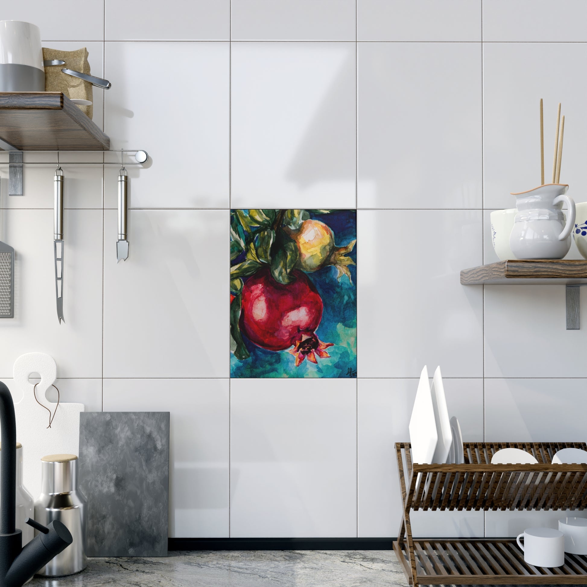 Elevate your kitchen design with this gorgous custom tile, printed with a whimisical watercolor painting of pomegranates. Choose between a glossy or a matte finish and enjoy the full-color image reproduction for all your artwork.