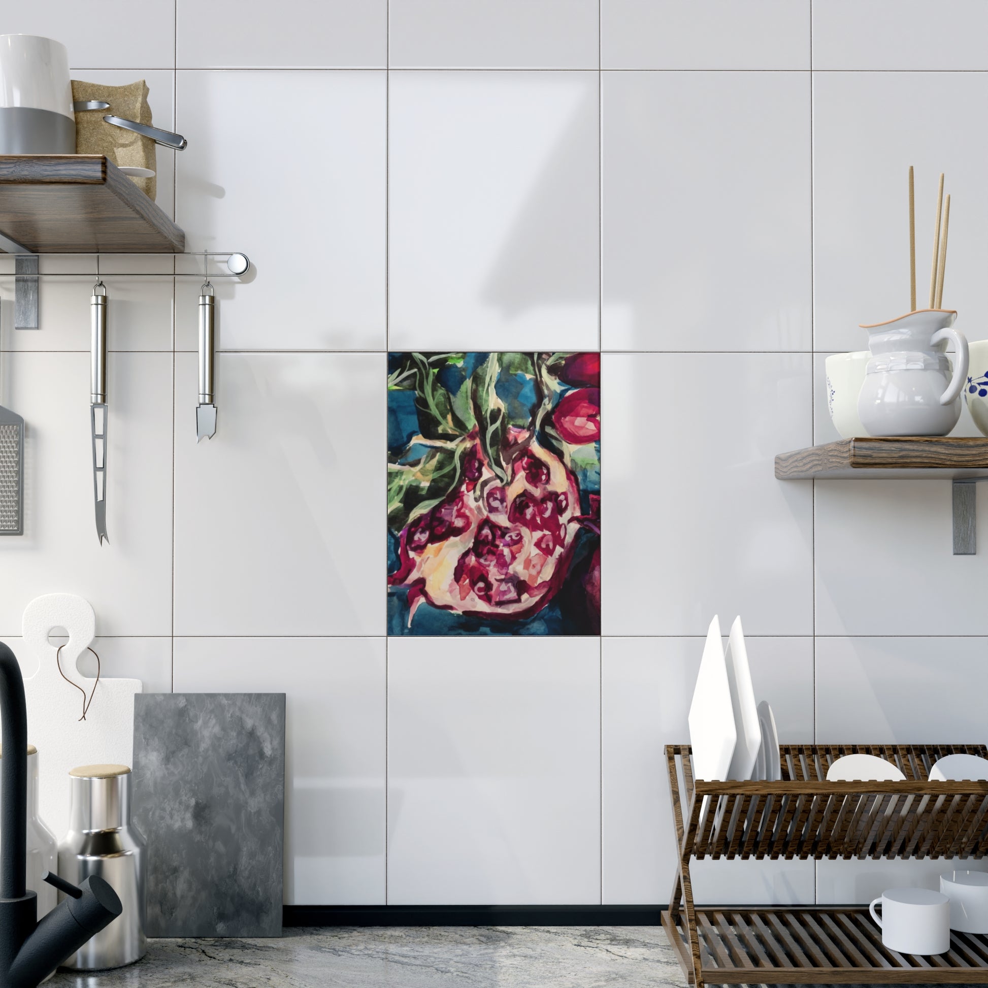 Elevate your kitchen design with this gorgous custom tile, printed with a whimisical watercolor painting of pomegranates. Choose between a glossy or a matte finish and enjoy the full-color image reproduction for all your artwork.