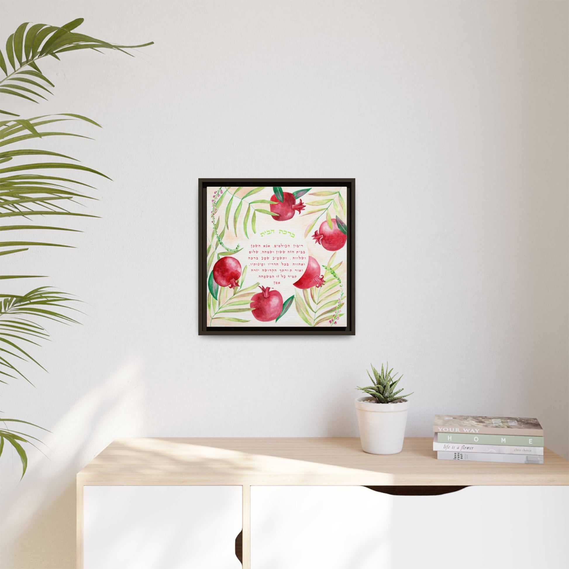 Keywords: Pomegranate home blessing, Birkat HaBayit, framed Jewish wall art, Hebrew home blessing, Avigael Tondowski, Judaica canvas print, modern Jewish home decor, watercolor pomegranates, Israel art, Jewish wedding gift, Hebrew blessing art, eco-friendly framed art.