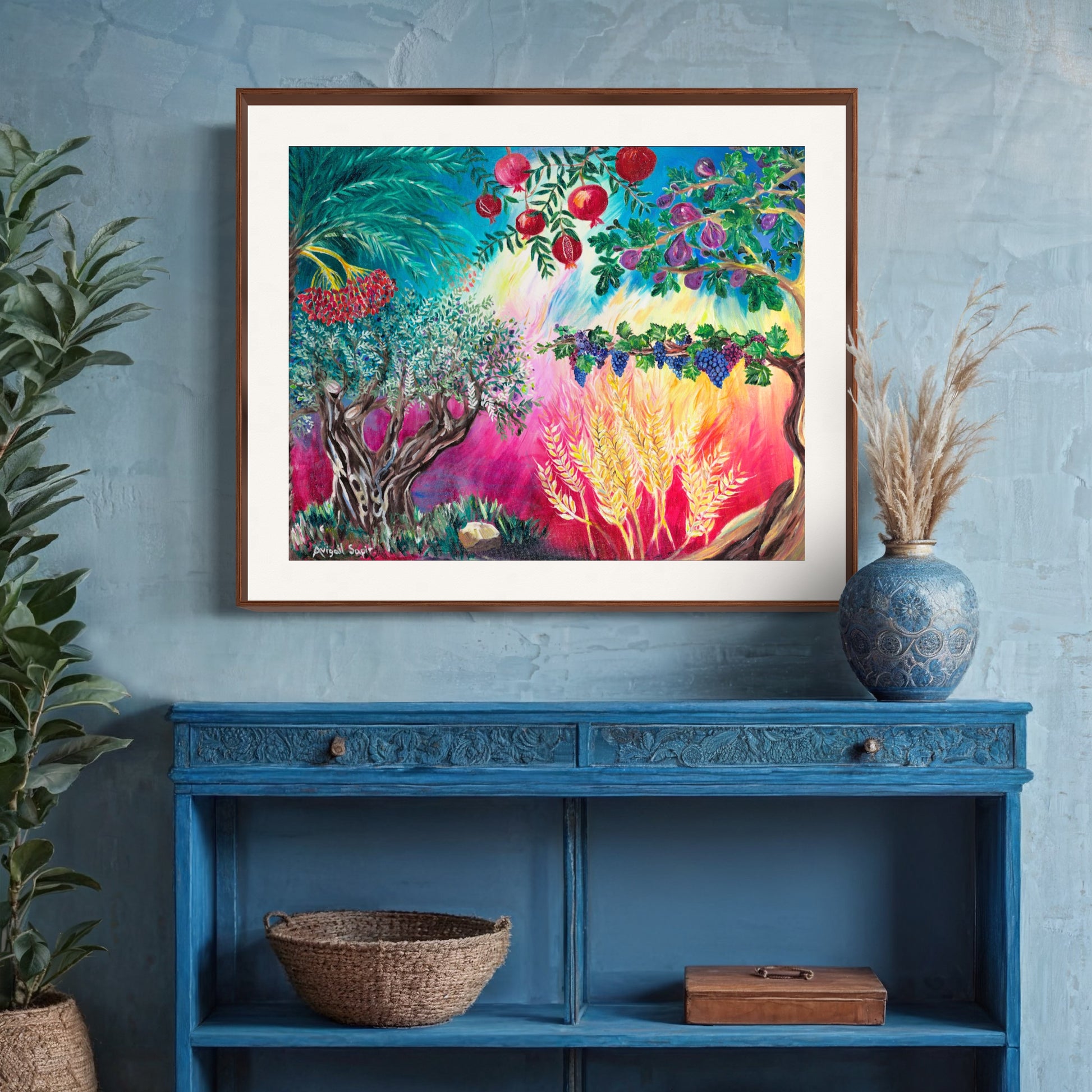 Embrace Israel's sacred bounty with "Seven Species" by Avigail Sapir, a painting that invites you to savor the essence of the Holy Land in every brushstroke. This captivating print isn't just a visual feast—it's a connection to tradition, to history, to the very roots of Jewish culture. With each luscious date, fig, pomegranate, grape, olive, wheat, and barley meticulously rendered, you'll feel the warmth of Israel's sun and the richness of its soil right in your own home. Taste the flavors of Tu B'Shvat year-round with "Seven Species," a painting that promises to transform your surroundings into a sanctuary of abundance. Immerse yourself in the timeless beauty and significance of Israel's sacred fruit.