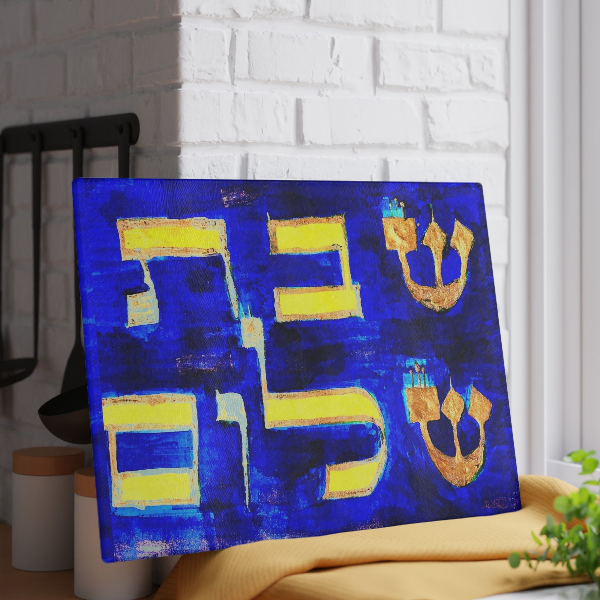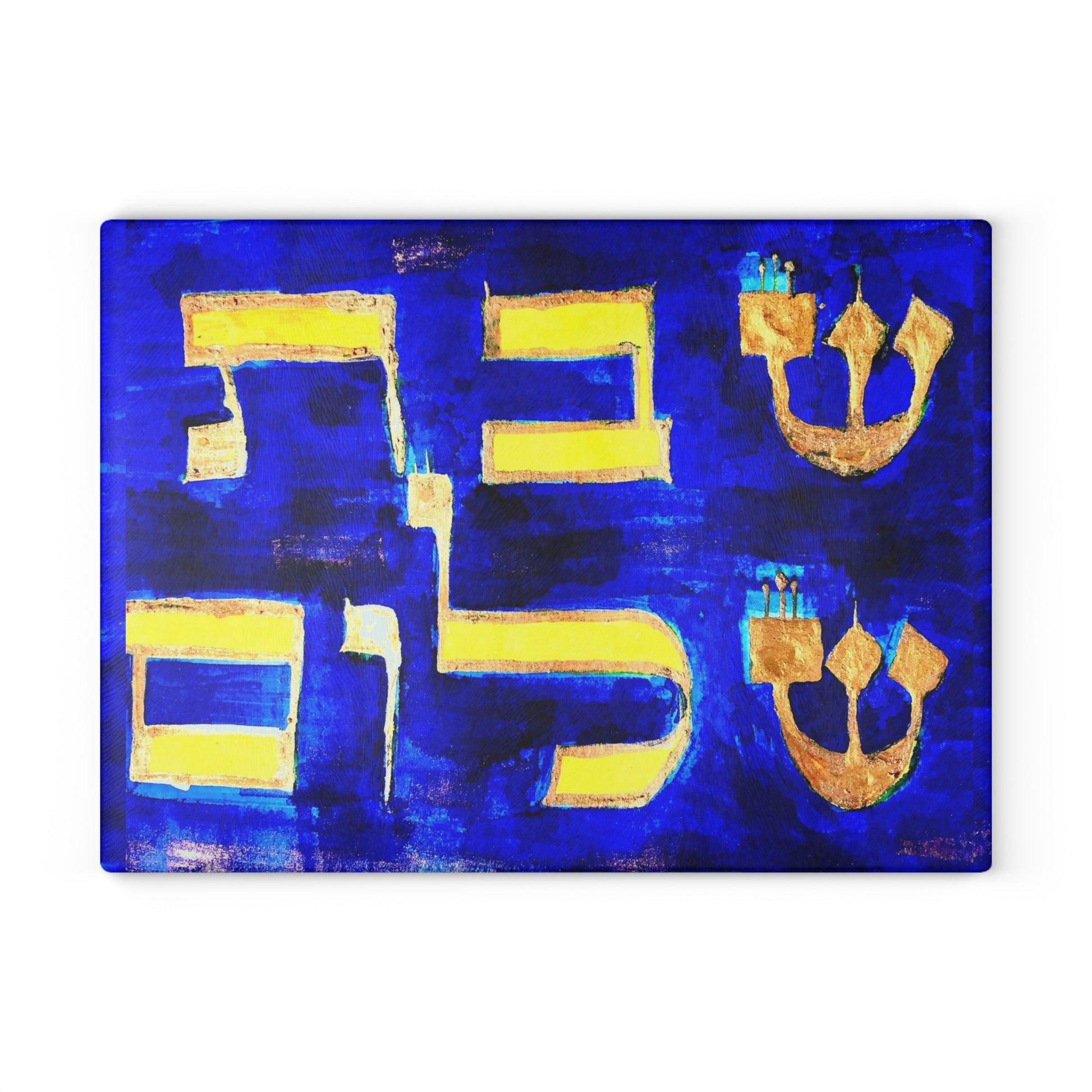 Elevate your Shabbat experience with the exceptional "Shabbat Shalom" custom Challah Board by Dov Laimon. This glass board is a masterpiece of modern artistry and ancient scribal arts, showcasing Dov's signature aesthetic. The meticulously designed piece features a rich interplay of colors, with striking cobalt blue and deep yellow tones creating a visually captivating harmony. Crafted from high-quality materials, this challah board not only enhances your Shabbat rituals but also serves as a stunning centerpiece to your Shabbat table, seamlessly blending tradition and contemporary elegance. Add a touch of artistic sophistication to your Shabbos with the "Shabbat Shalom" Challah Board by Dov Laimon.