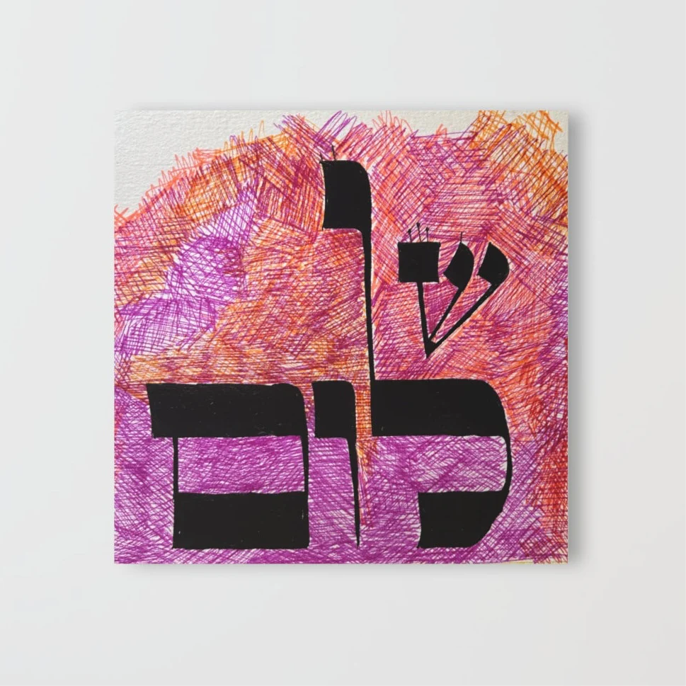 "Shalom," a captivating artwork by Dov Laimon, serves as an invocation of peace and harmony. With his signature mastery of Hebrew caligraphy and vibrant hues of pink crosshatchings, Dov's artwork is a call to the heavens. It is a visual meditation for peace, both on Earth and within the sanctity of our homes and souls. The sacred Hebrew letters woven intricately into the piece not only spell "Shalom," the Hebrew word for peace, but also symbolize one of God's names, infusing the artwork with divine significance. Through this fusion of art and spirituality, Laimon invites viewers to contemplate the power of manifesting peace within ourselves and spreading it throughout the world, fostering a collective consciousness of tranquility and unity.