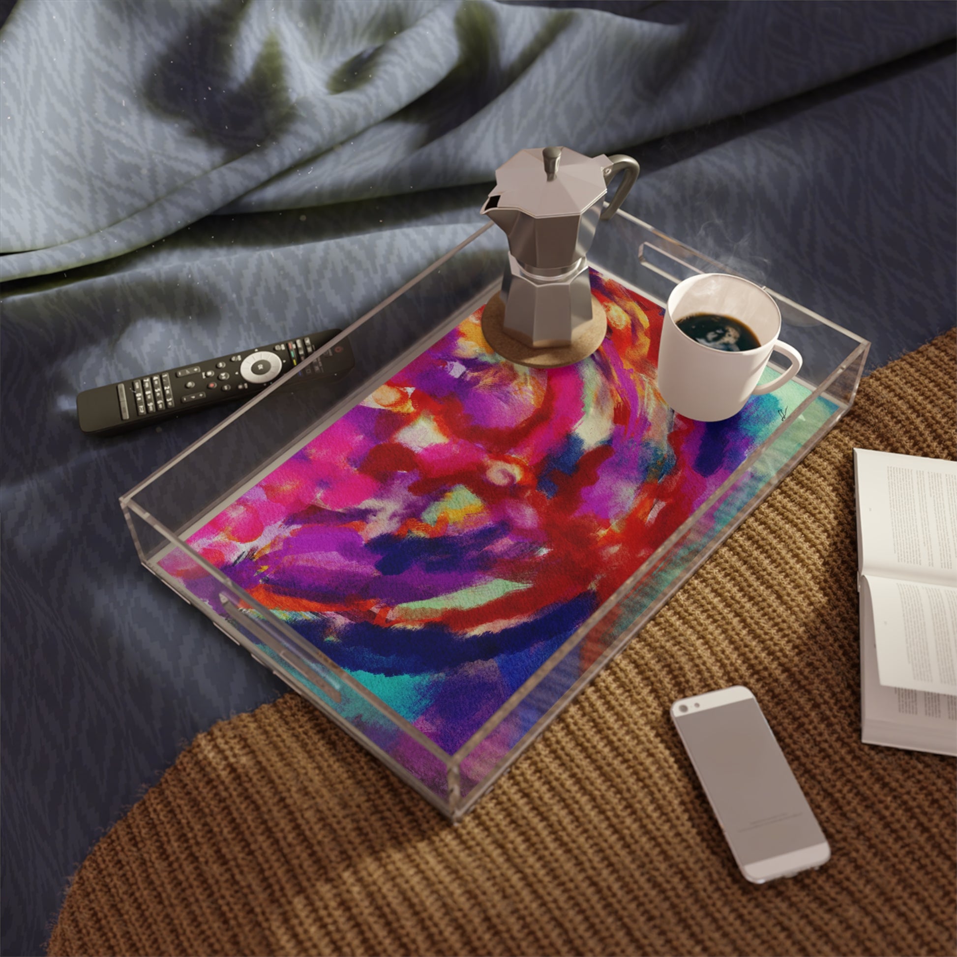 Introducing the beautiful acrylic dreidel serving tray featuring Leah Luria's vibrant painting of a menorah. This versatile tray serves as an ideal surface for spirited dreidel games or serving delicious sufganiyot, providing the perfect setting for family and friends to gather and enjoy the festivities. Beyond its functional allure, this tray transforms into a serving masterpiece, presenting an elegant stage for Chanukah goodies and gelt.