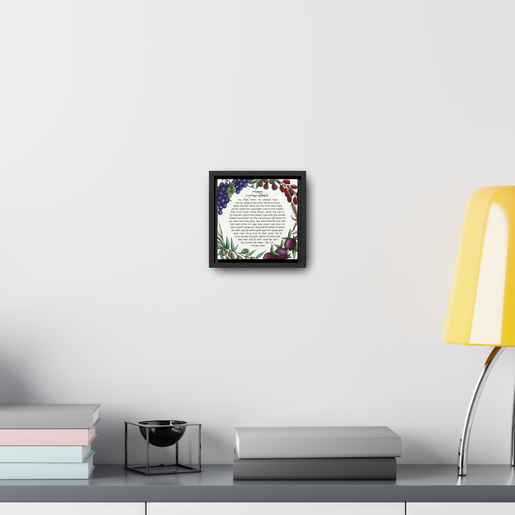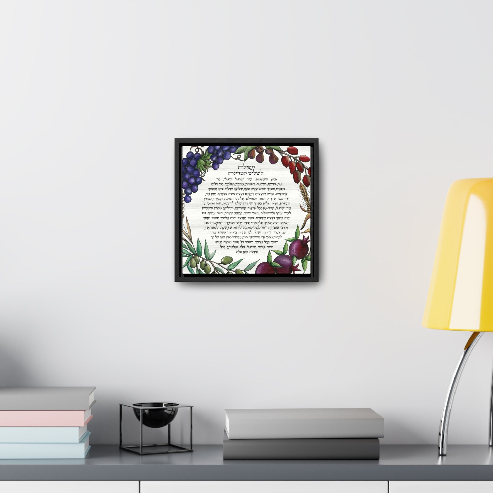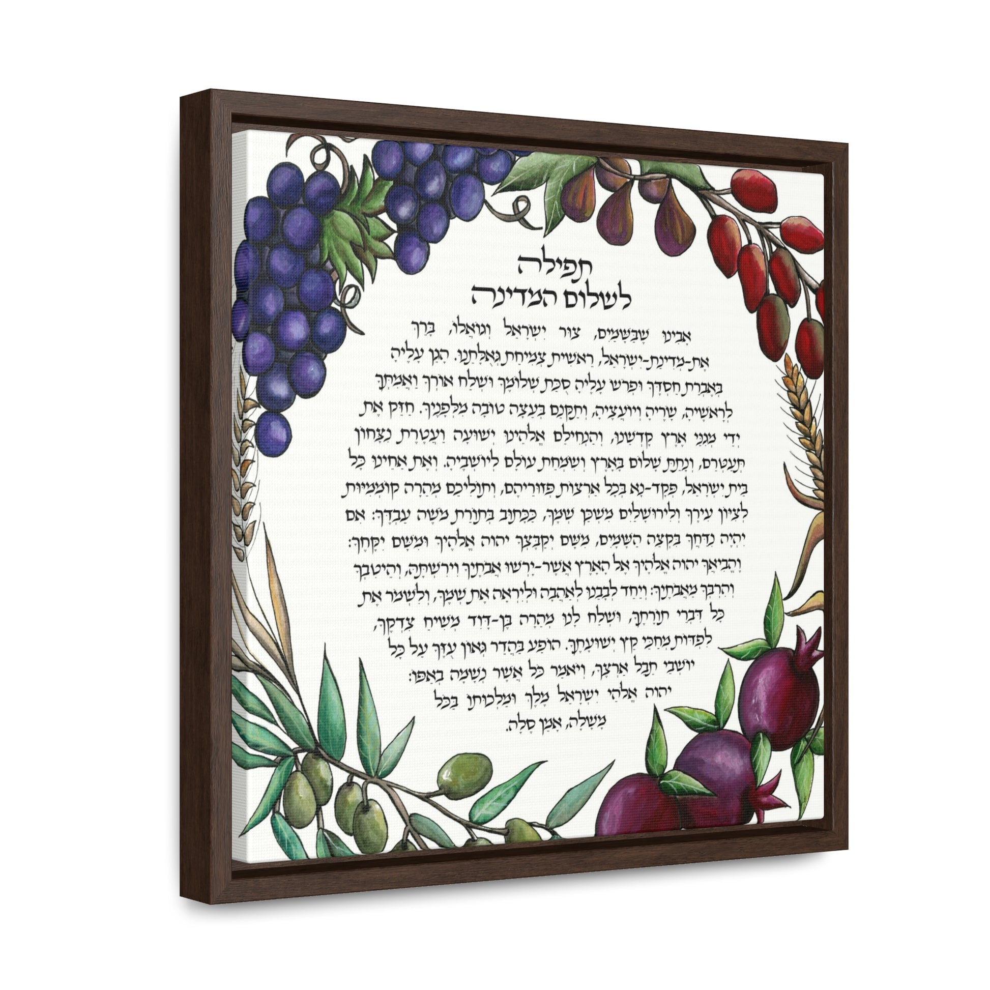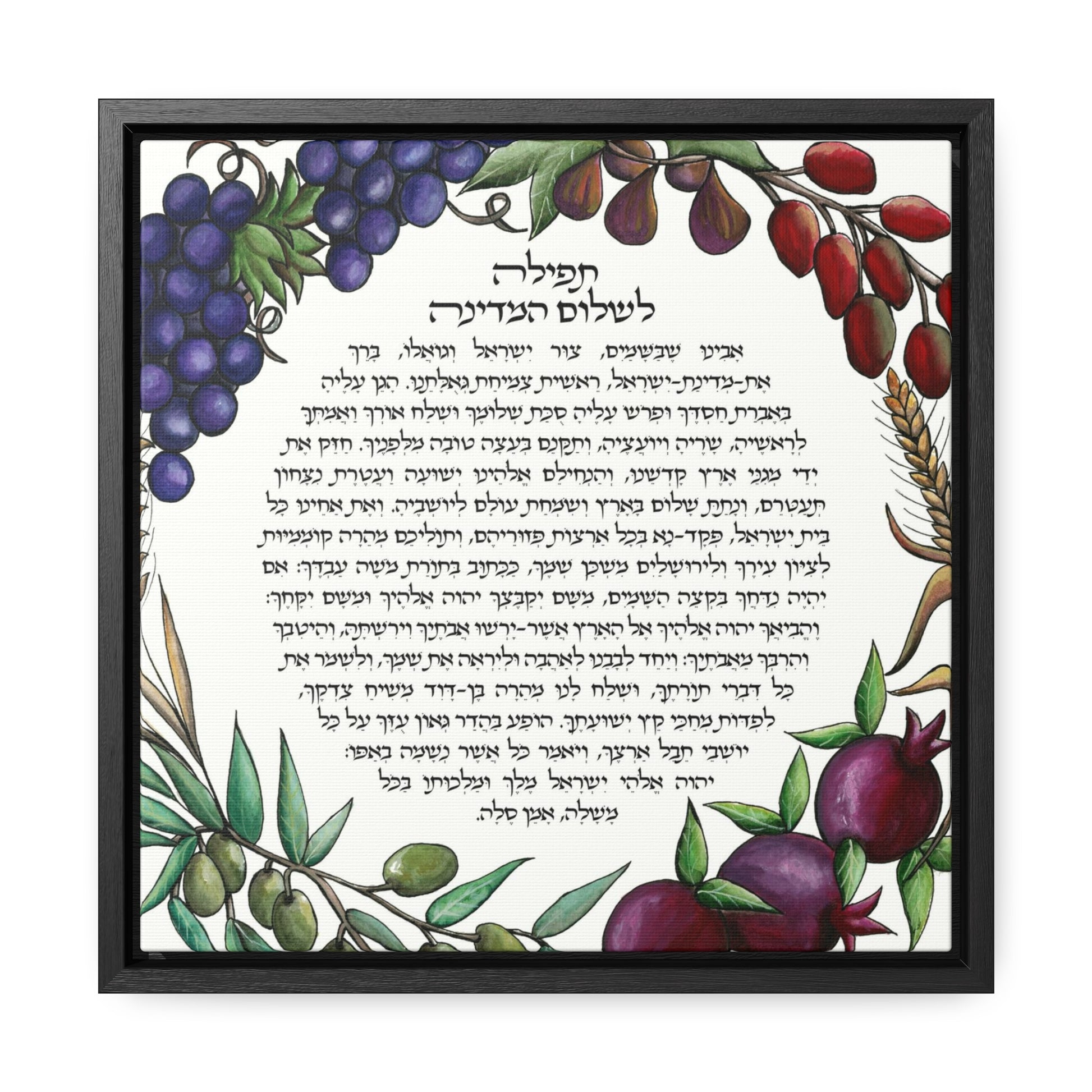 Surrounding the prayer, the canvas is adorned with the seven species, each carefully rendered to represent the bounty and blessings of the Holy Land. Pomegranates, dates, olives, figs, wheat, barley, and spelt form a lush tapestry, symbolizing abundance and prosperity. Shira Gabriela's artistry combines visual richness with spiritual depth, making this piece a powerful reminder of the enduring desire for peace in the sacred land of Israel. Displayed in a square frame, this gallery-wrapped canvas becomes not just a work of art but a source of inspiration and reflection.