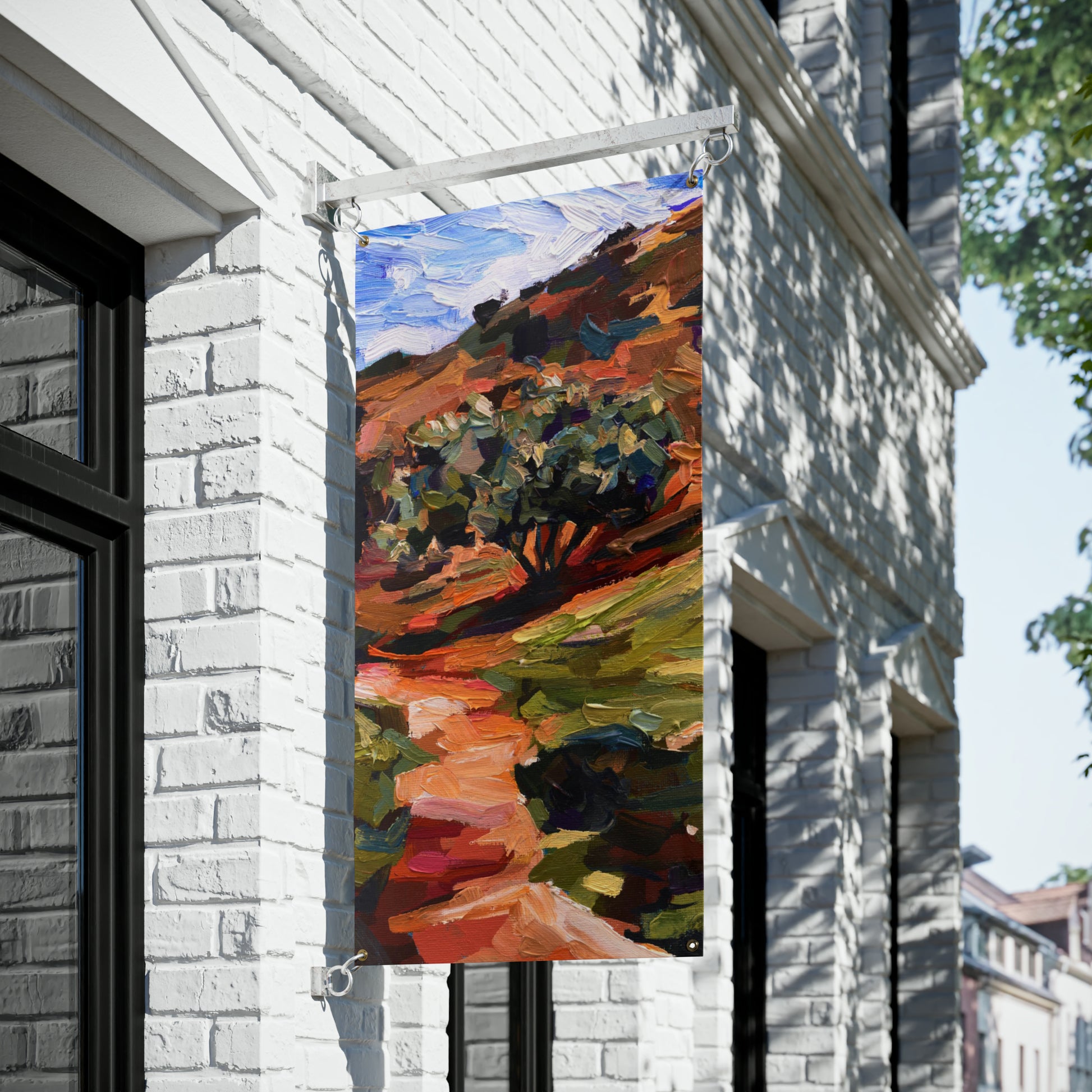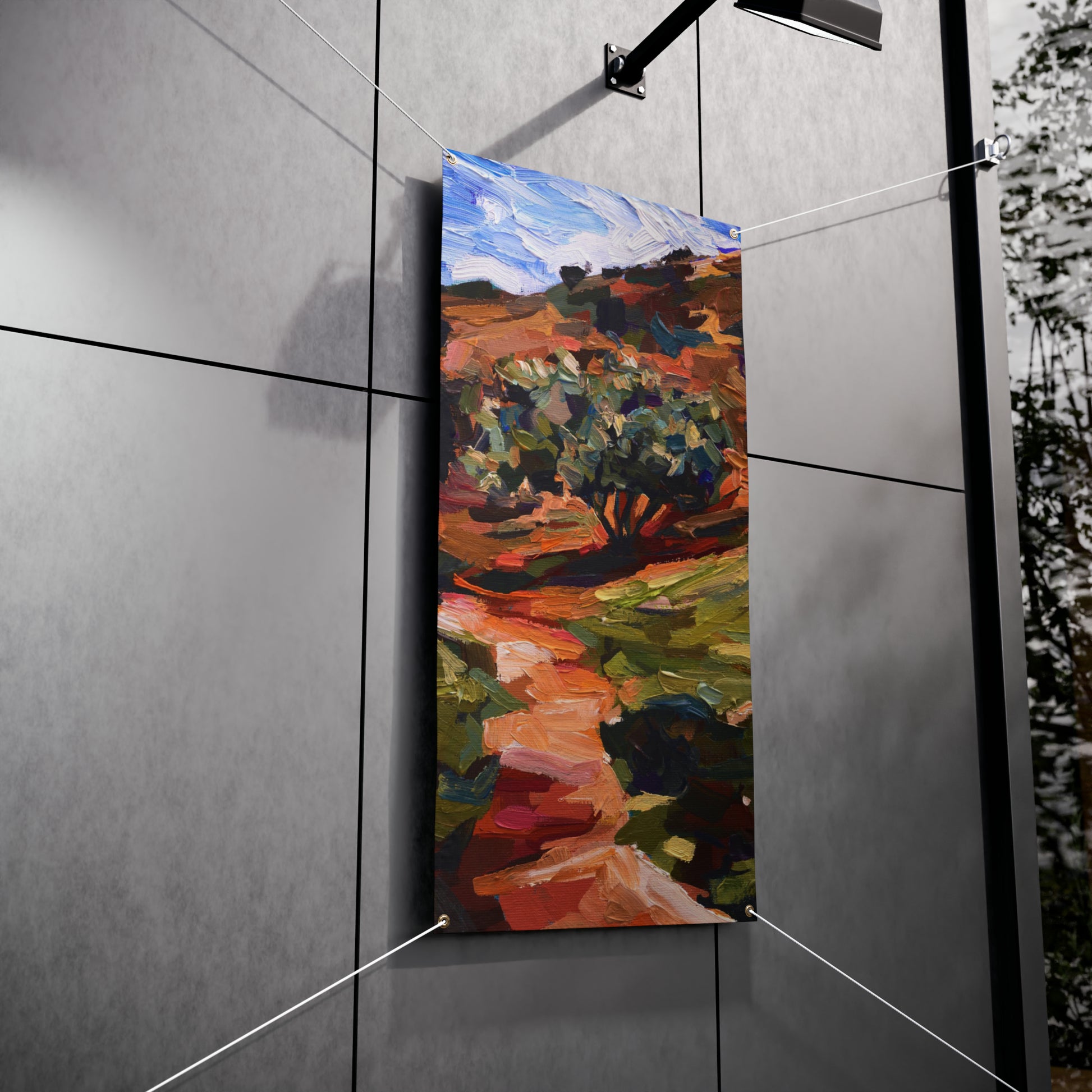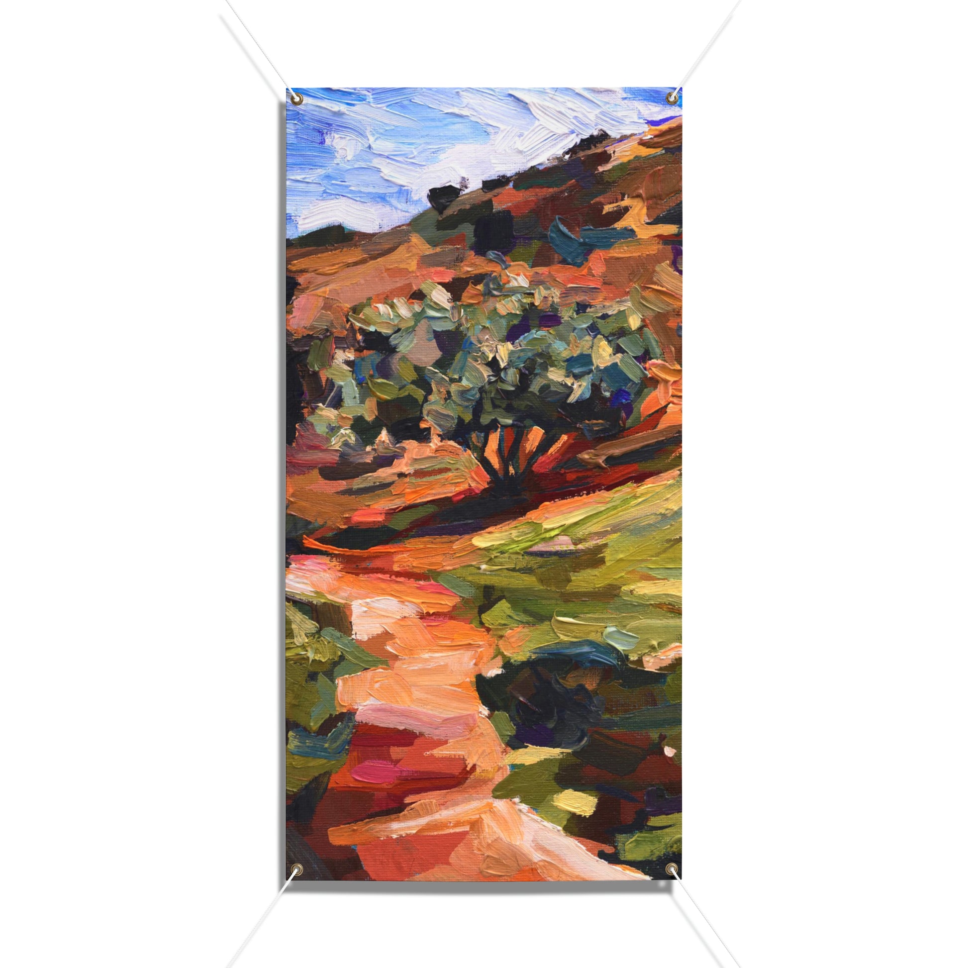 With the essence of the original painting, this sukkah tapestry brings to life the dirt road that unfolds before the viewer's eyes, mirroring the trails we traverse with each step. The ancient olive tree stands as a silent sentinel, its significance echoing through time—an emblem of strength, resilience, and the intricate connections to heritage and land. As if touched by the whispering winds of history, a small hidden path beckons behind the tree, inviting the adventurous spirit to explore the less-traveled route—a subtle tribute to Robert Frost's poignant lines from his poem "The Road Not Taken."