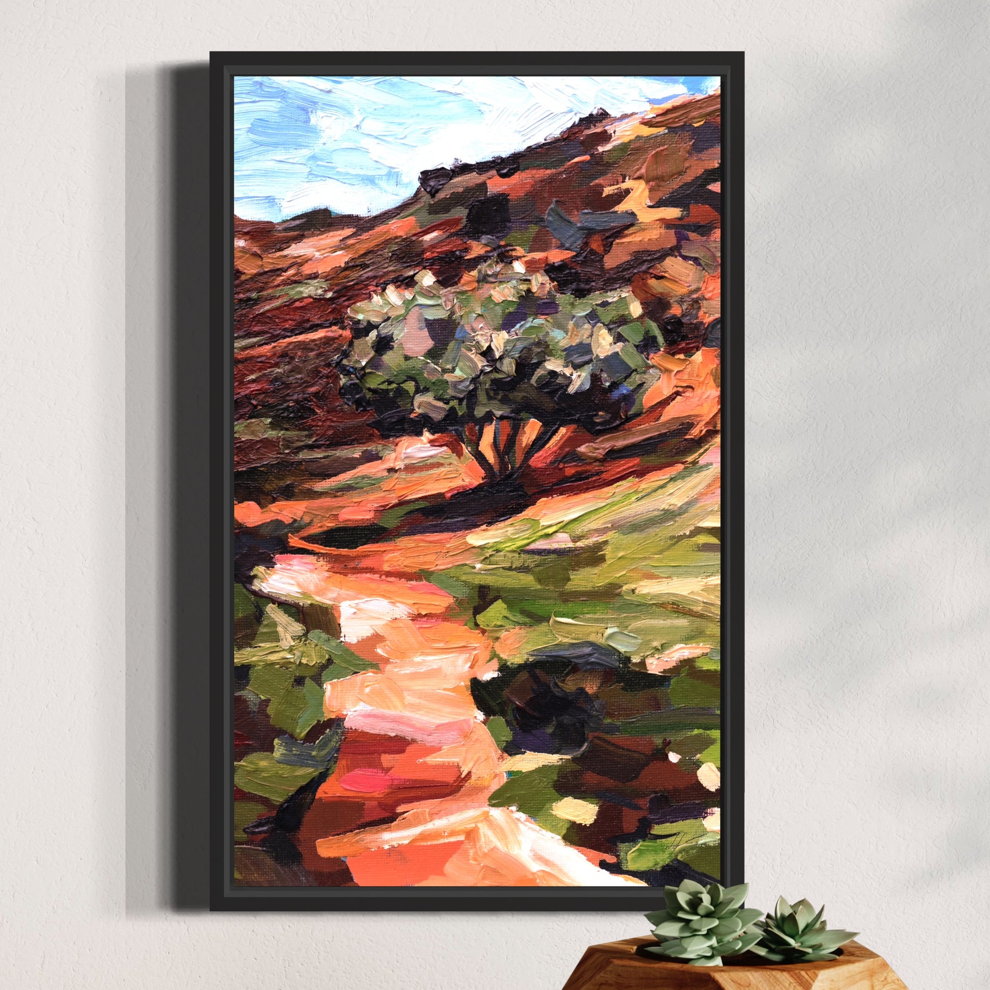 Inspired by one of my favorite hikes just 8 minutes from my home, I wanted to place the emphasis in the painting on the vertical dirt road unfolding before me. Interestingly, there was a small, almost hidden path behind the olive tree leading up the mountain that initially caught my eye.