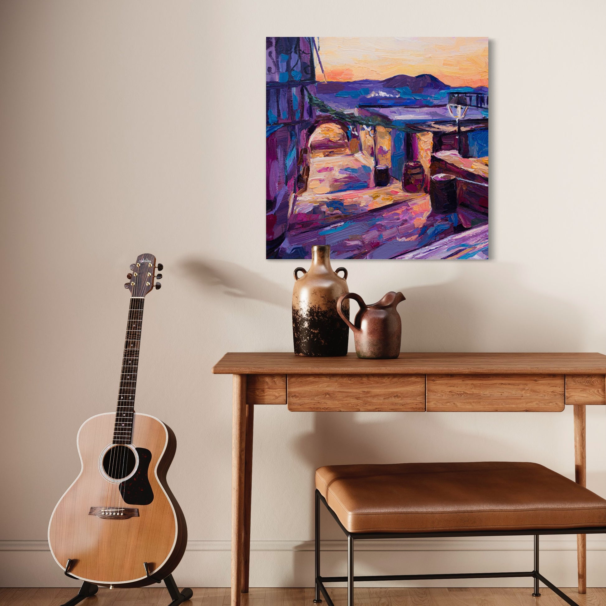 Enter into the painting and wander through the city's labyrinthine alleyways, their twisted paths revealing a magical tapestry of spirituality and history. Each brushstroke is carefully placed, aiming to capture the essence of this mystical city. The enchanting colors, reminiscent of a dreamy impressionist palette, bathe the scene in a soft glow. Hues of deep purples and velvety blues fuse with warm golden undertones, illuminating the winding streets and ancient stone buildings. The interplay of light and shadow creates an ethereal atmosphere, as if time stands still in this sacred haven.