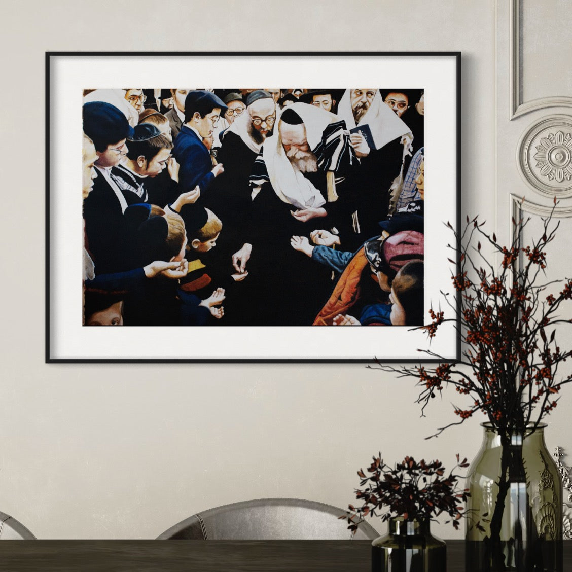 In the mesmerizing painting "Tzedoqah" by Pinchas Bensusan, the essence of the Lubavitcher Rebbe emanates with luminous intensity as he bestows blessings and charity upon the Jews gathered around him in the revered setting of 770, Crown Heights. The canvas vibrates with the palpable aura of devotion and love that envelops the Rebbe, drawing the viewer into the heart of this iconic scene. With masterful strokes, Bensusan captures not only the physical likeness of the Rebbe but also the spiritual gravity of his presence, evoking a sense of awe and love for the fellow jew. "Tzedoqah" stands as a poignant testament to the enduring legacy of the Lubavitcher Rebbe and his profound impact on world Jewry.
