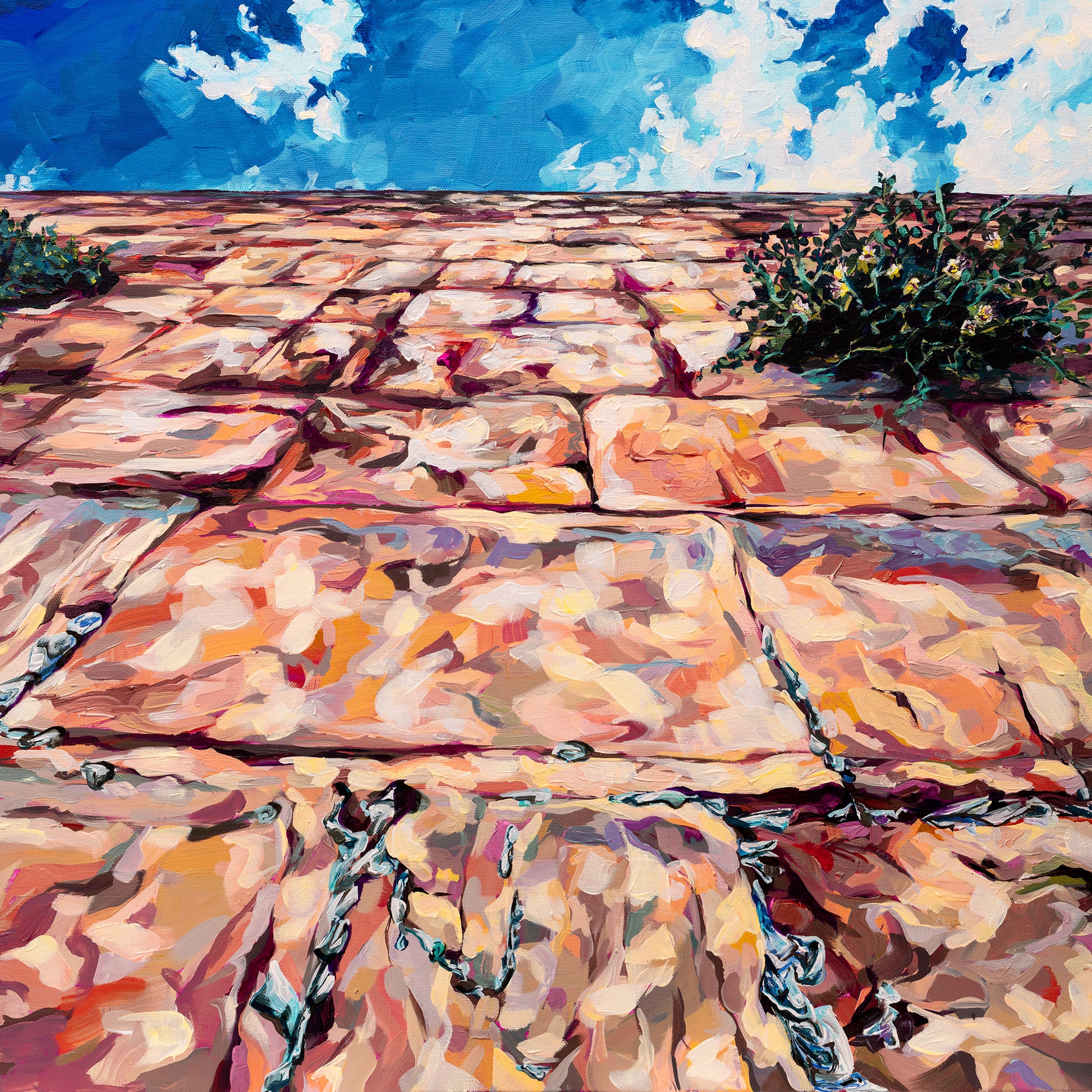 This is the third in my series of paintings exploring the Western Wall from the perspective of standing directly before it and looking up in at the Heavens above. The reference photo for this painting was taken from my visit this past on Rosh Chodesh Av. I hope the unique view point of this painting transports you to a moment of awe, wonder and surrender. Immerse yourself in one of holiest places in the world, where the Heavens kiss the Earth - gaze up with an open heart and connect.